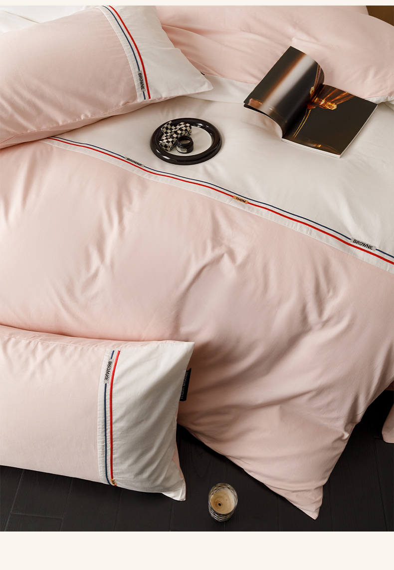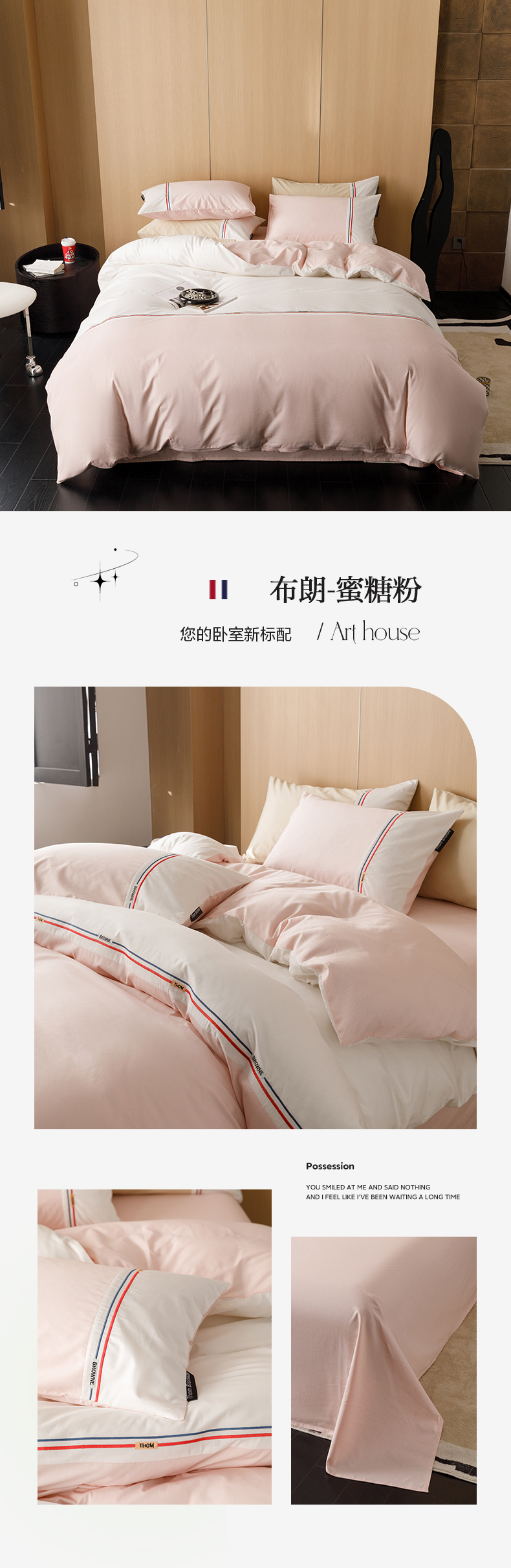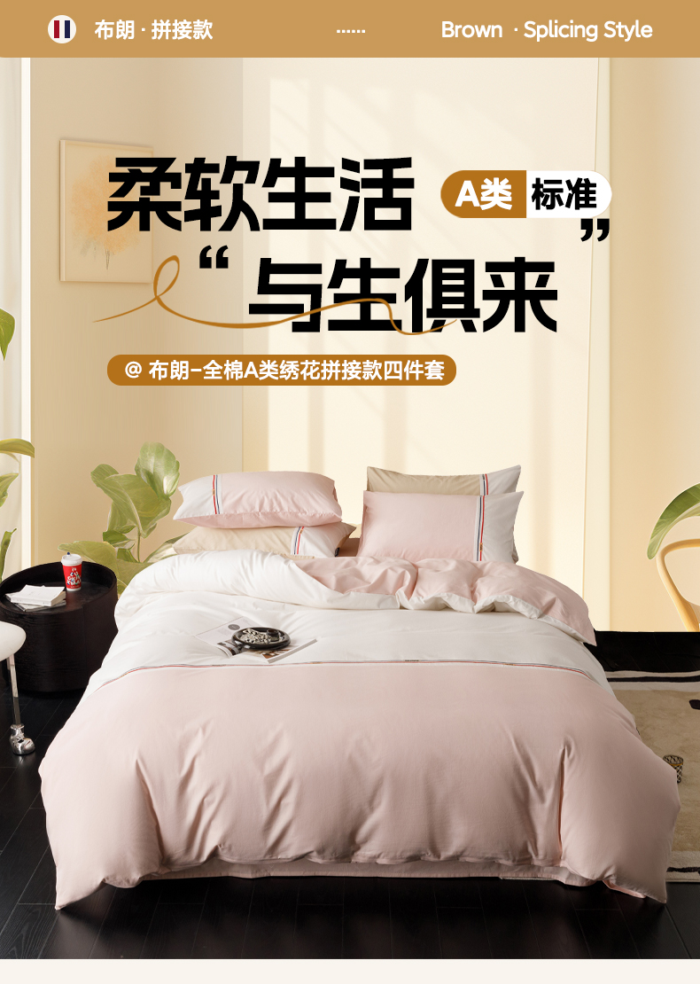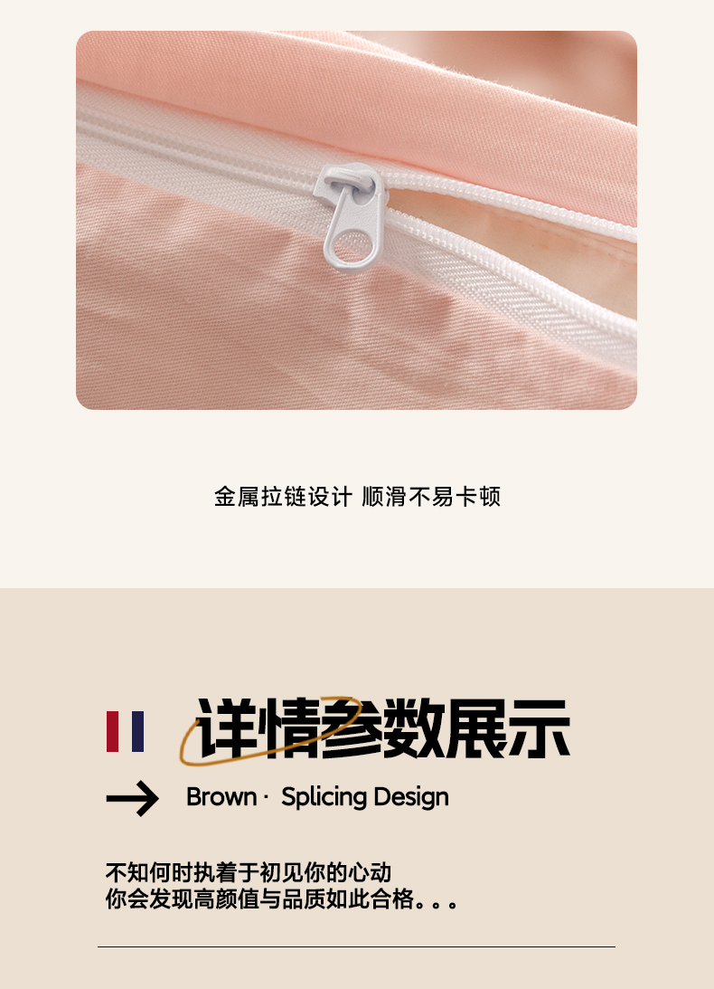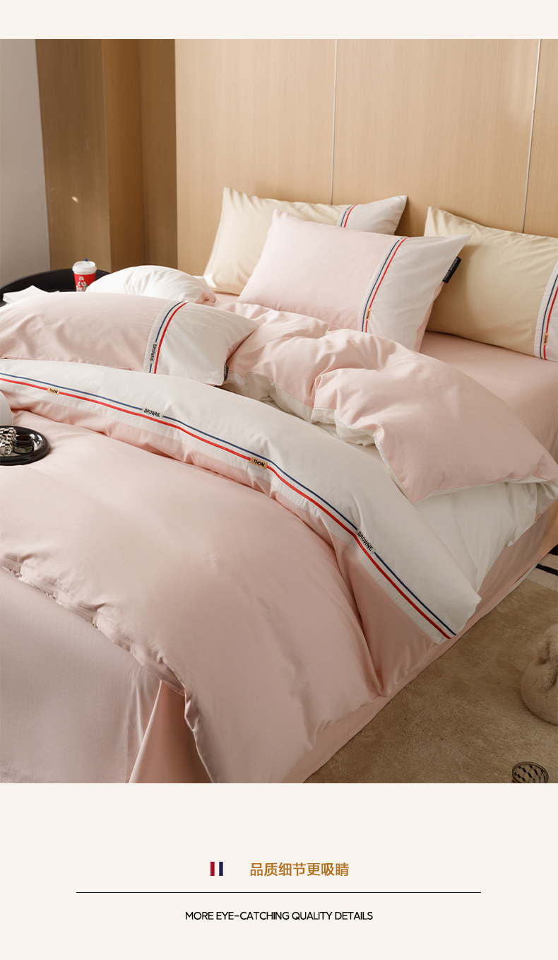 商品名称:卡巴伦家纺 2025新款全棉A类绣花拼接款四件套-布朗 布朗-蜜糖粉