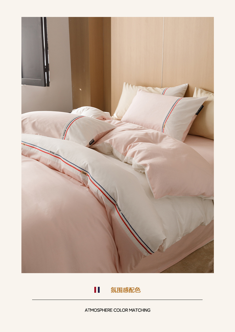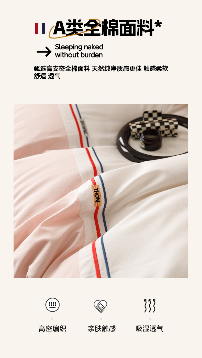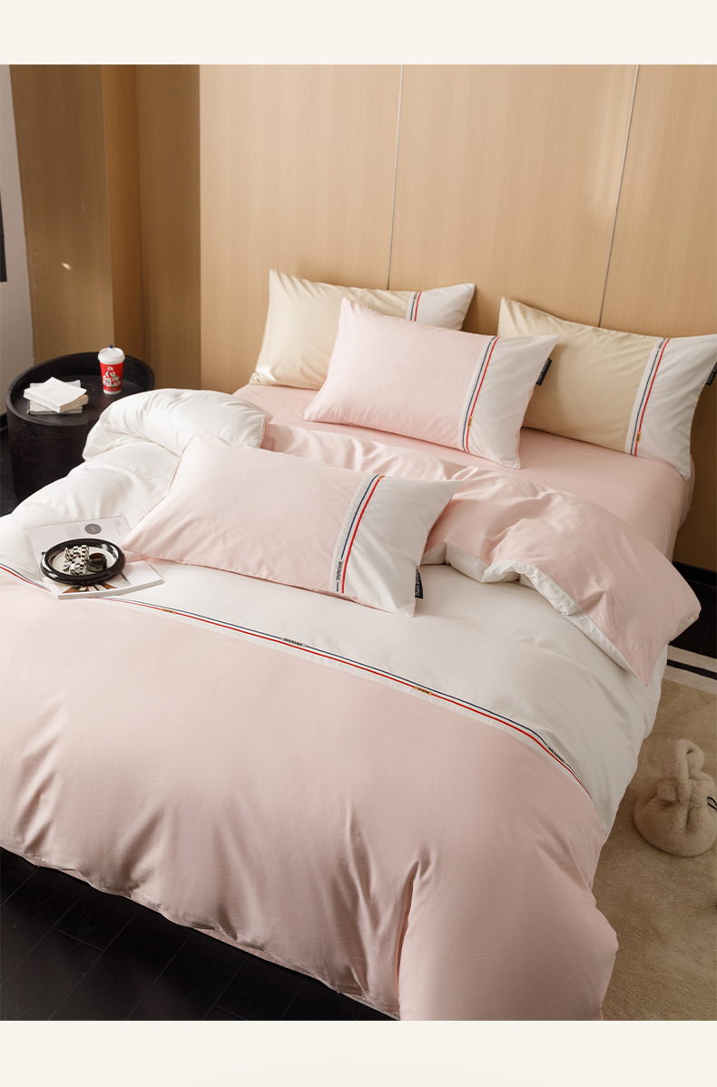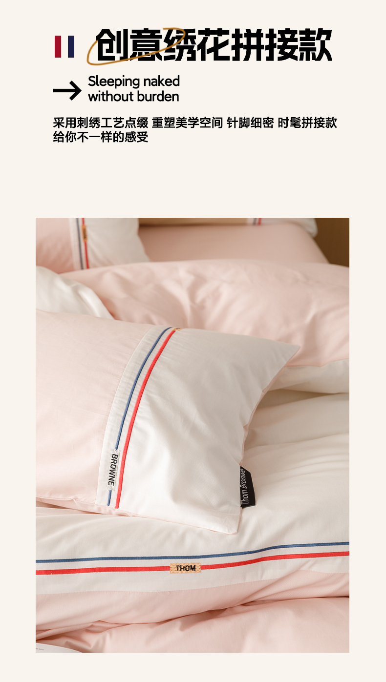 卡巴伦家纺 2025新款全棉A类绣花拼接款四件套-布朗 布朗-蜜糖粉