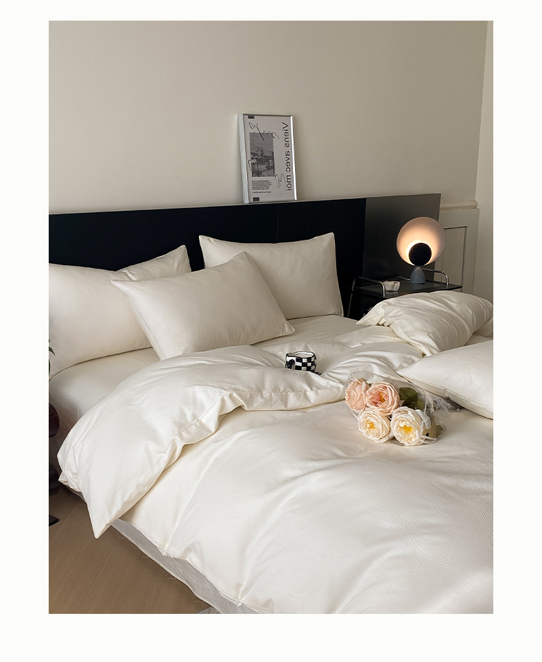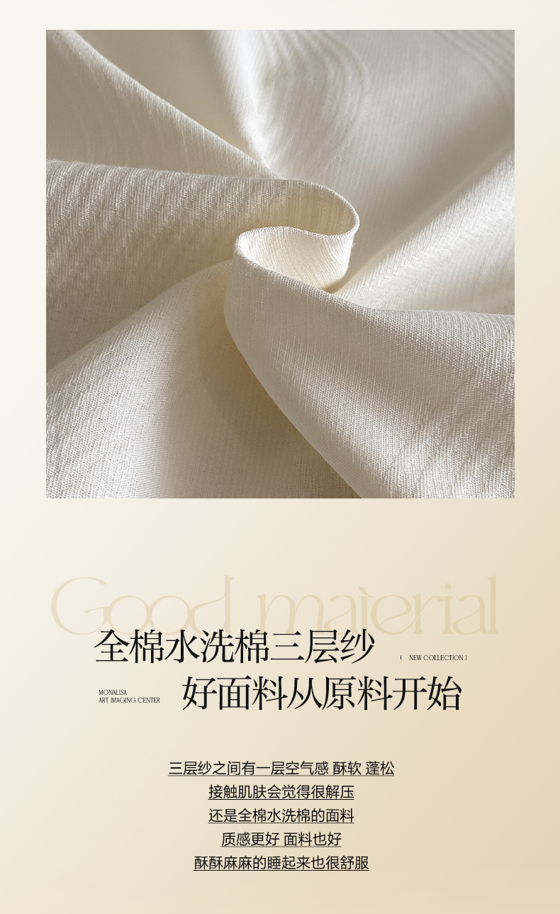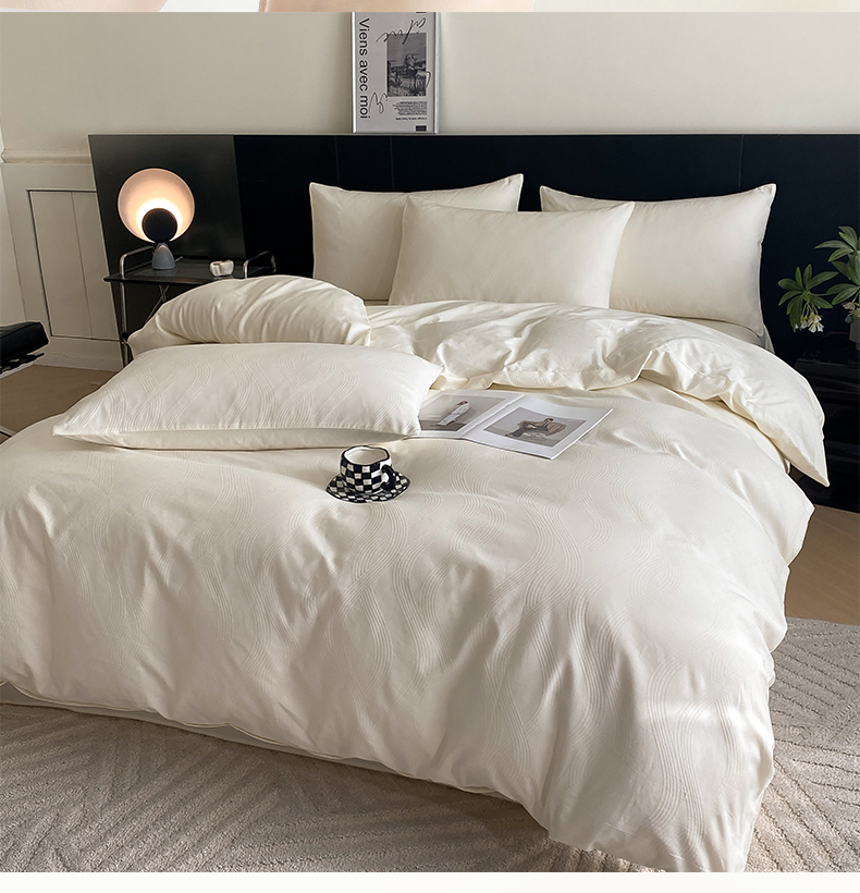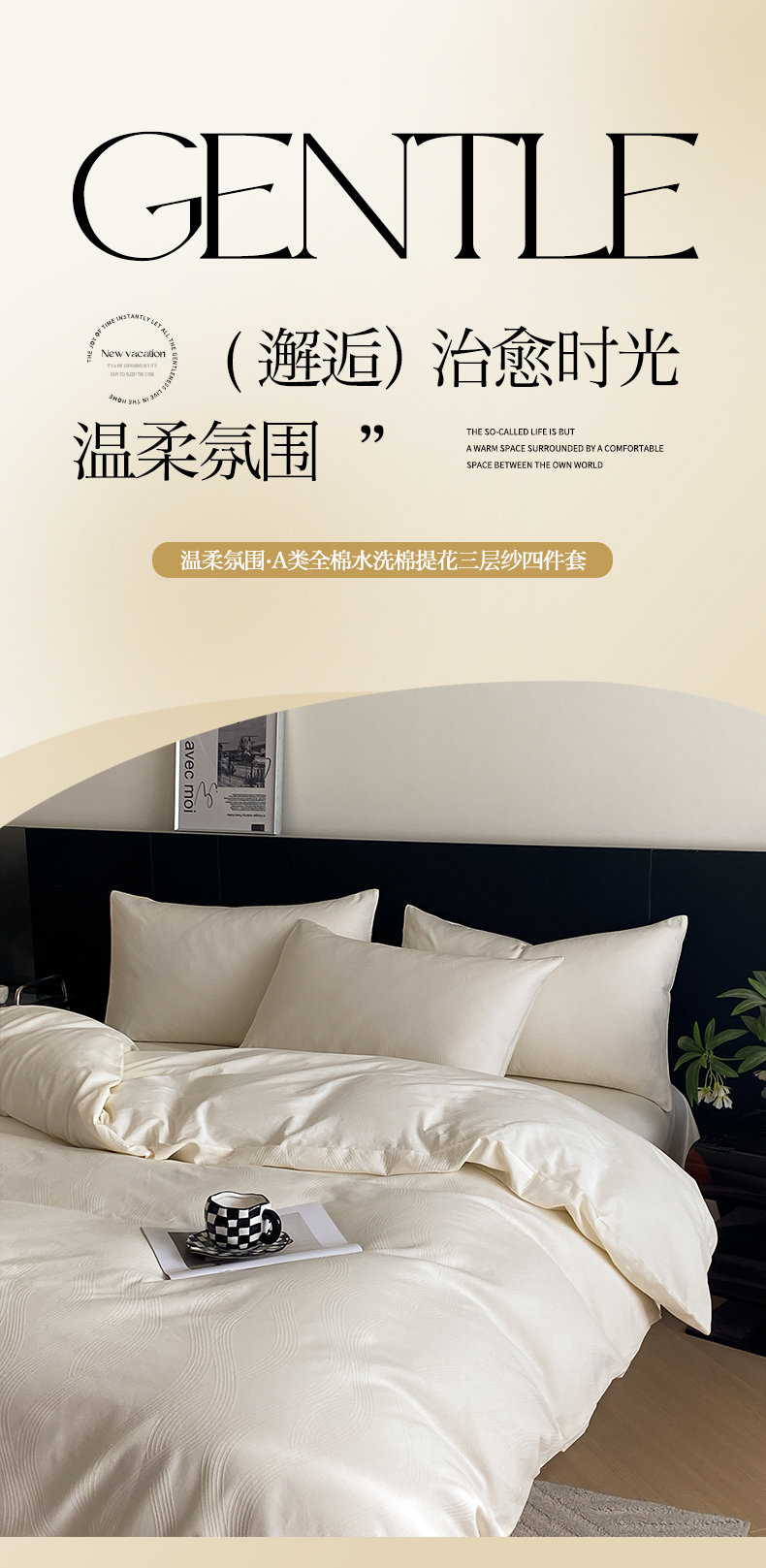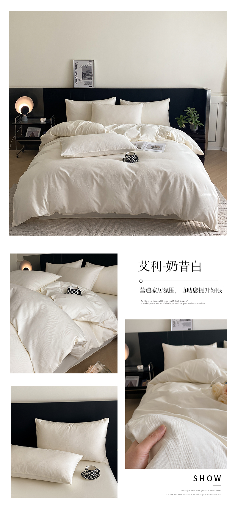 当前位置: 91家纺网 > 商品网购 > 床品套件 > 四件套 > 全棉普通四件套 > 莱登卡奴 2024新款全棉A类水洗棉提花三层纱四件套 艾利-奶昔白