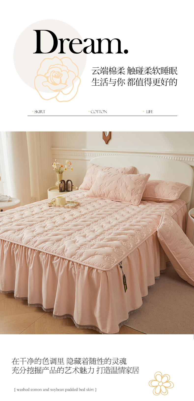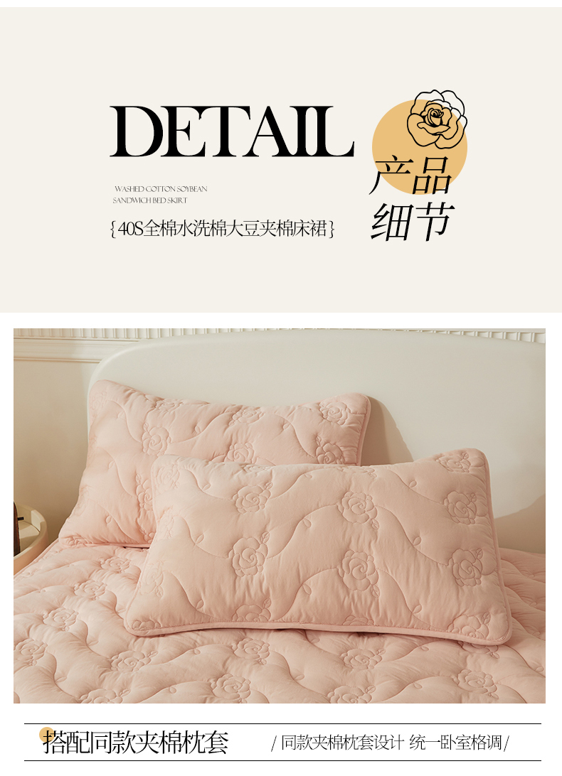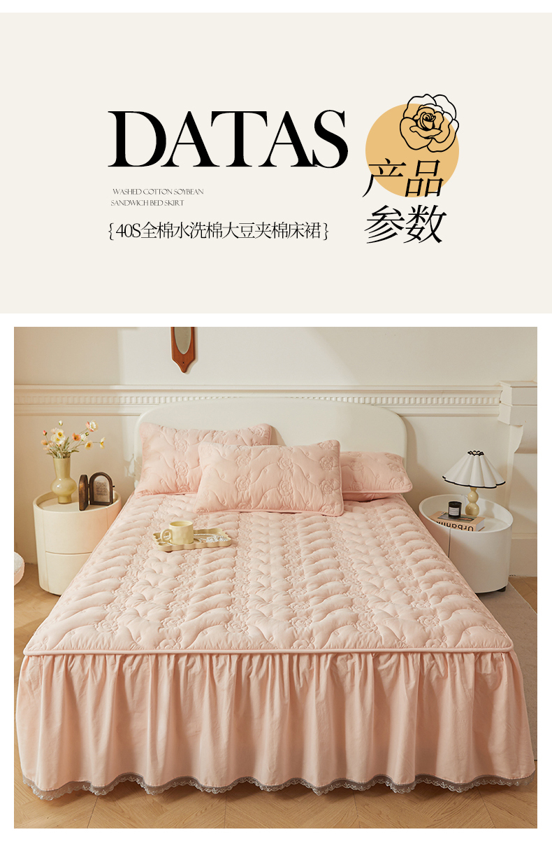 商品名称:3C 2024新款玫瑰全棉水洗棉大豆夹棉床裙 典雅玉