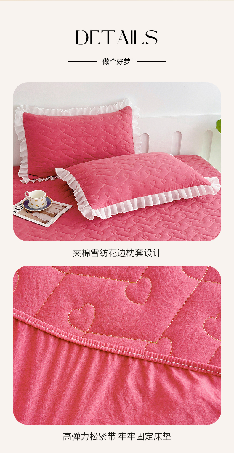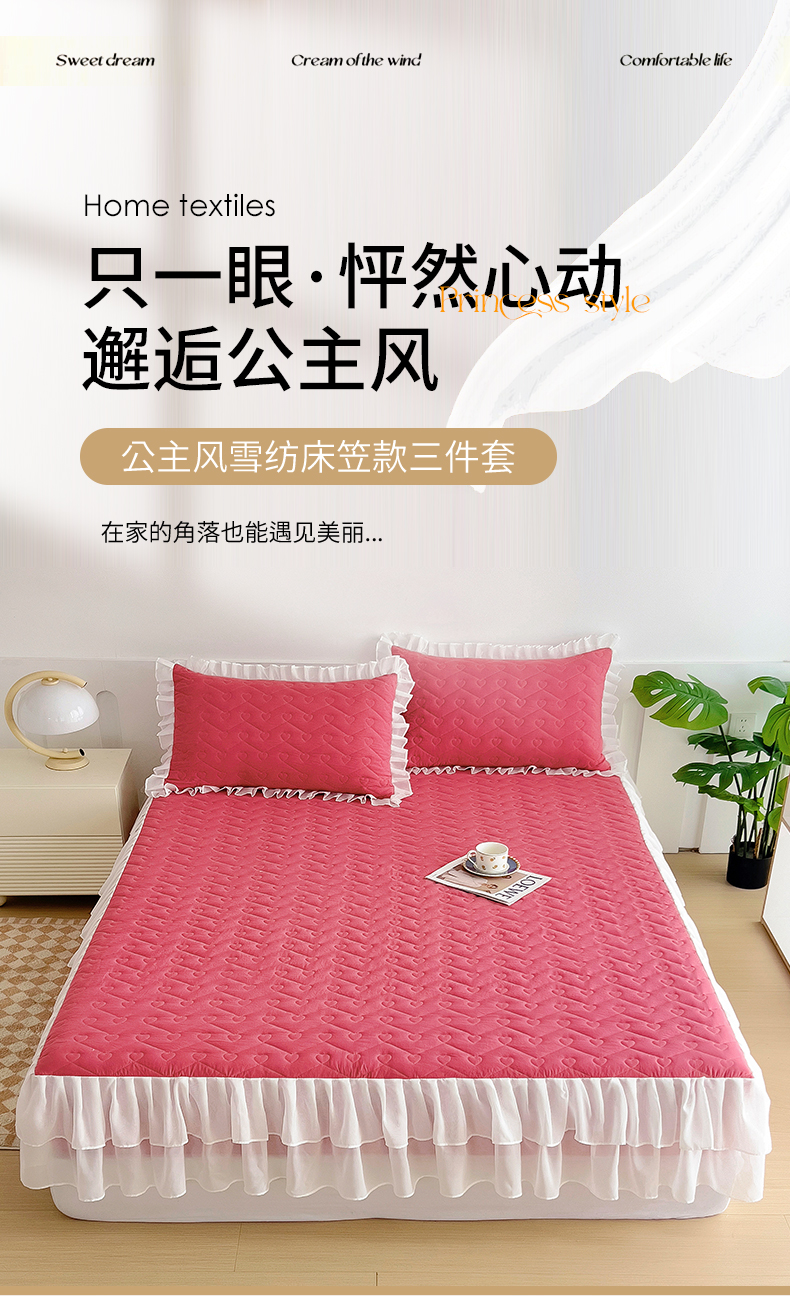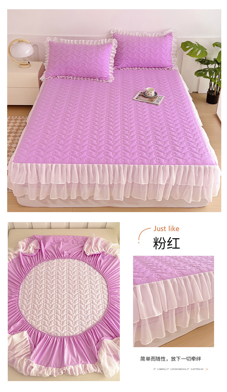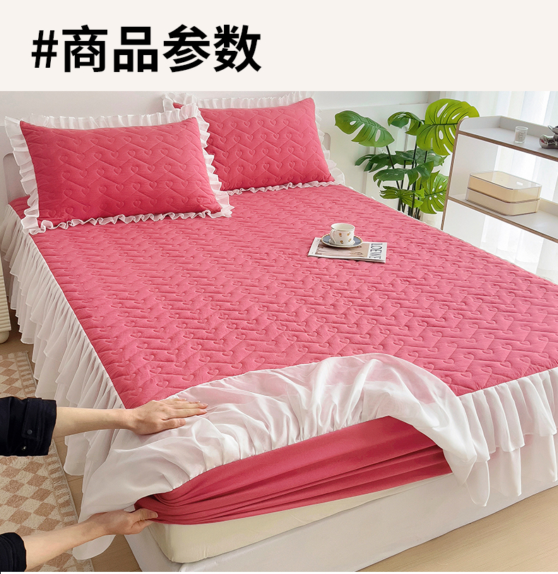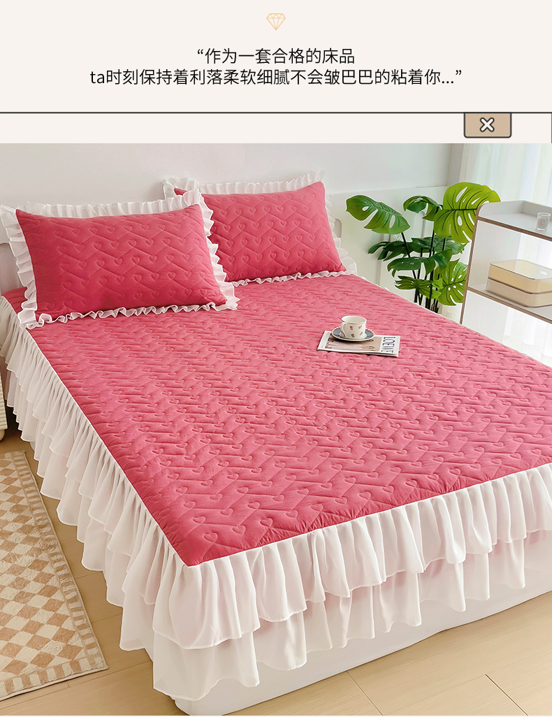 (总)屹成家纺2025新款水晶绒夹棉绗缝蕾丝床裙三件套(塞纳河畔)床裙单件起售价不低于105元,大红,豆沙,翡翠绿,粉玉,橄榄绿,蔚蓝,银灰