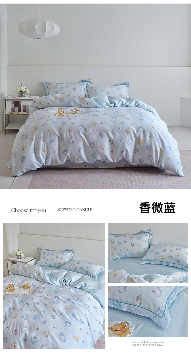 商品名称:氧家 2025新款莱赛尔天丝数码印花四件套宽边断角工艺(礼盒装)香微蓝