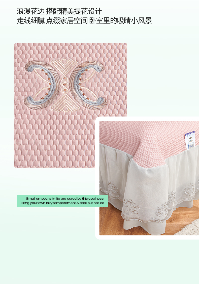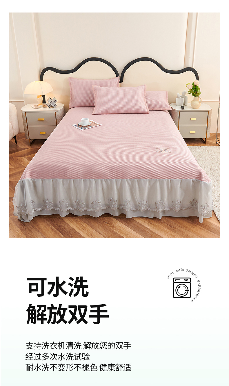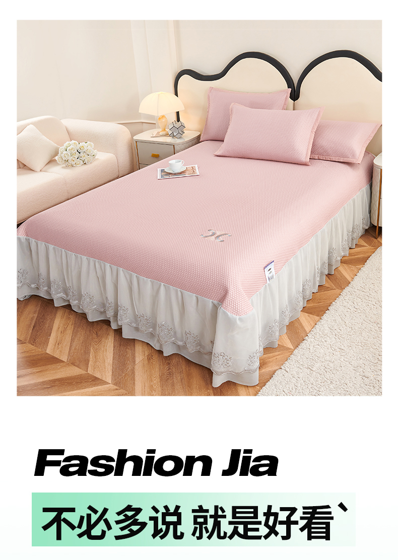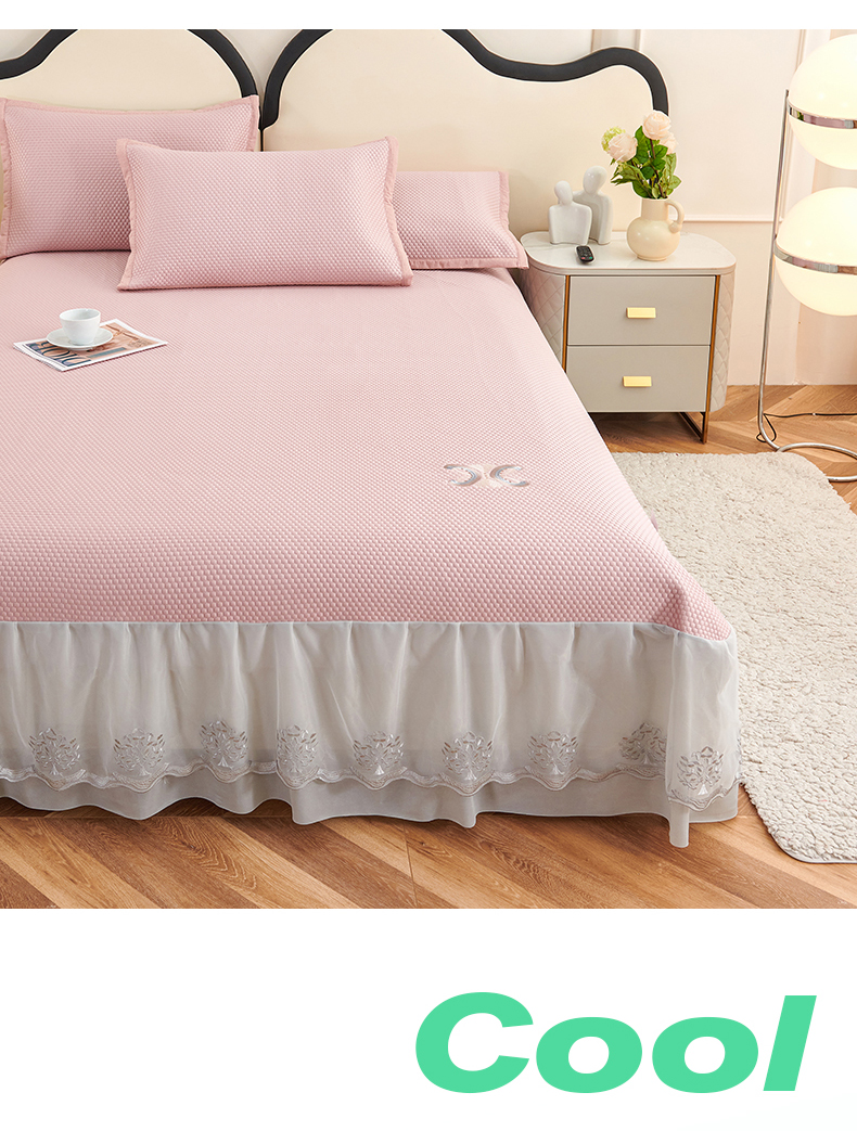 商品名称:宜派家纺 2024新款雪花冷感席三件套床裙款 凤尾-粉