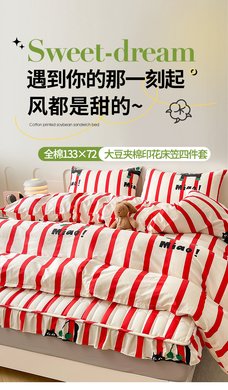 • 91家纺网 家纺一手货源 找家纺 3C 2024新款全棉13372大豆夹棉印花花边床笠四件套 黑猫警长单床笠