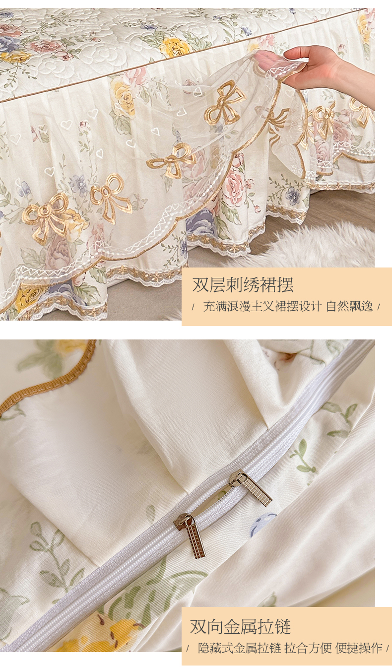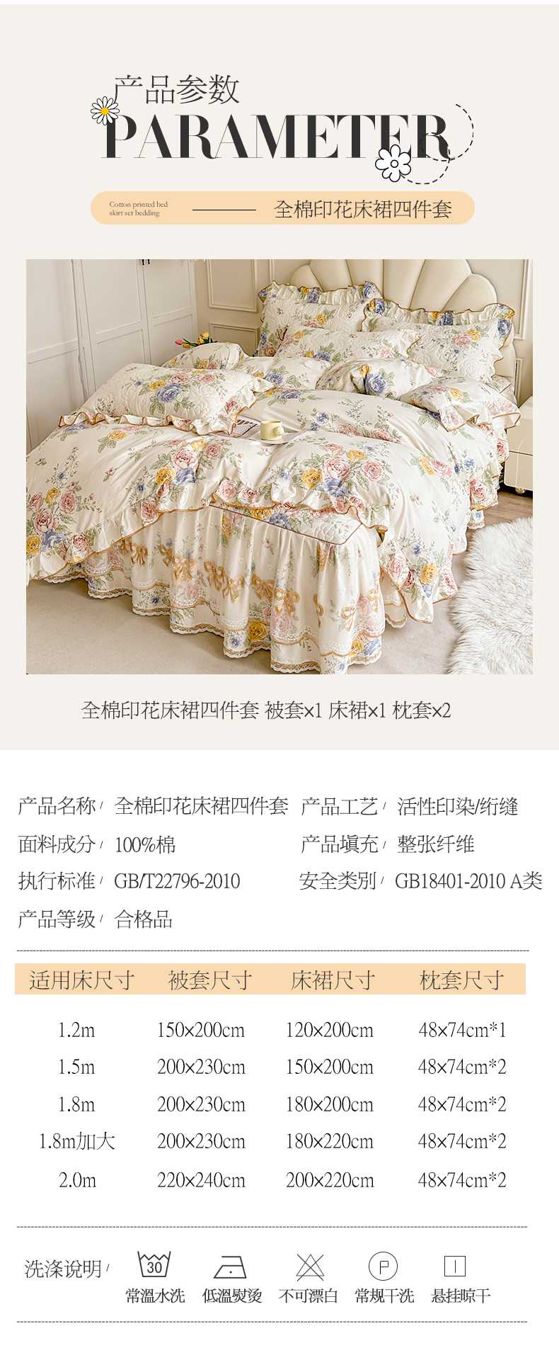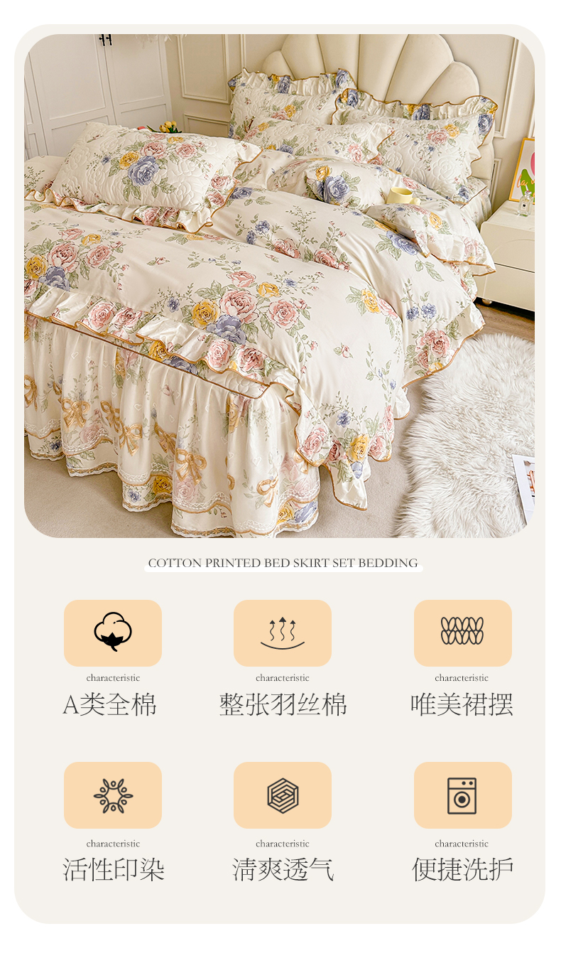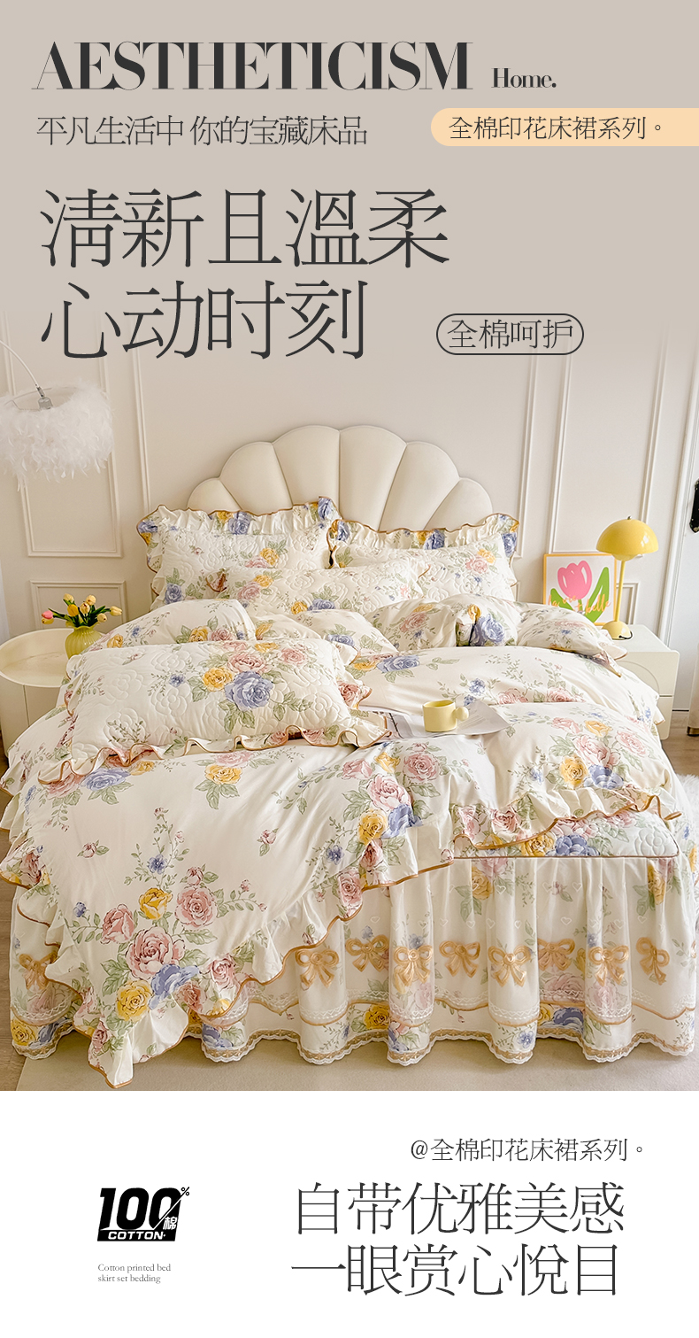 当前位置: 91家纺网 > 商品网购 > 床品套件 > 四件套 > 全棉普通四件套 > 宜凡家纺 2024新款全棉印花公主风夹棉床裙四件套 春风沐歌