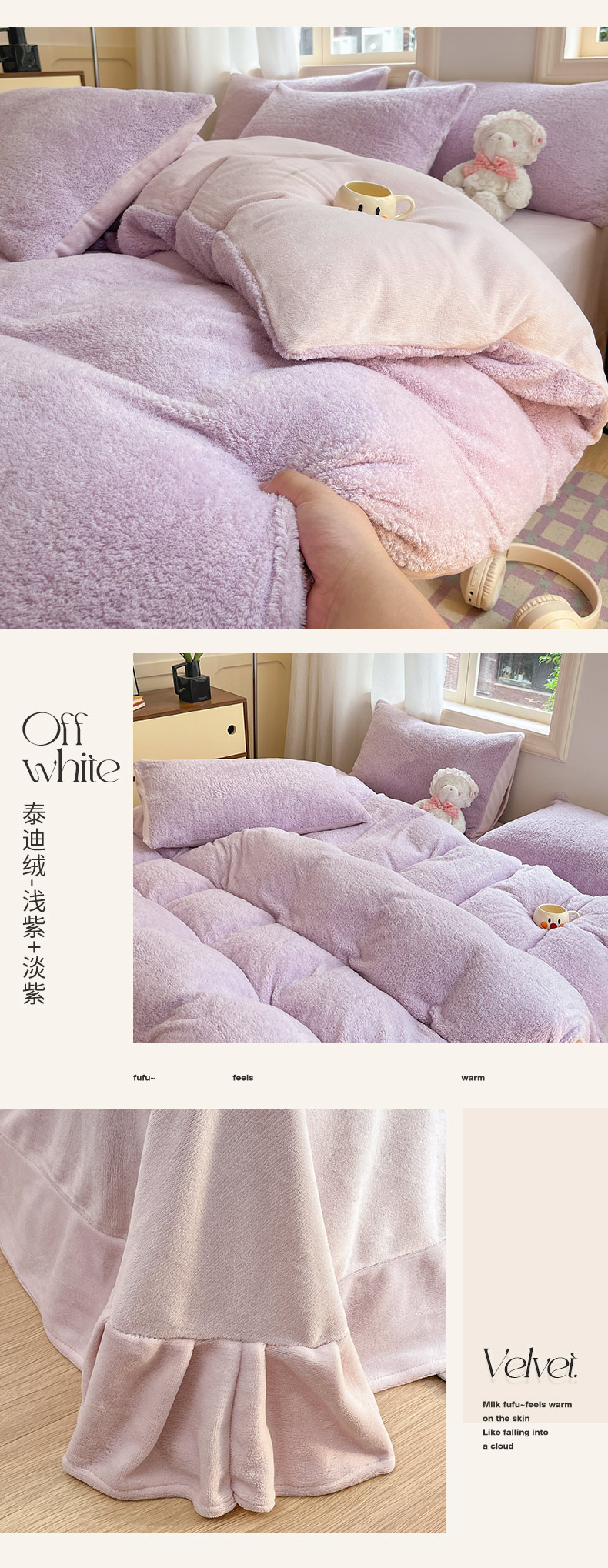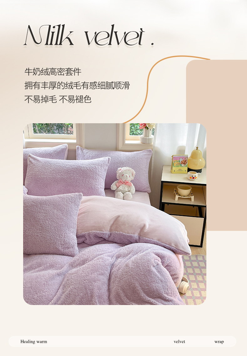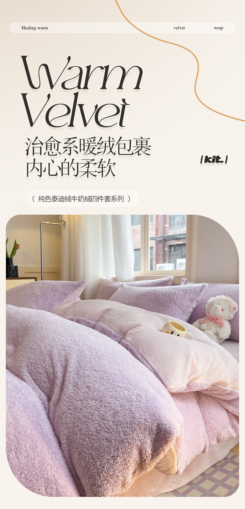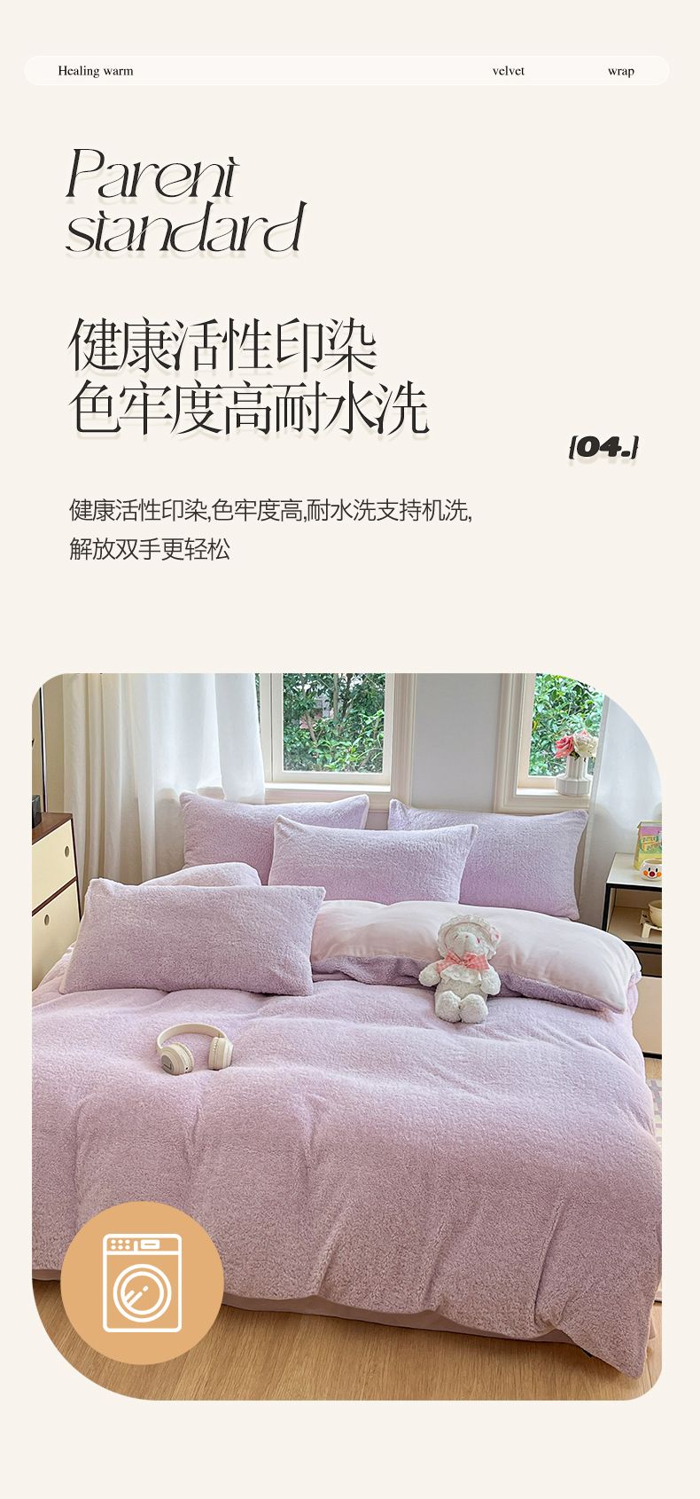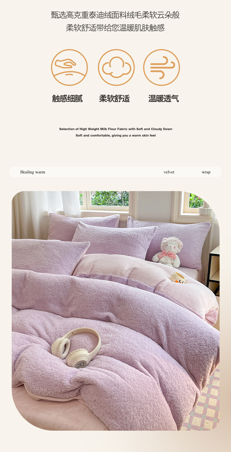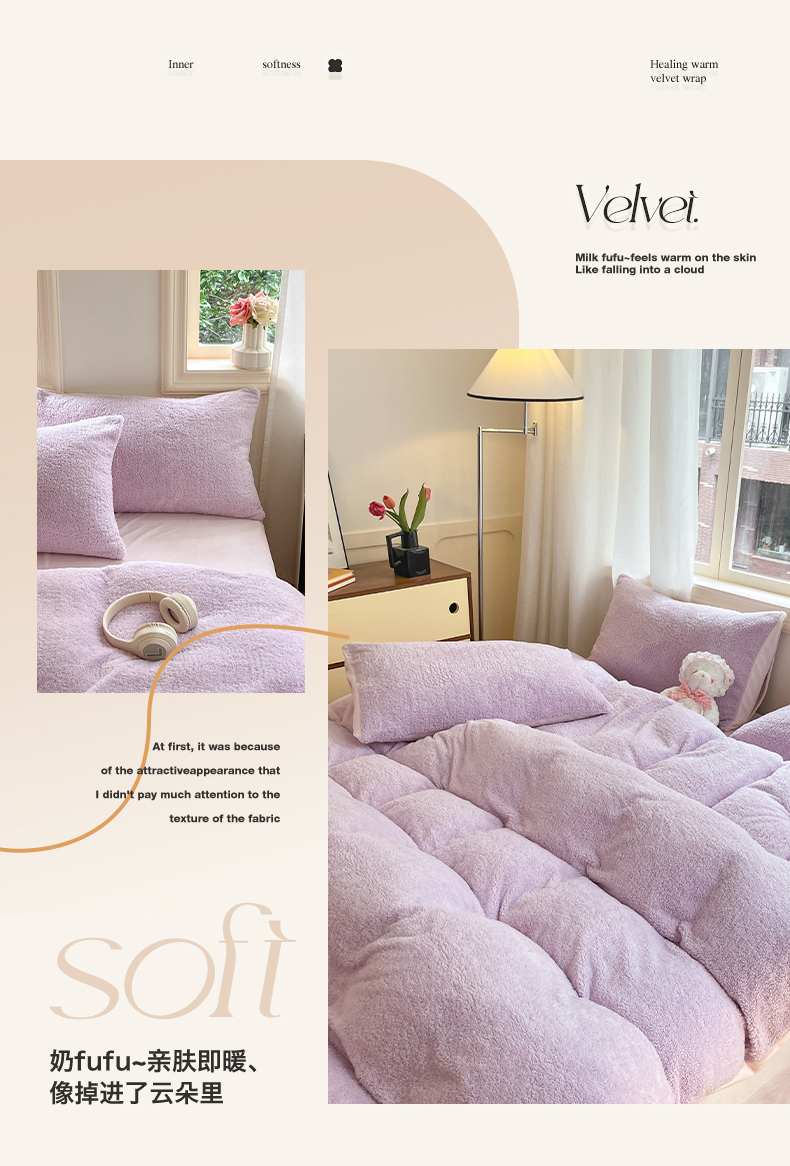 商品名称:绘萱家居 2024新款高克重泰迪绒纯色牛奶绒四件套双拼法莱绒珊瑚绒 泰迪绒-浅紫+淡紫