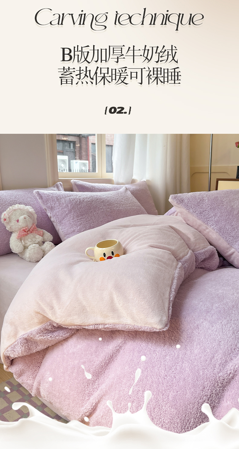 绘萱家居 2024新款高克重泰迪绒纯色牛奶绒四件套双拼法莱绒珊瑚绒 泰迪绒-浅紫+淡紫