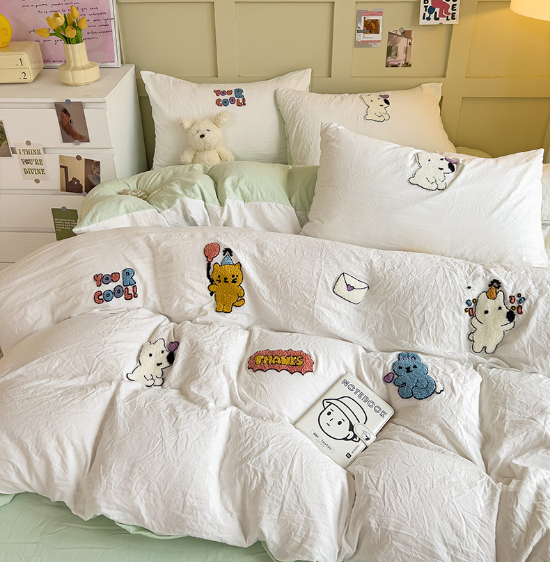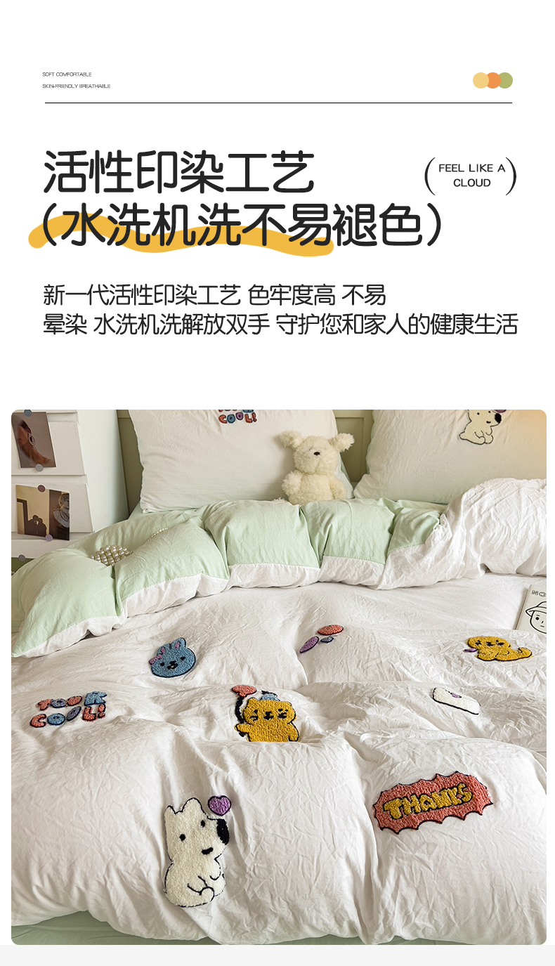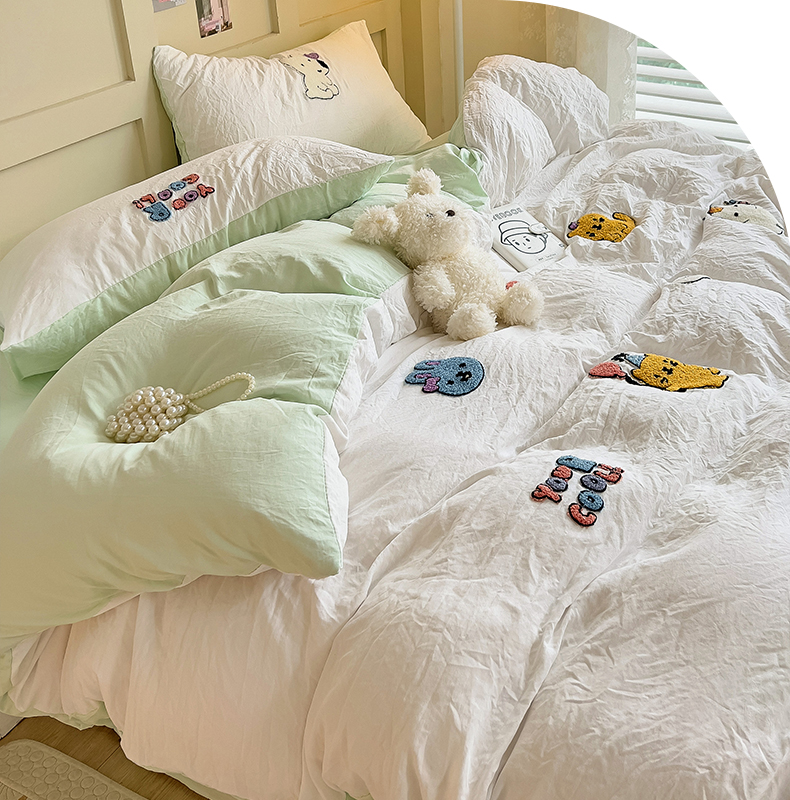 当前位置: 91家纺网 > 商品网购 > 床品套件 > 四件套 > 水洗棉四件套 > 韩巢家纺 2024新款四季通用超柔水洗棉毛巾绣四件套-动物乐园系列(提供卖家秀) 动物乐园白绿