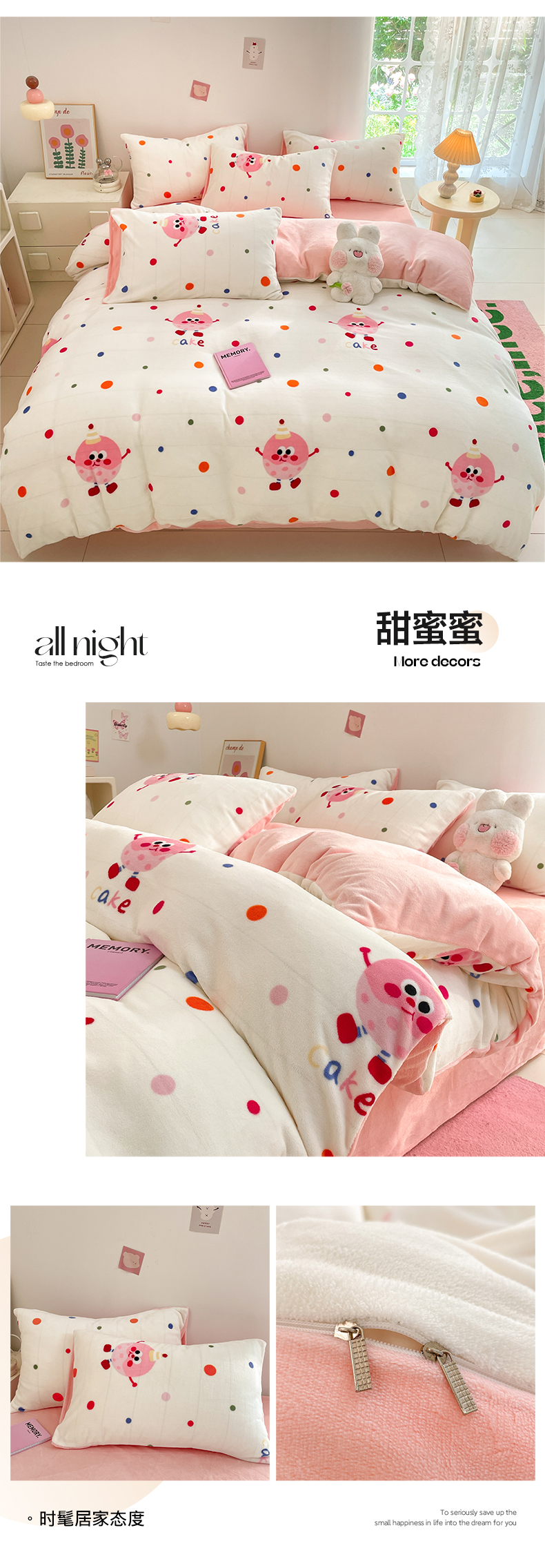 当前位置: 91家纺网 > 商品网购 > 床品套件 > 四件套 > 牛奶绒四件套 > 莱米家纺 2024新款7斤重牛奶绒卡通小版四件套系列 甜蜜蜜