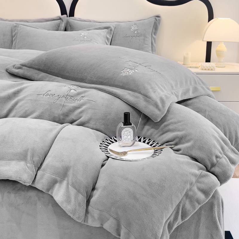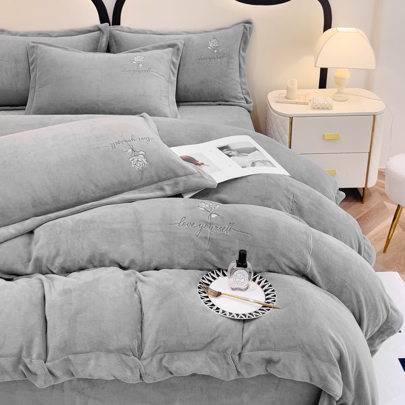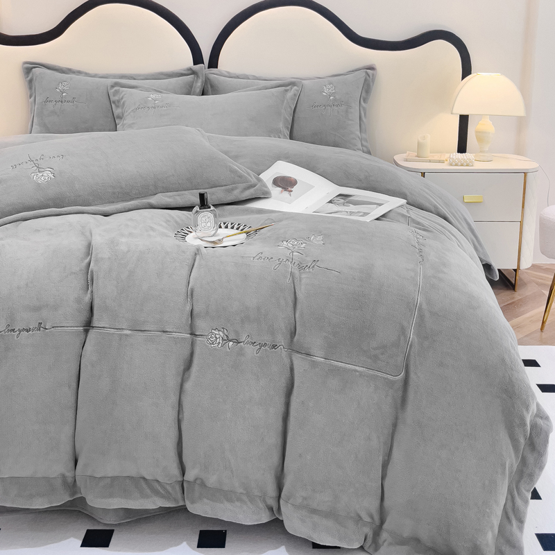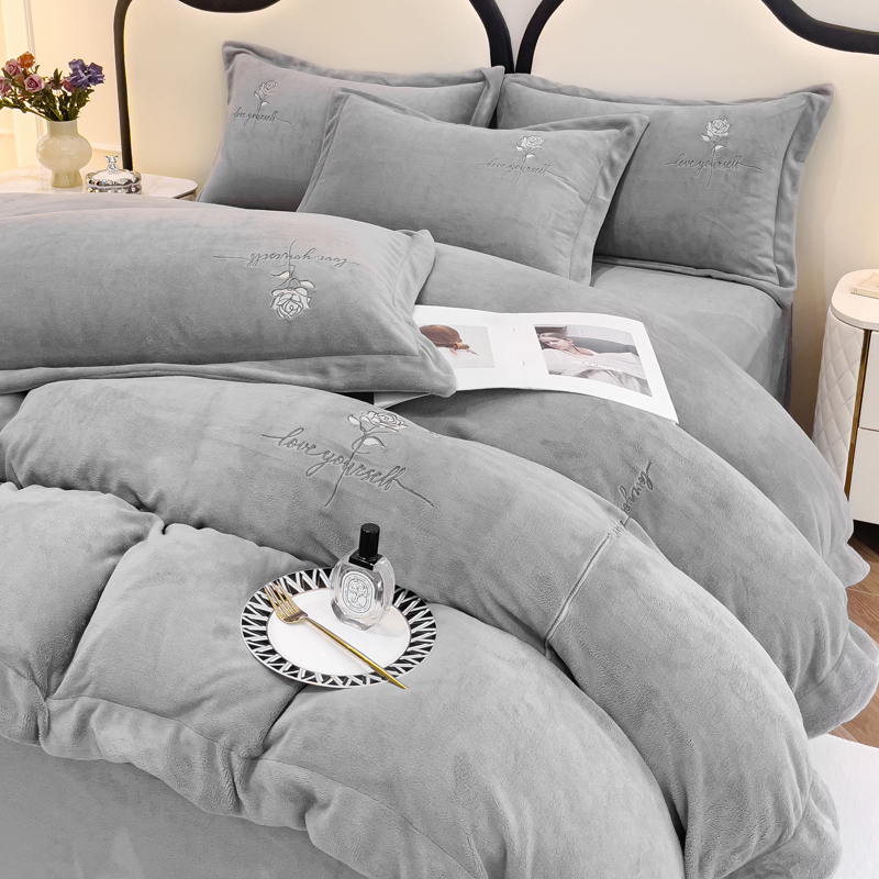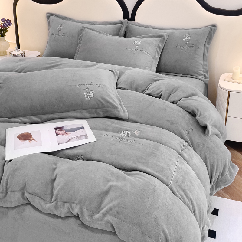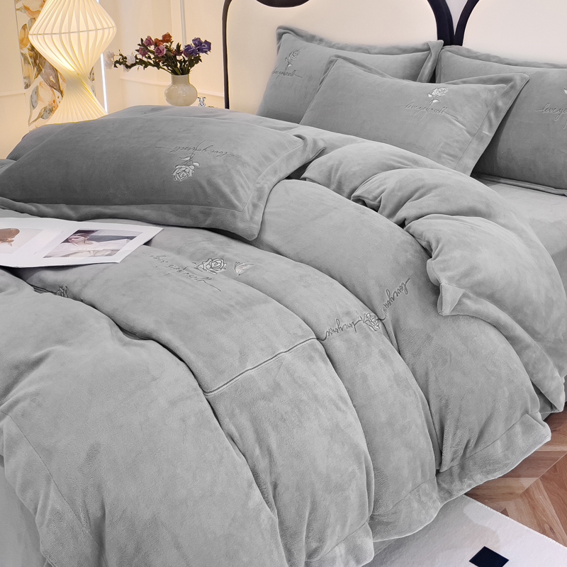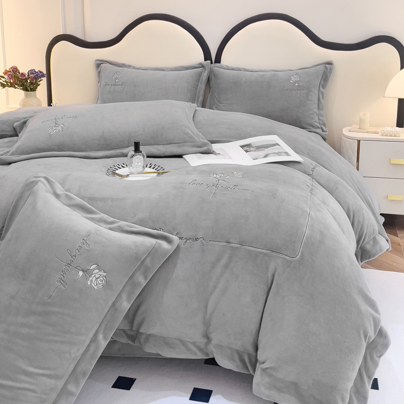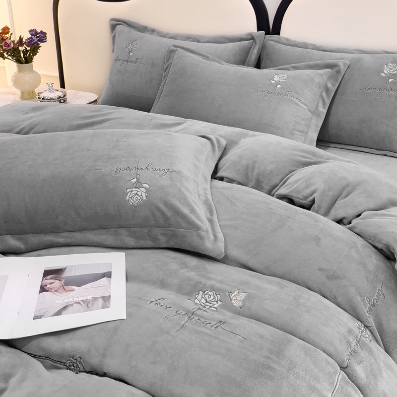 商品名称:八方汇(一户被芯生活馆) 2024新款加厚牛奶绒轻奢花卉刺绣四件套-玫瑰庄园 灰