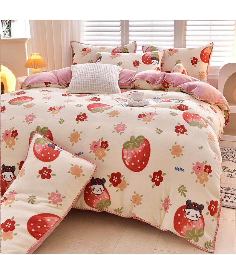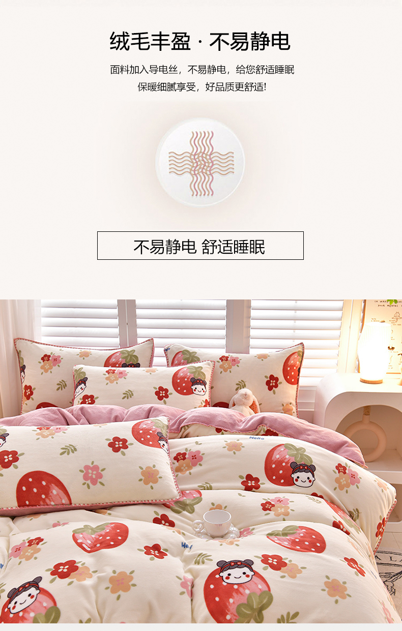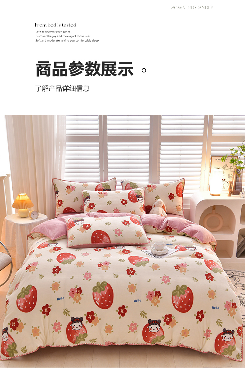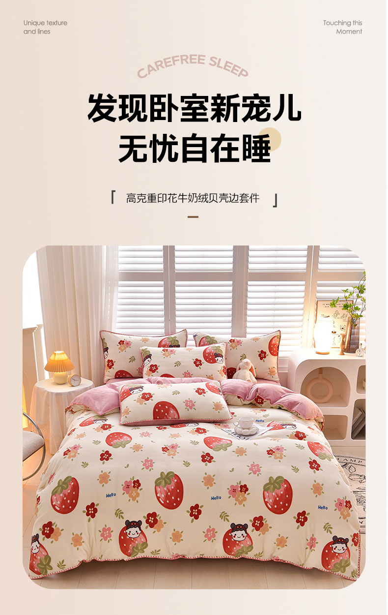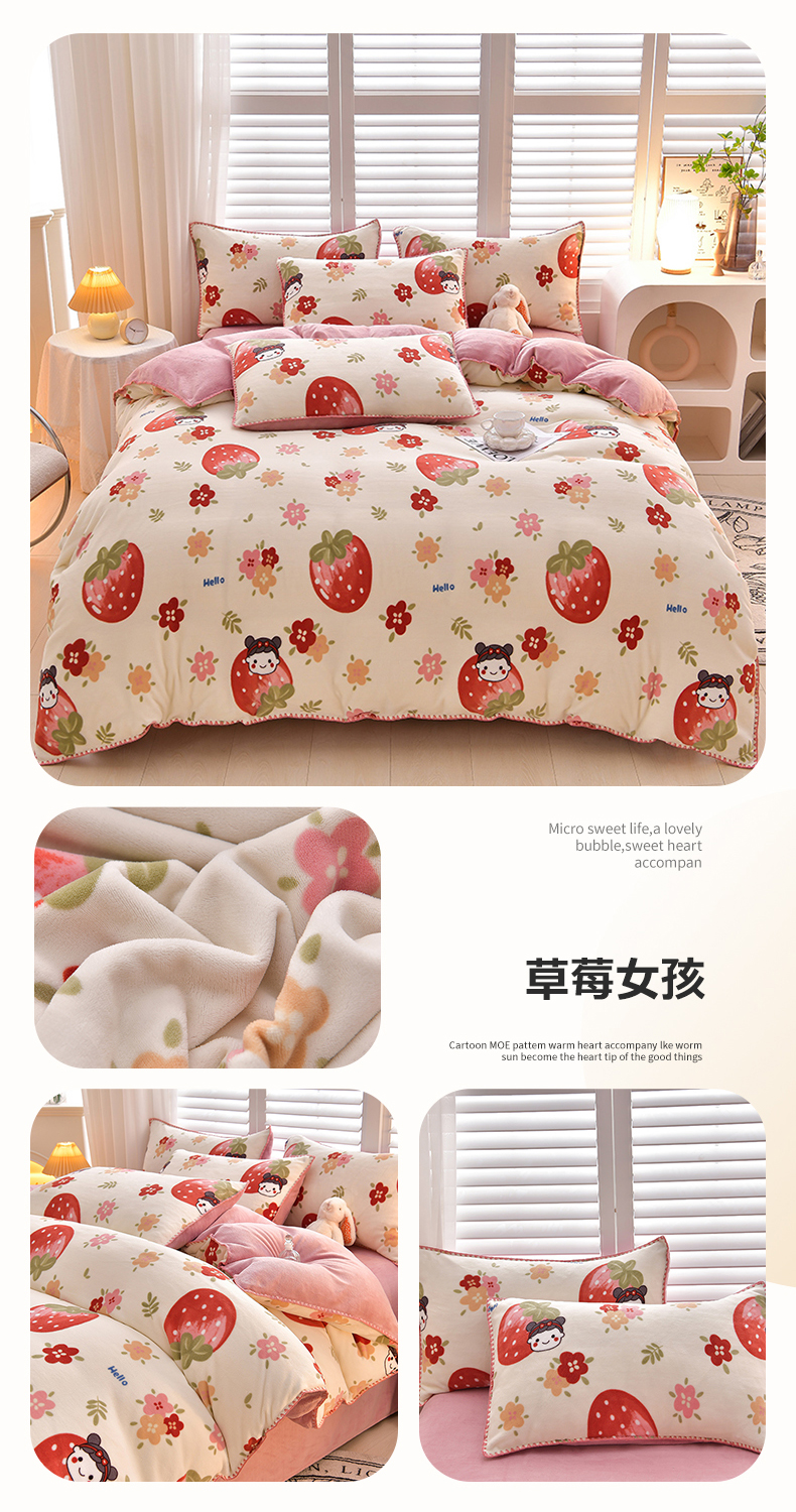 当前位置: 91家纺网 > 商品网购 > 床品套件 > 四件套 > 牛奶绒四件套 > 菡宝 2024新款高克重印花贝壳边牛奶绒四件套 草莓女孩
