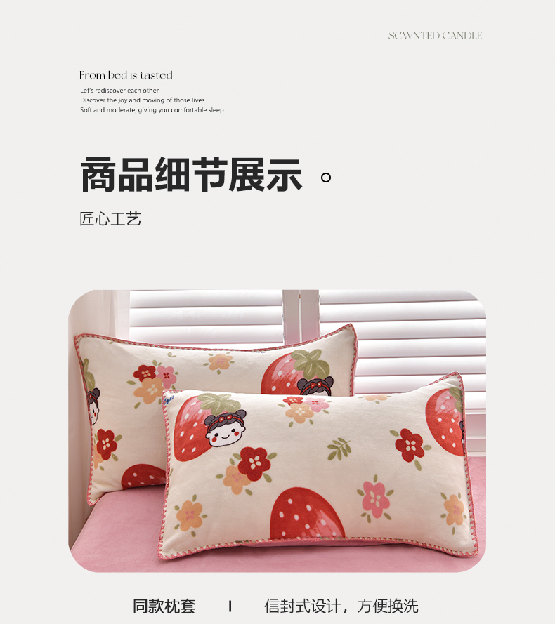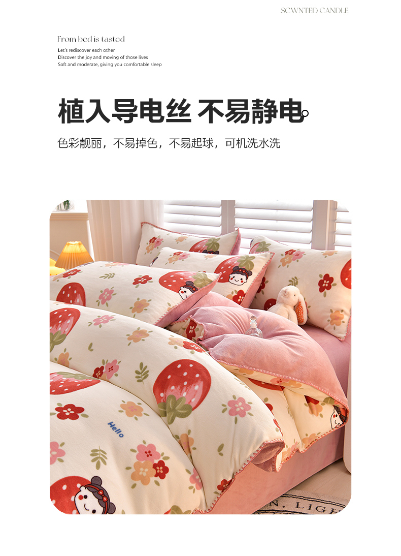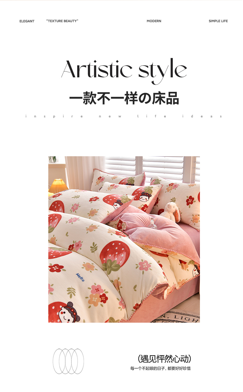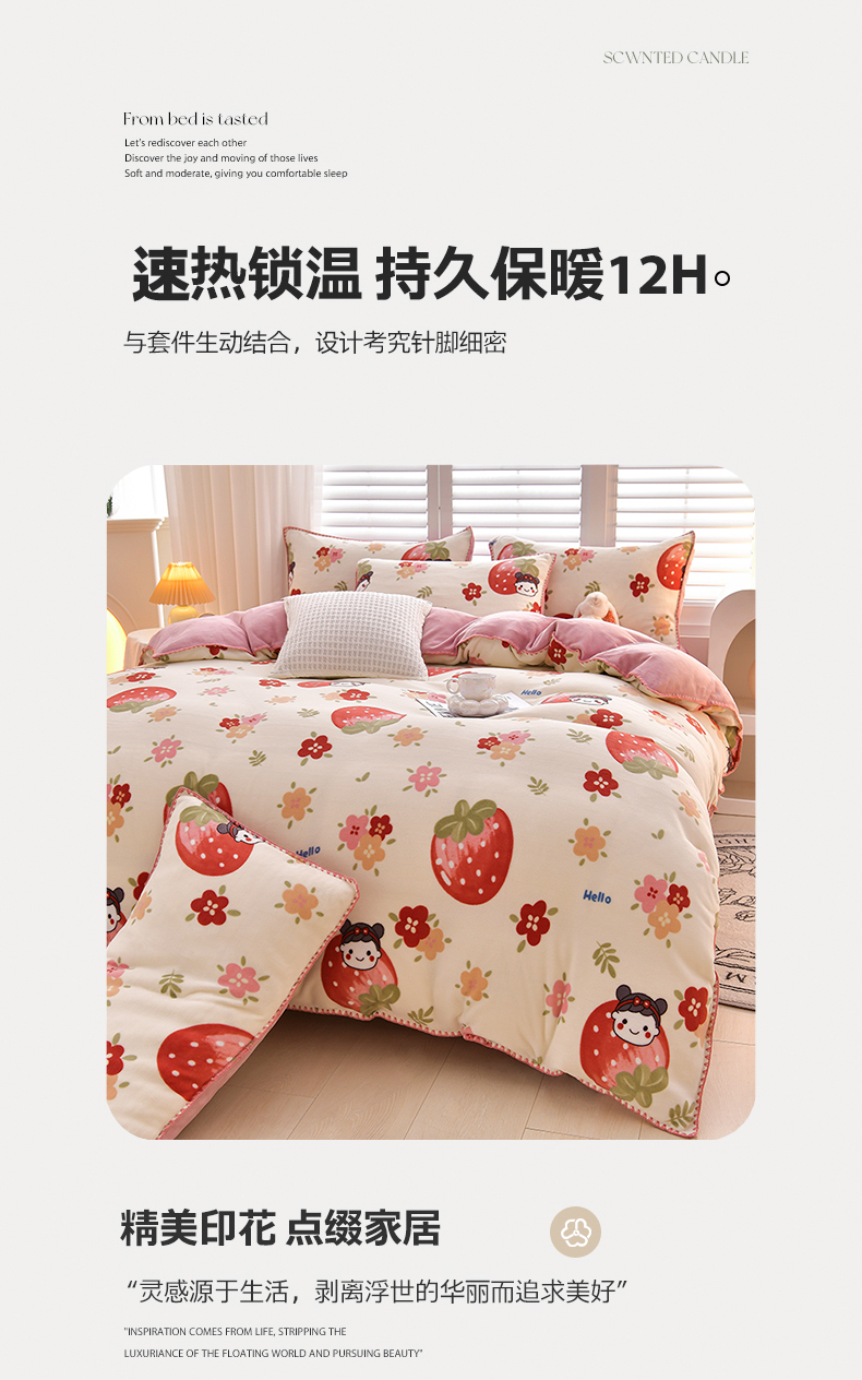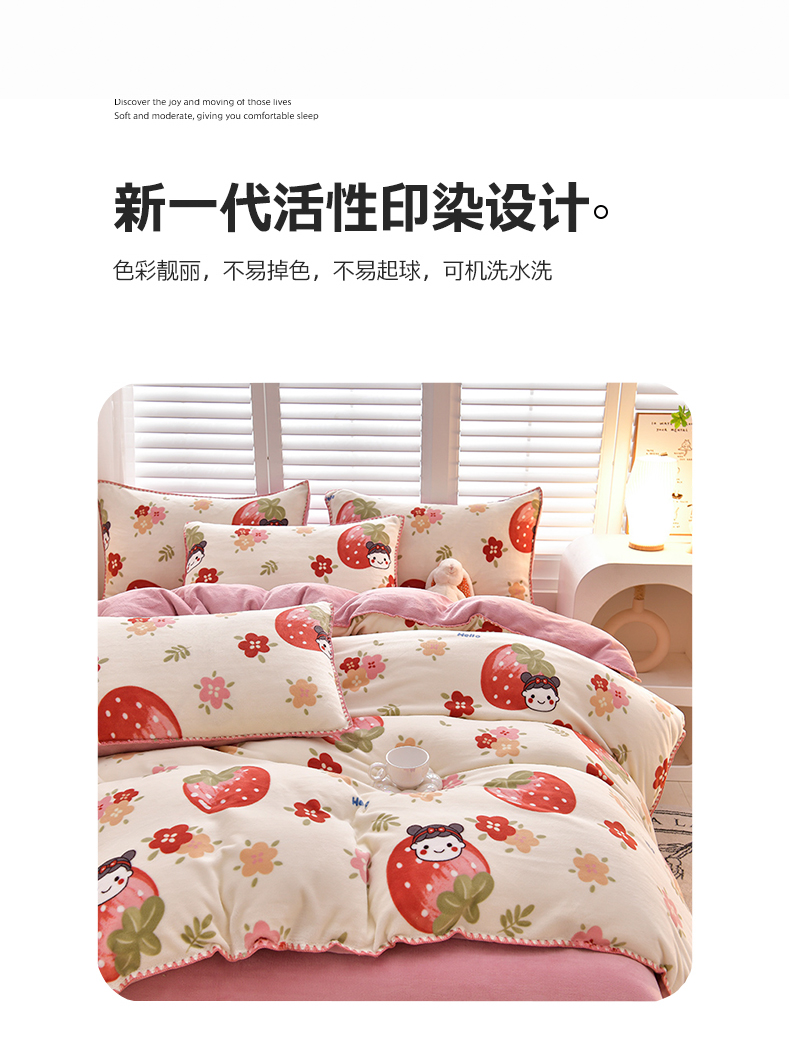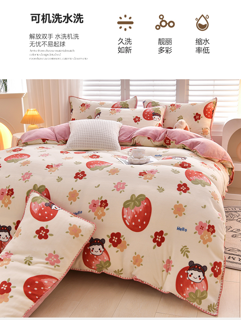 当前位置: 91家纺网 > 商品网购 > 床品套件 > 四件套 > 牛奶绒四件套 > 菡宝 2024新款高克重印花贝壳边牛奶绒四件套 草莓女孩