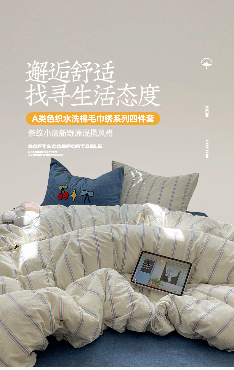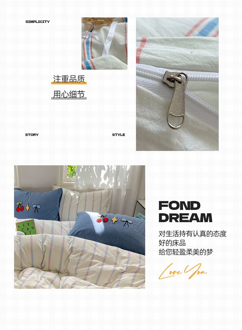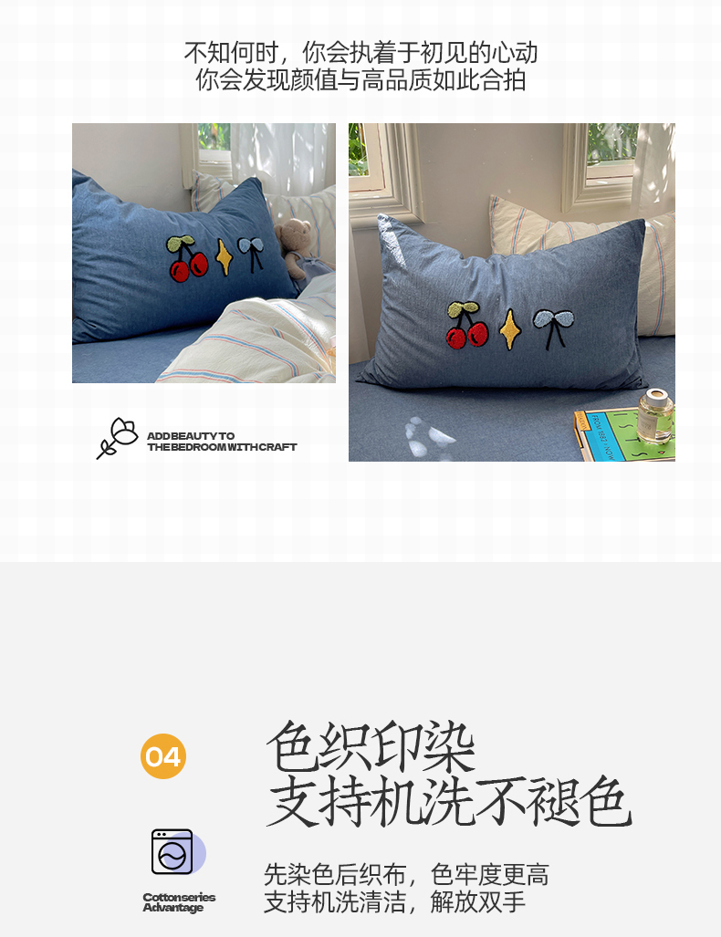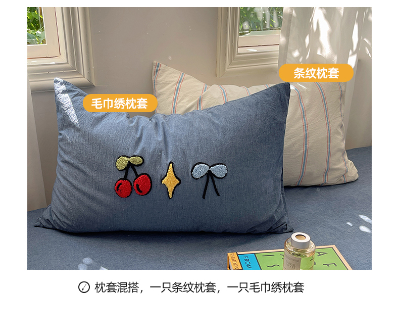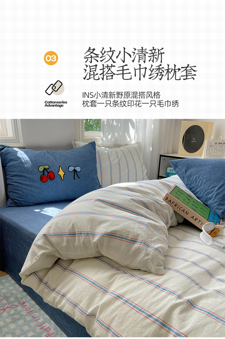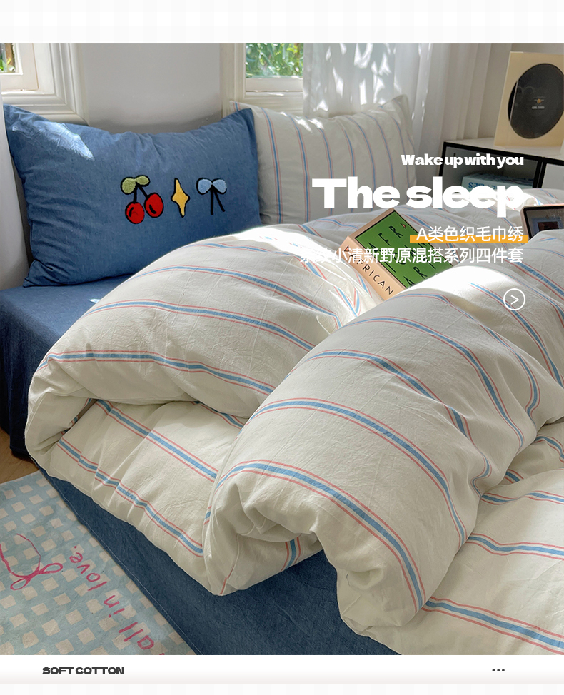 当前位置: 91家纺网 > 商品网购 > 床品套件 > 四件套 > 其它四件套 > 桃子家居 2024新款A类色织毛巾绣条纹小清新野原混搭纯棉系列四件套 色织水洗棉-牛仔樱桃