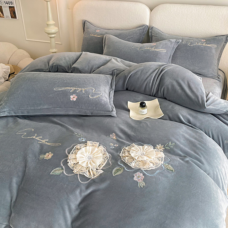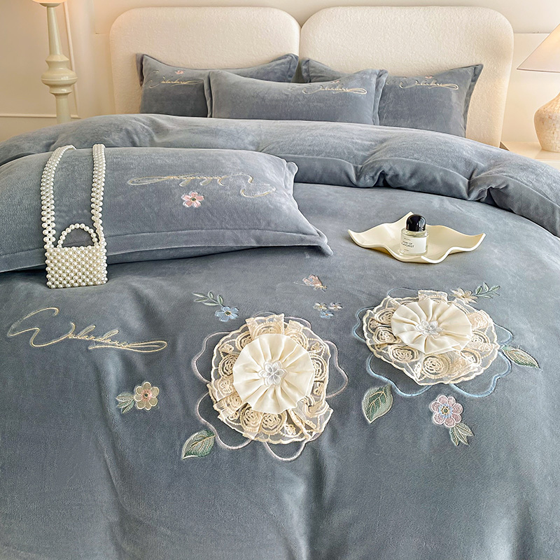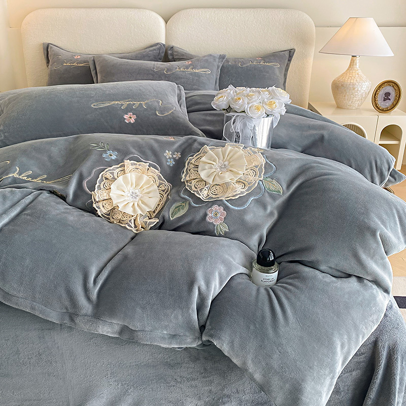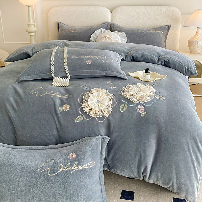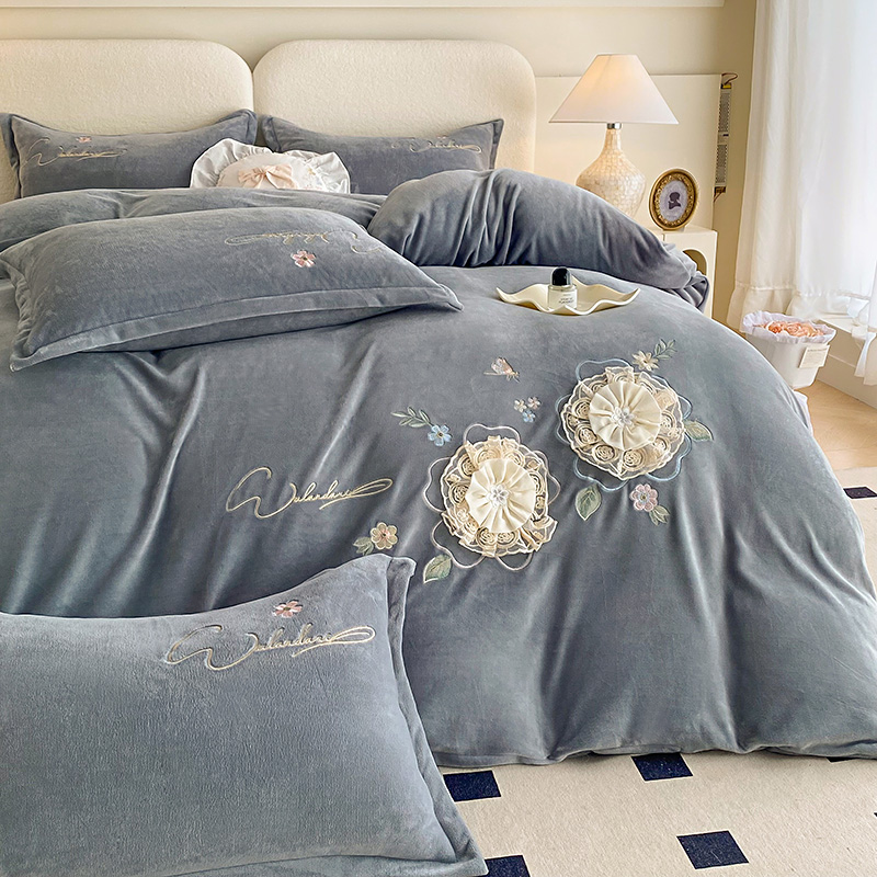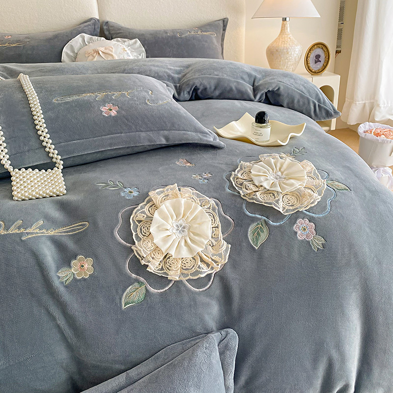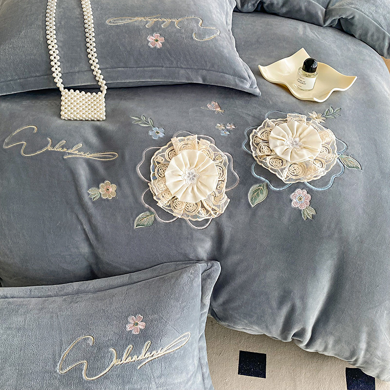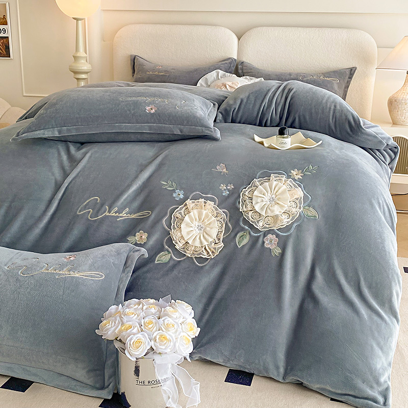 孟鑫家纺 2025新款加厚牛奶绒手工花绣花四件套莱茵花园系列 莱茵花园-高级灰
