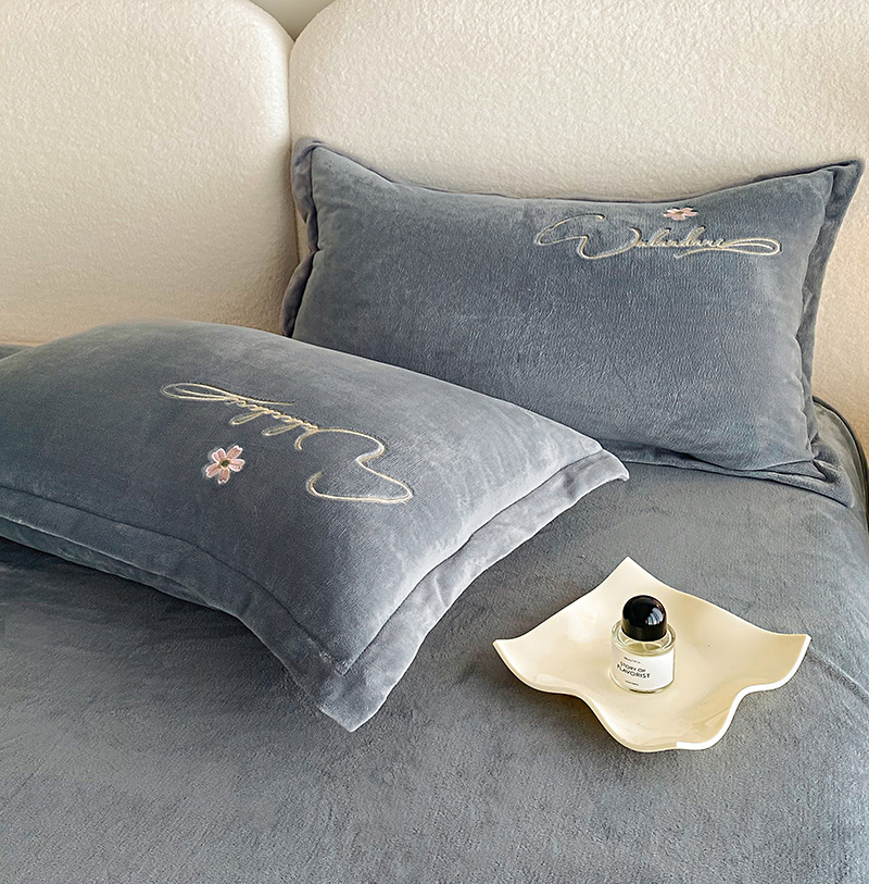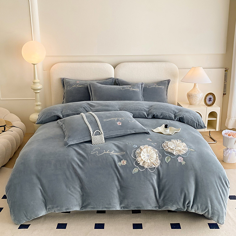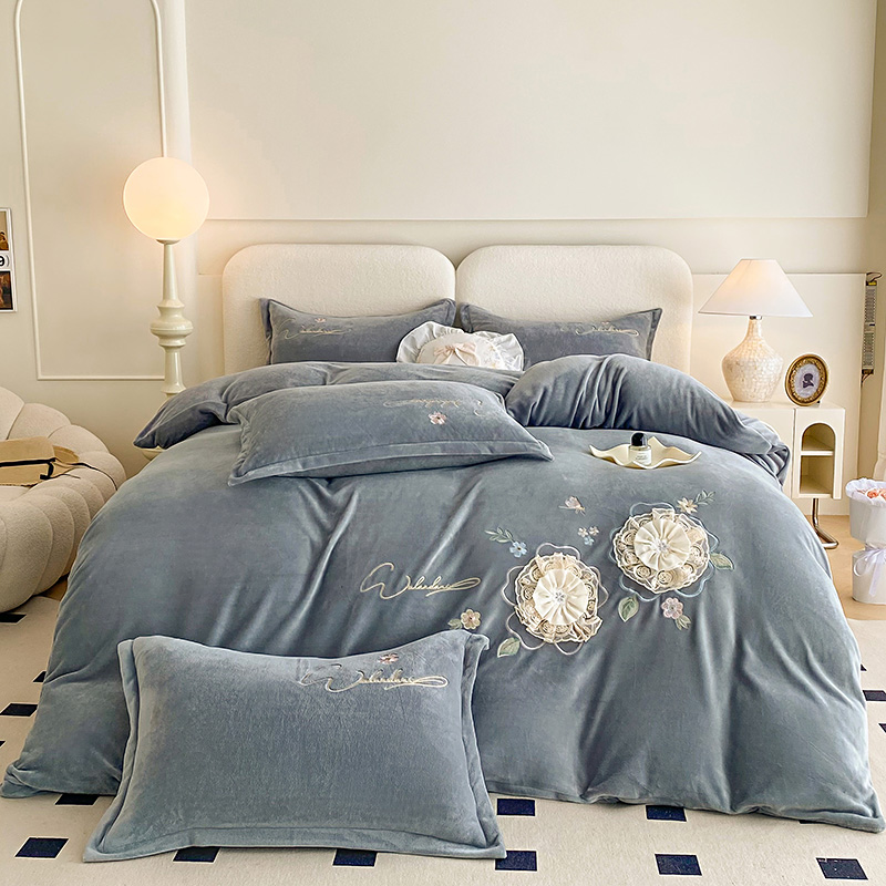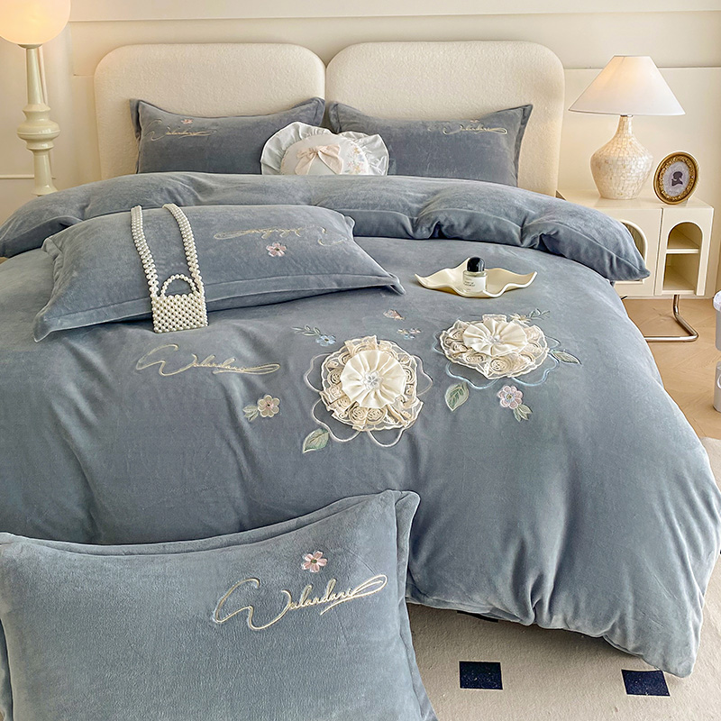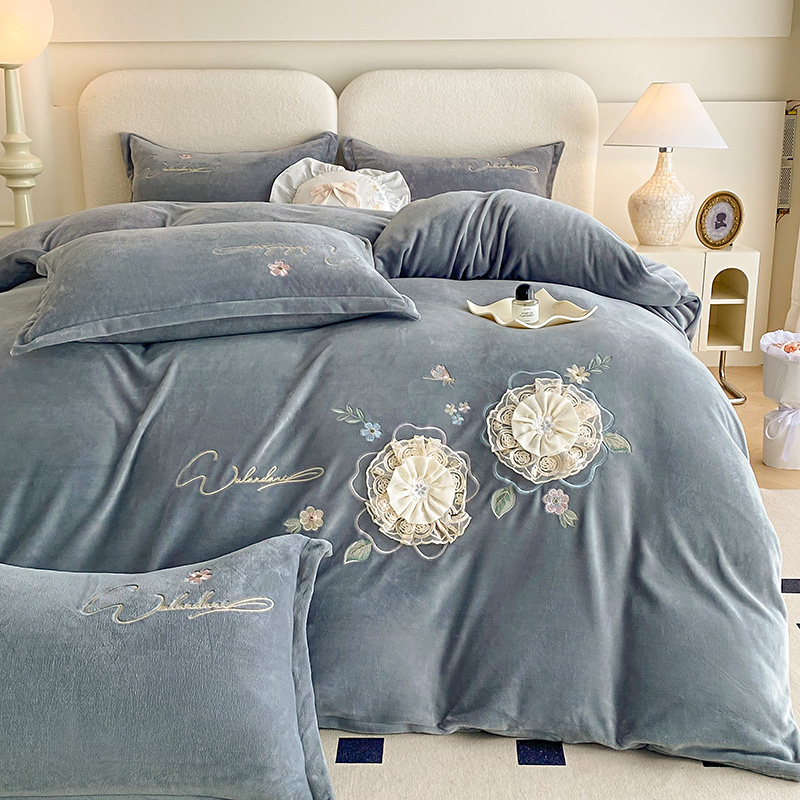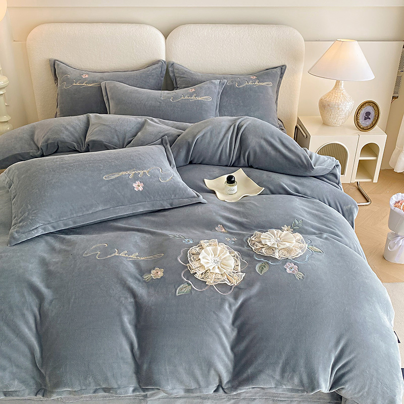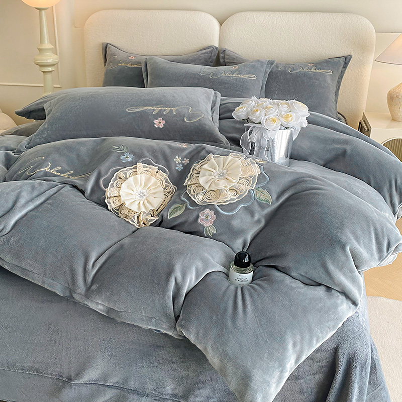 孟鑫家纺 2025新款加厚牛奶绒手工花绣花四件套莱茵花园系列 莱茵花园-高级灰
