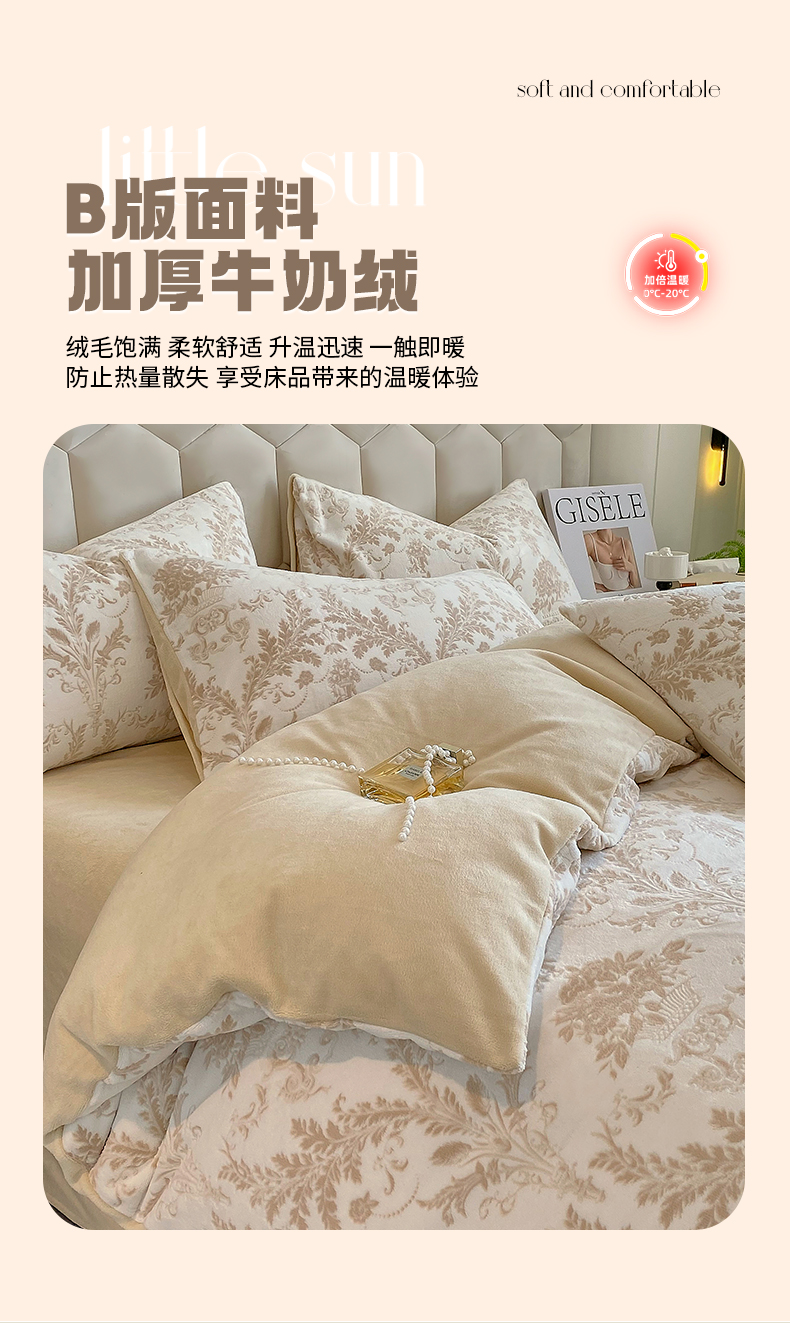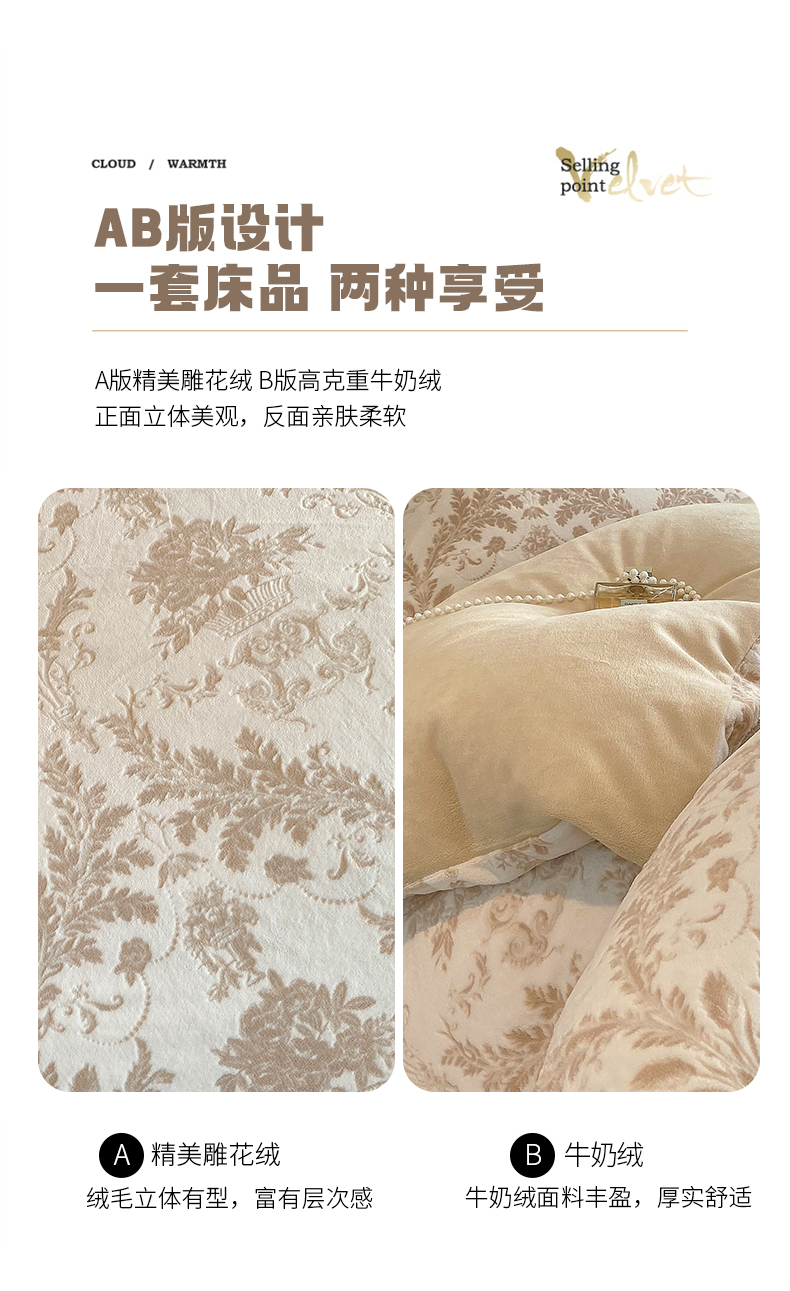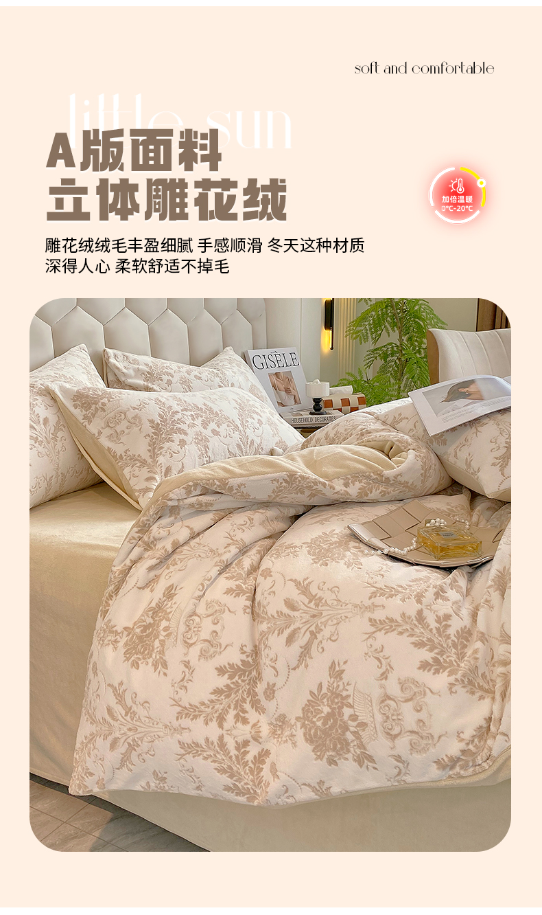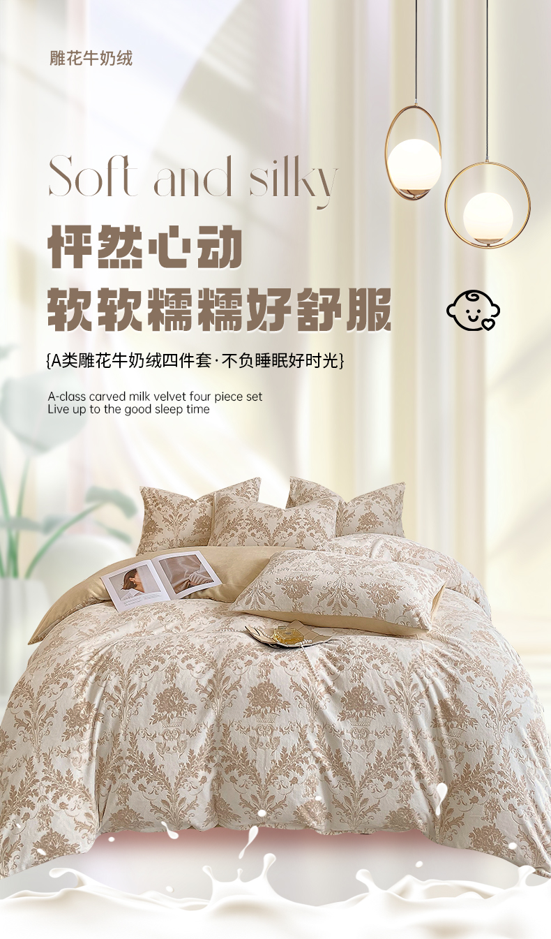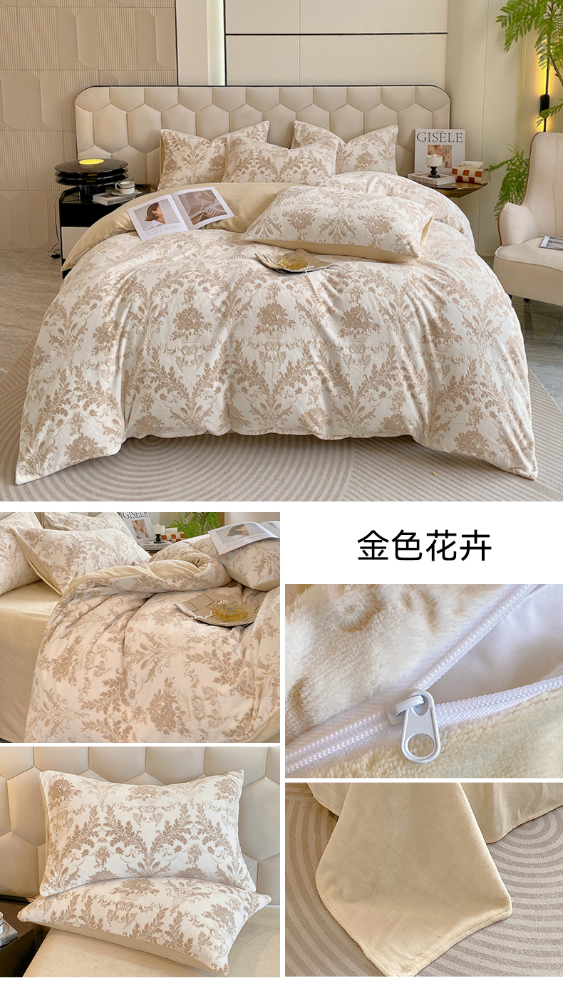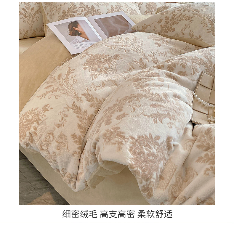 商品名称:佰亿莱 2024新款雕花牛奶绒四件套 金色花卉