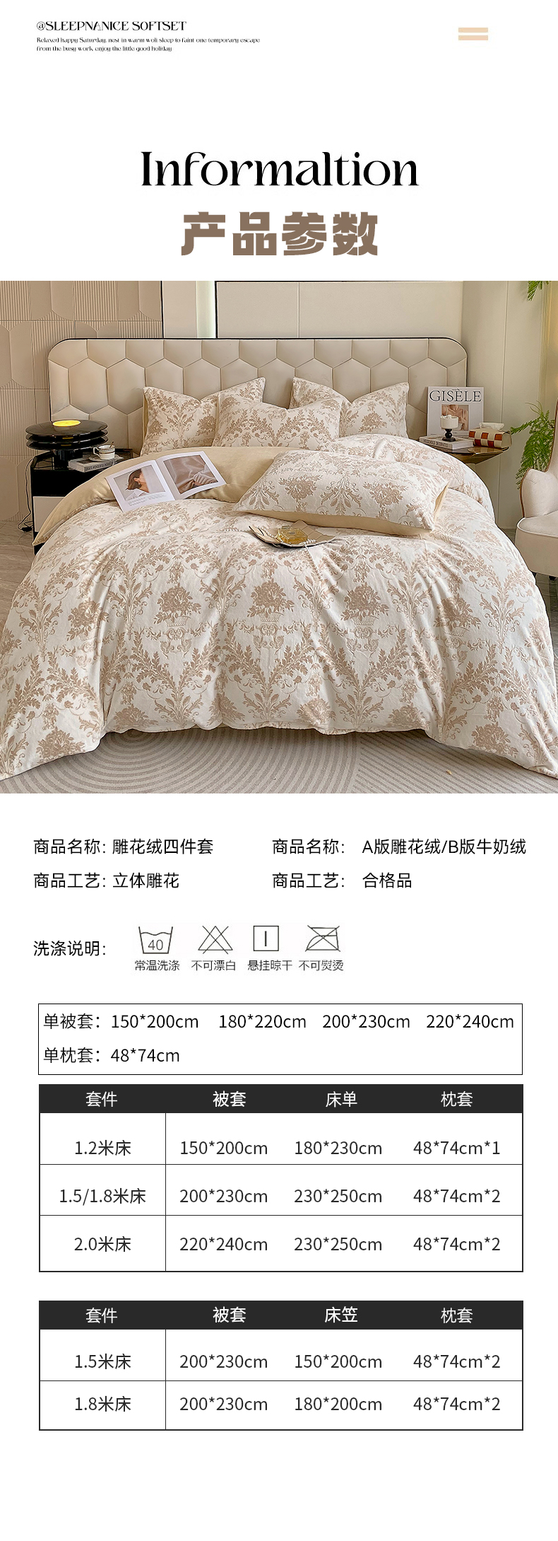 (总)佰亿莱 2024新款高克重雕花牛奶绒轻奢拼角四件套,红棕,鎏金,墨绿,暖粉,叶青,幽蓝