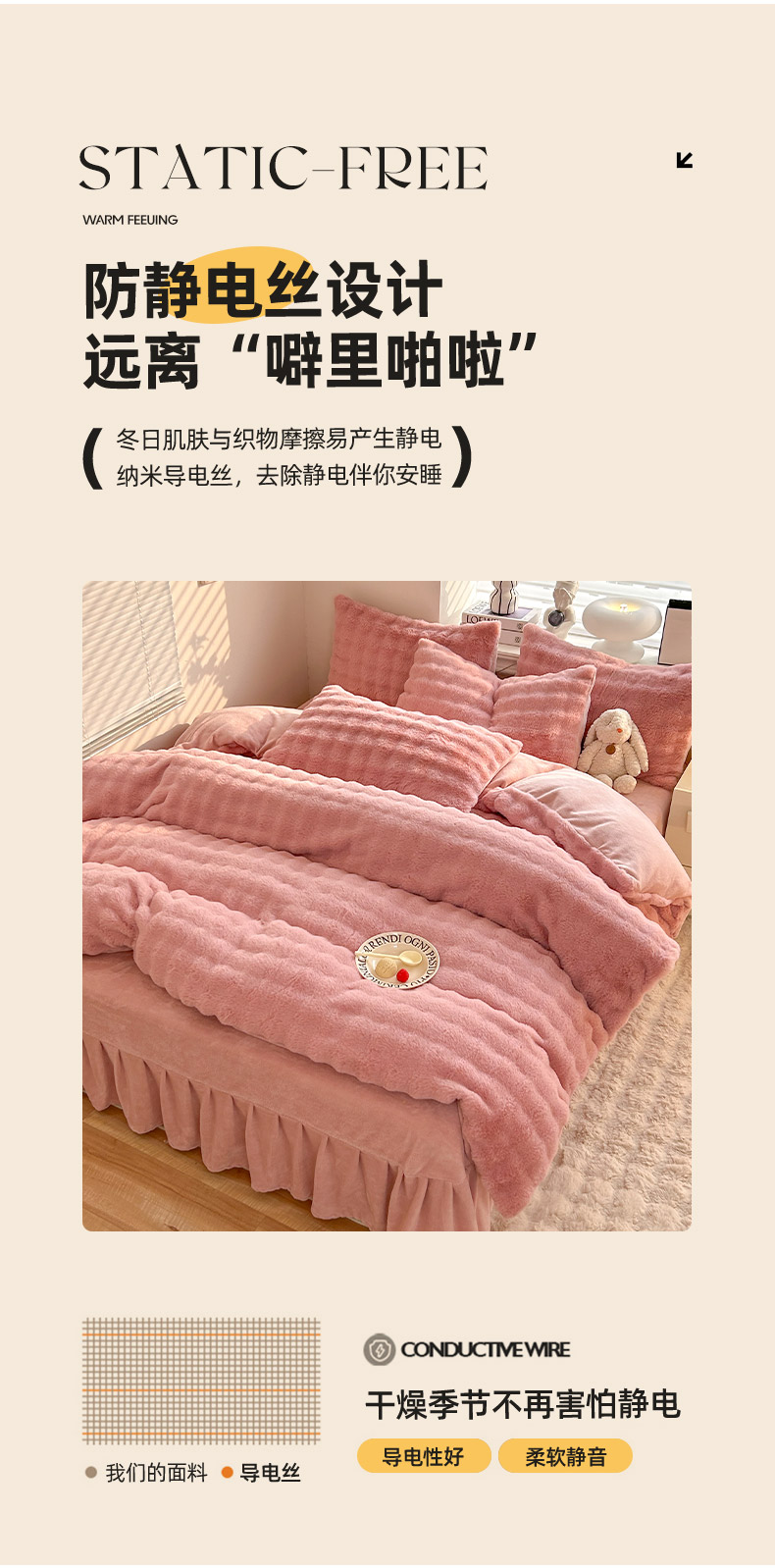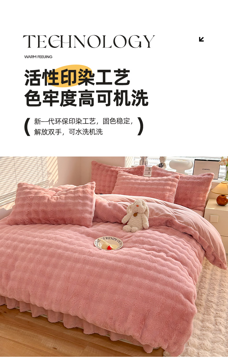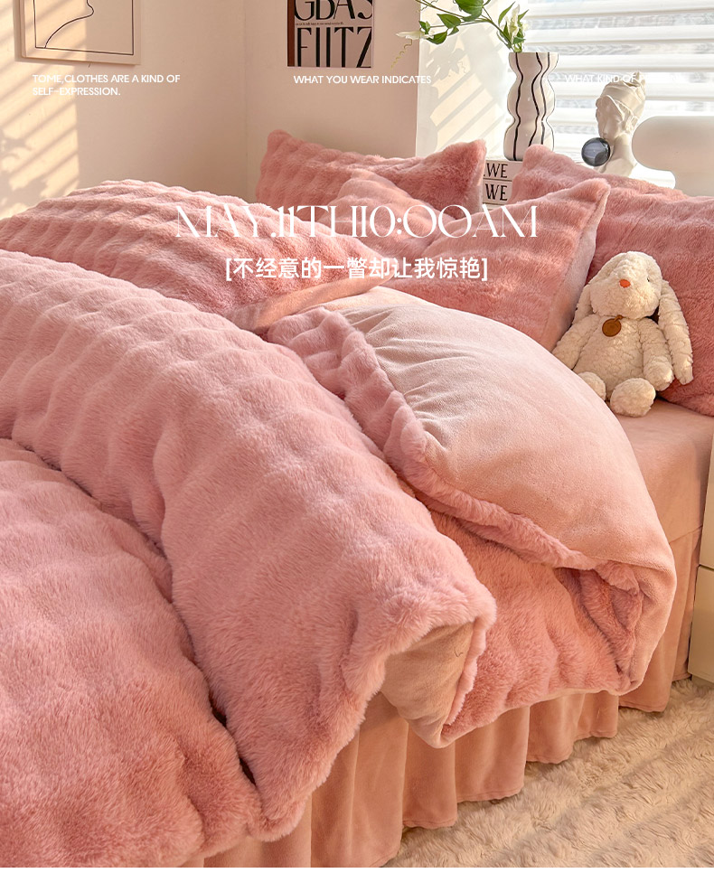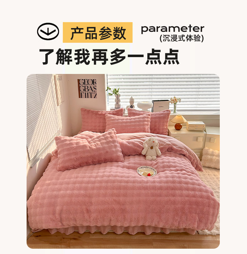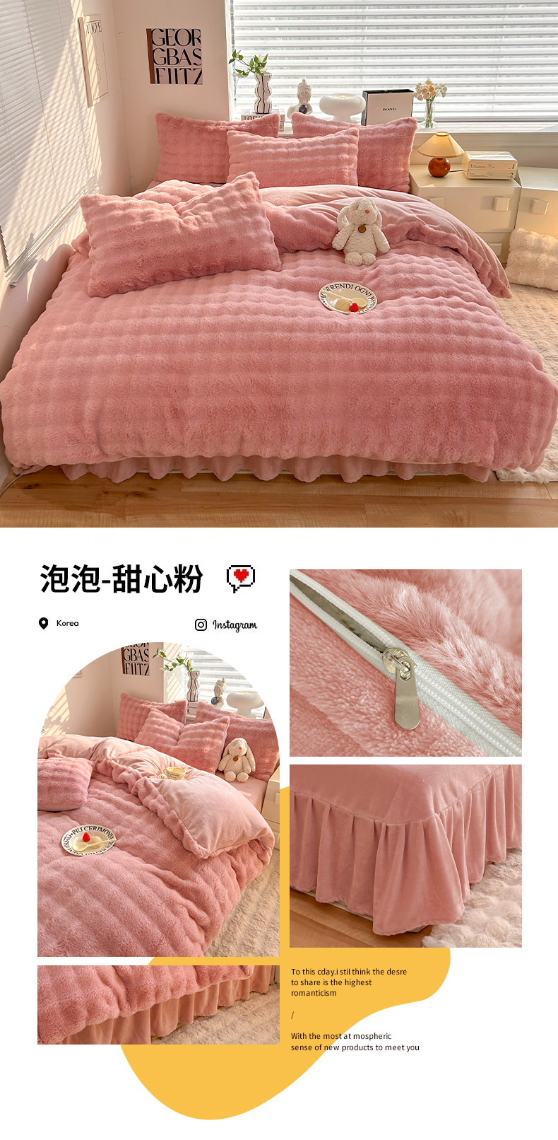商品名称:欧冠家纺 2024秋冬新款纯色泡泡绒和七彩泡泡床裙款四件套 泡泡-甜心粉