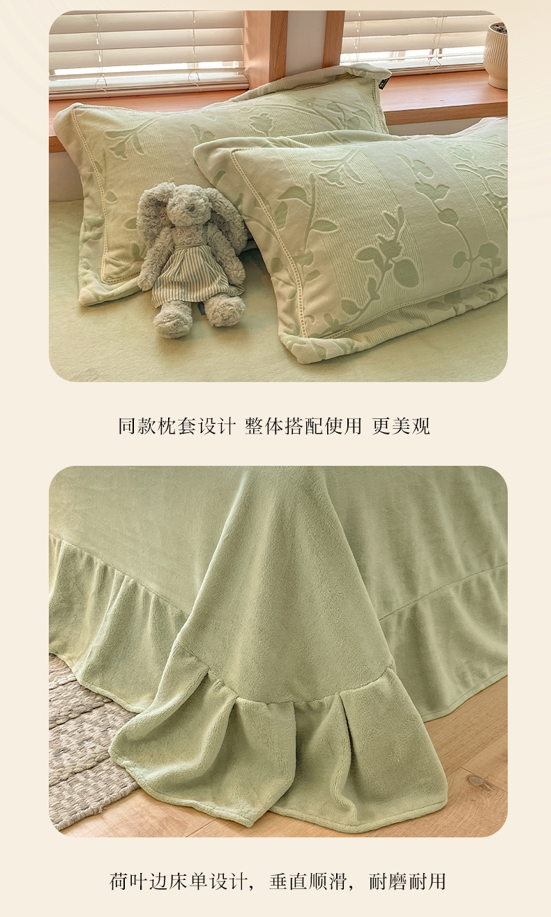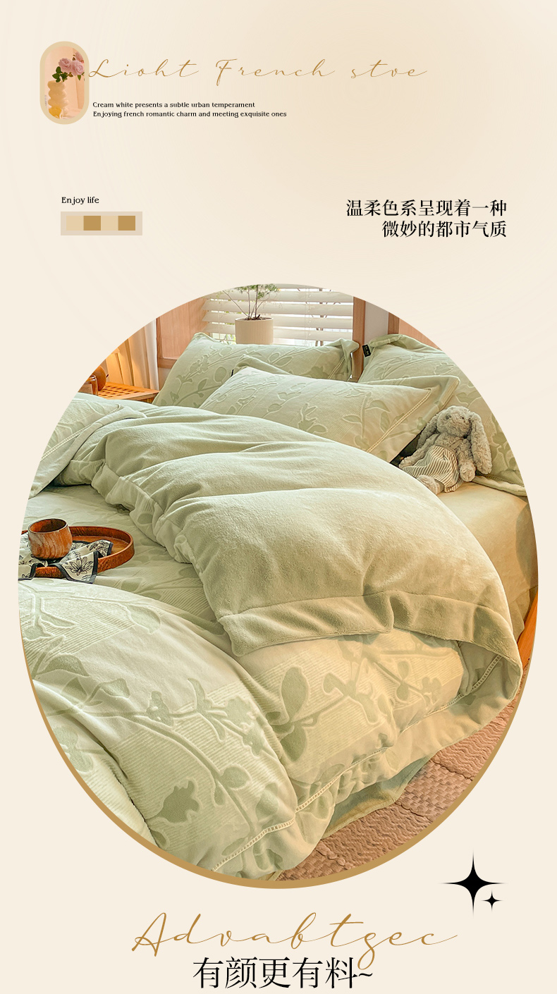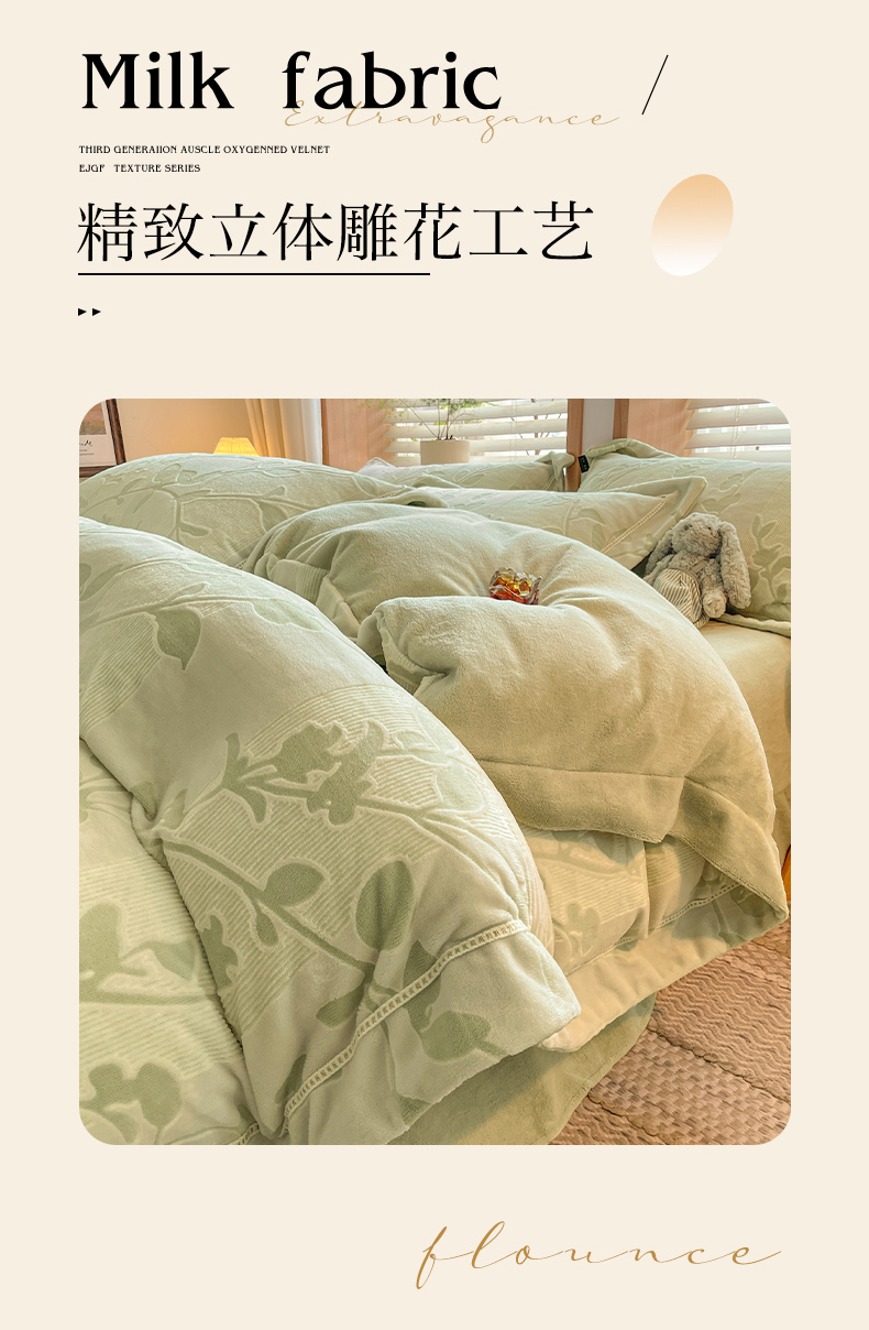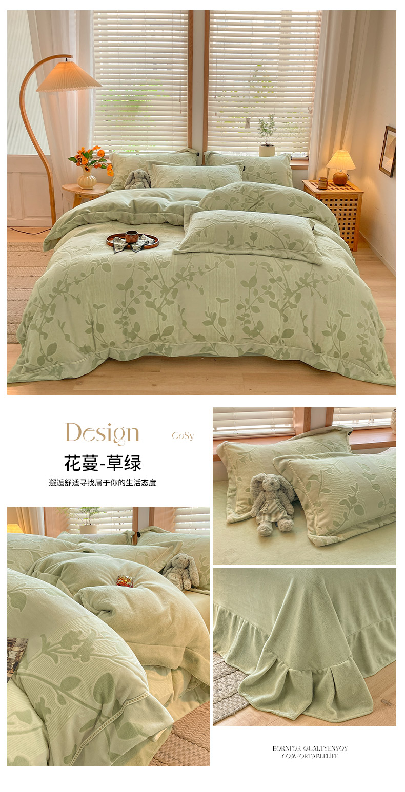 商品名称:简如 2025新款A类加厚冰岛立体雕花牛奶绒浮雕绒四件套(有买家秀) 花蔓-草绿