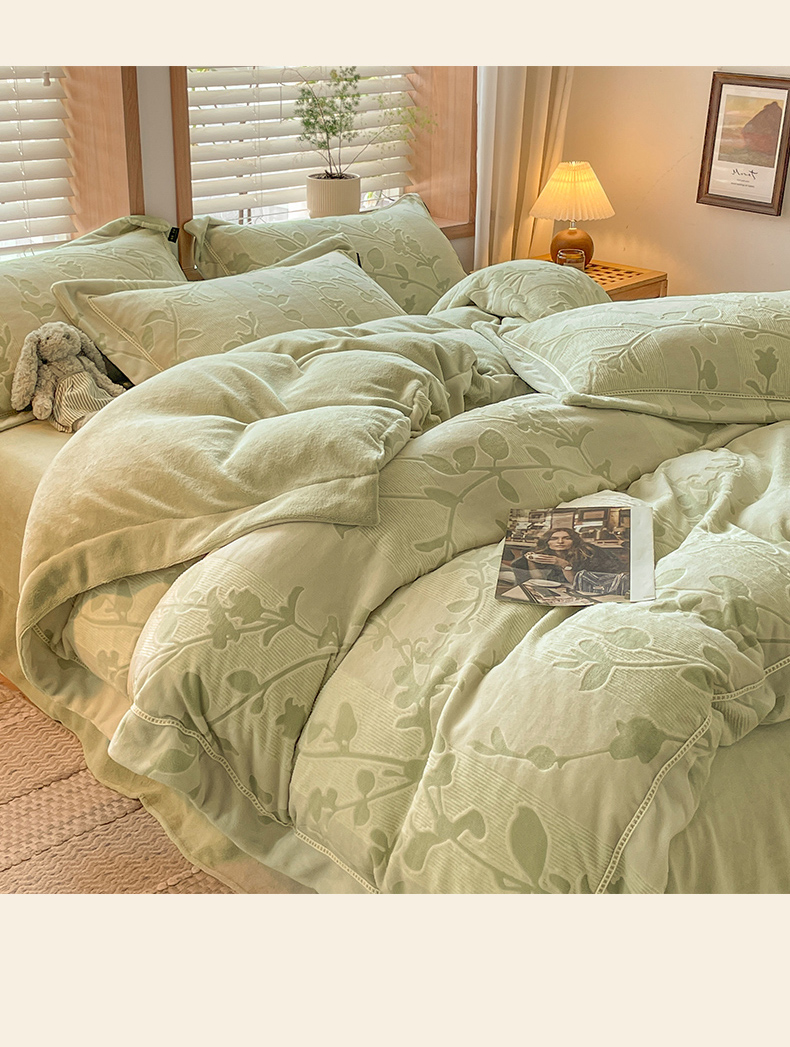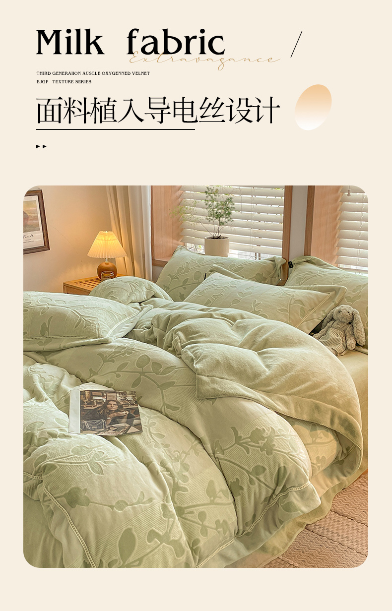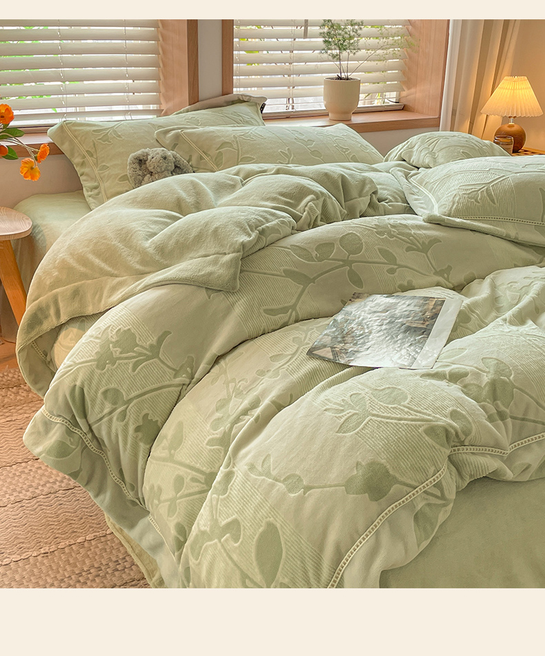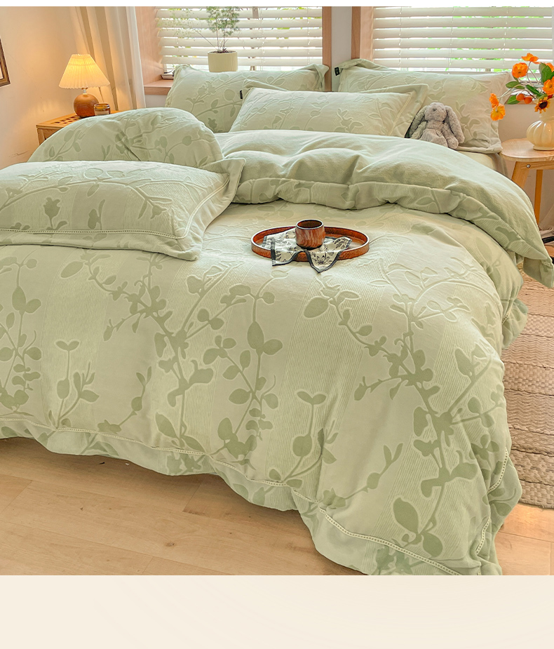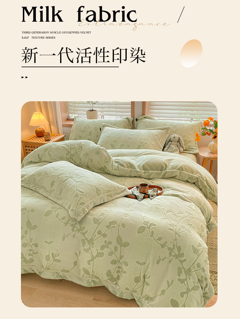 商品名称:简如 2025新款A类加厚冰岛立体雕花牛奶绒浮雕绒四件套(有买家秀) 花蔓-草绿
