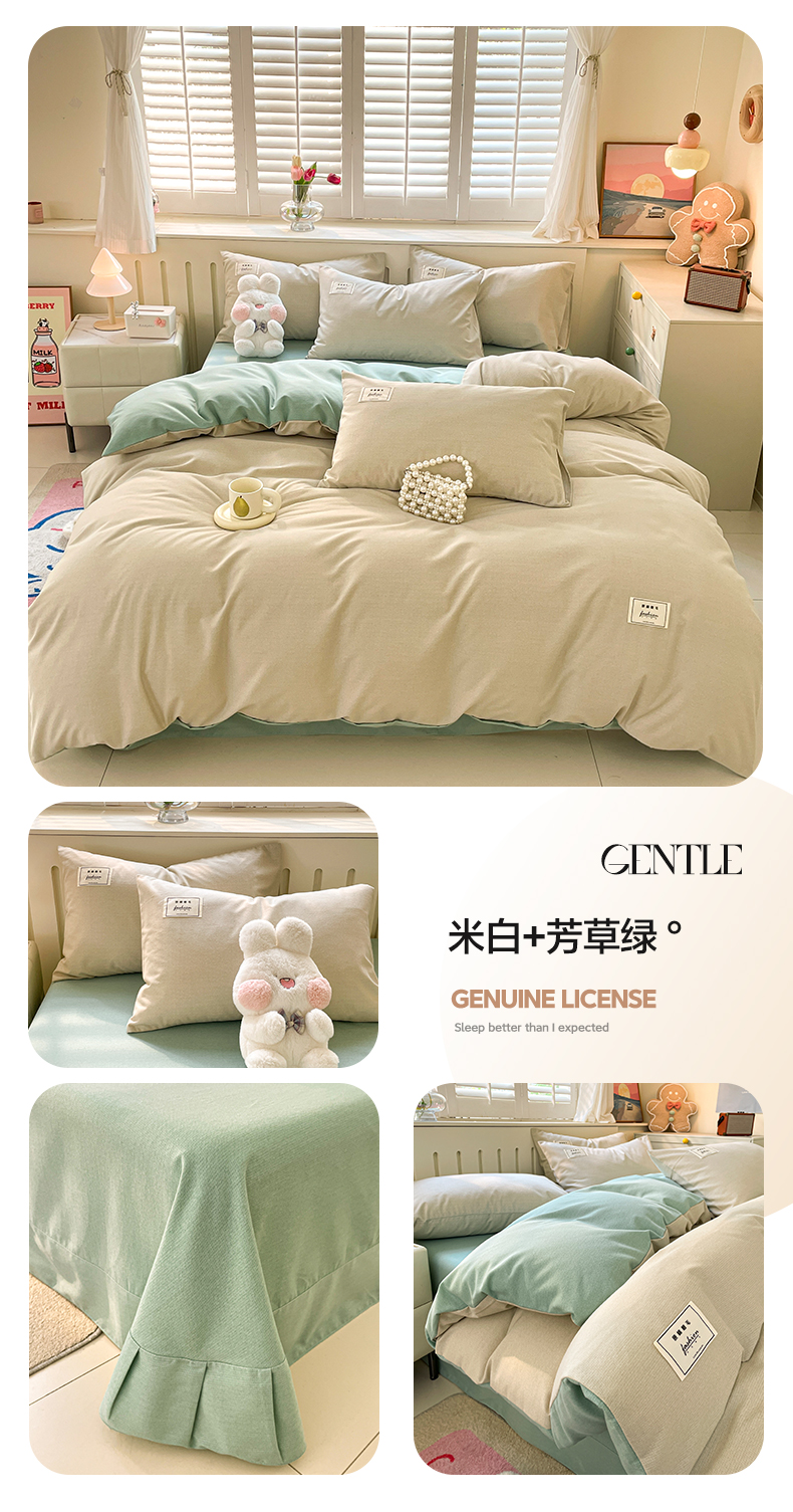 当前位置: 91家纺网 > 商品网购 > 床品套件 > 四件套 > 普通磨毛四件套 > 韩后家纺 2025新款原棉磨毛加厚双拼四件套 米白+芳草绿