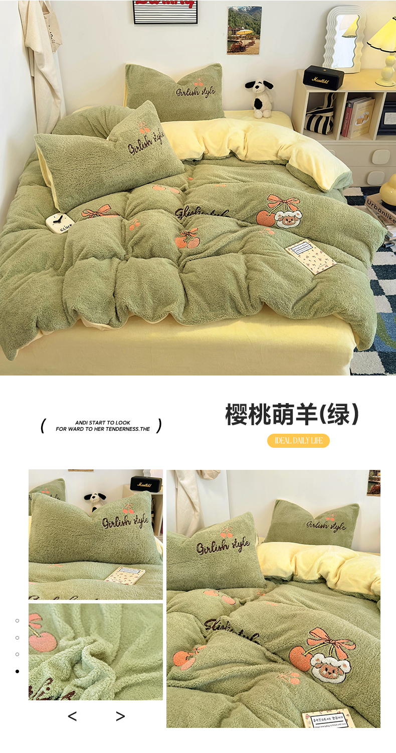 商品名称:春光里 2024新款泰迪绒230克牛奶绒毛巾绣四件套(提供买家秀) 樱桃萌羊(绿)