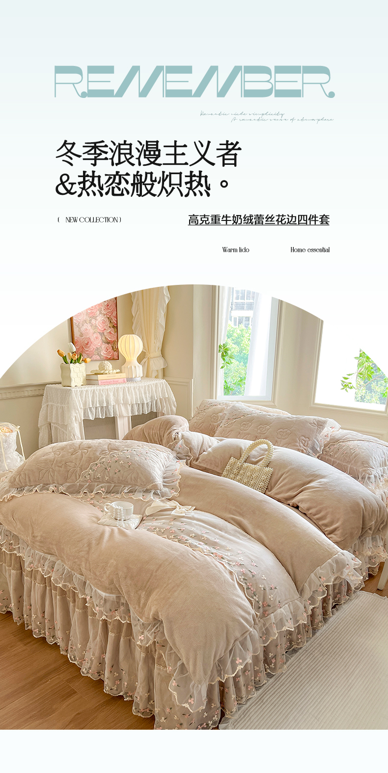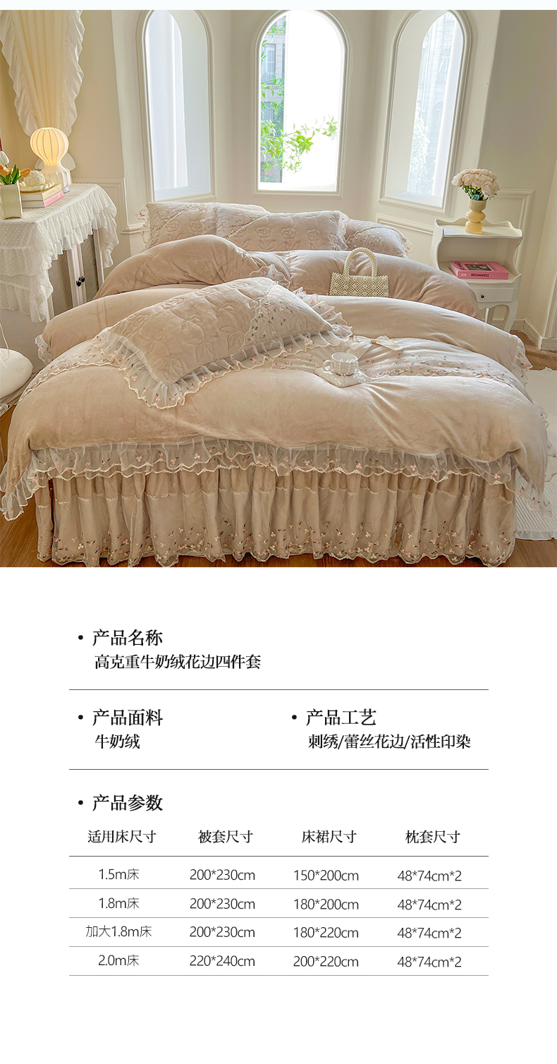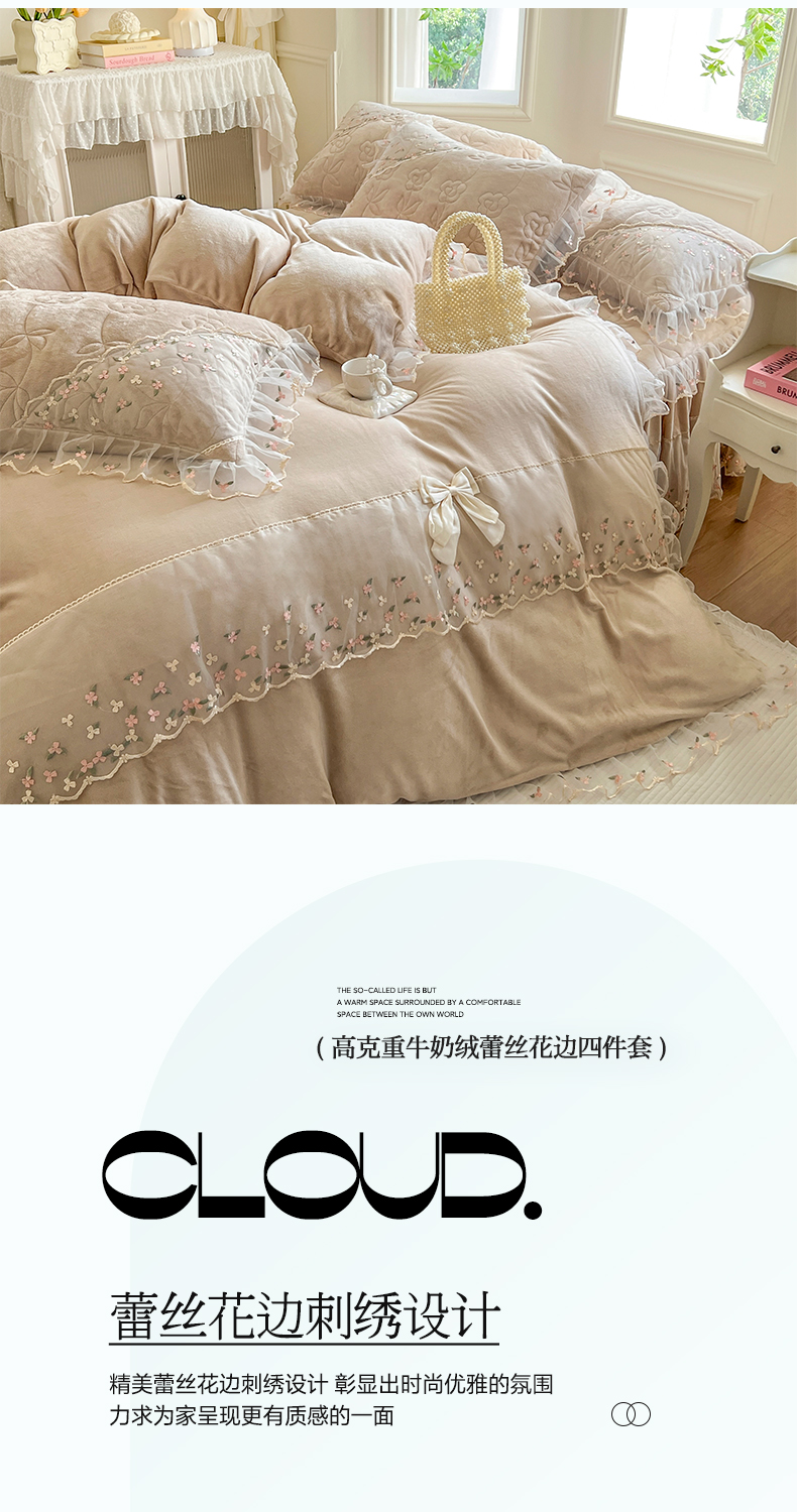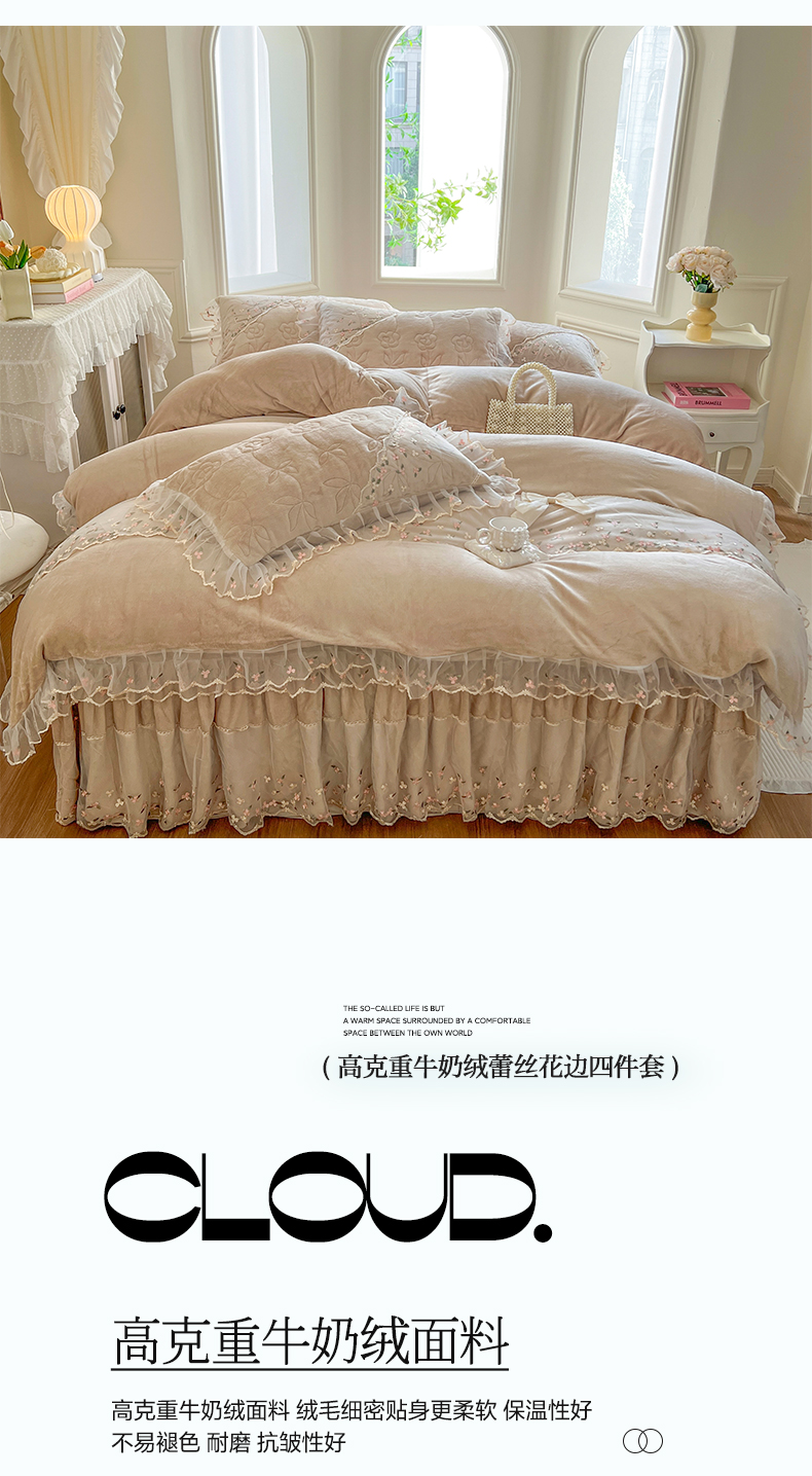 当前位置: 91家纺网 > 商品网购 > 床品套件 > 四件套 > 牛奶绒四件套 > 网红馆(ck家纺) 2025新款加厚保暖高克重牛奶绒蕾丝花边床裙款恬星系列四件套 恬星-奶咖