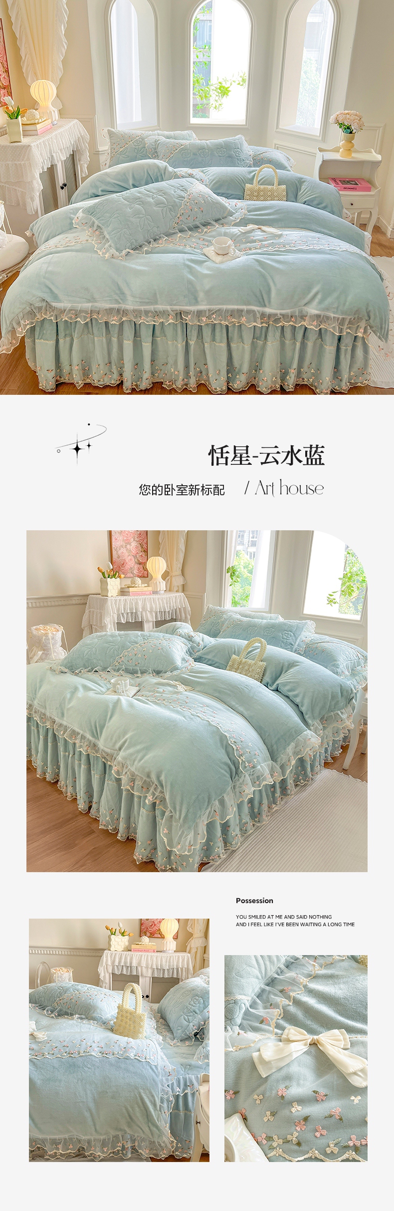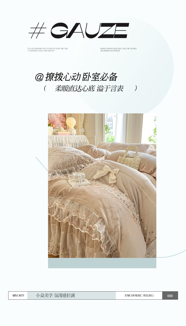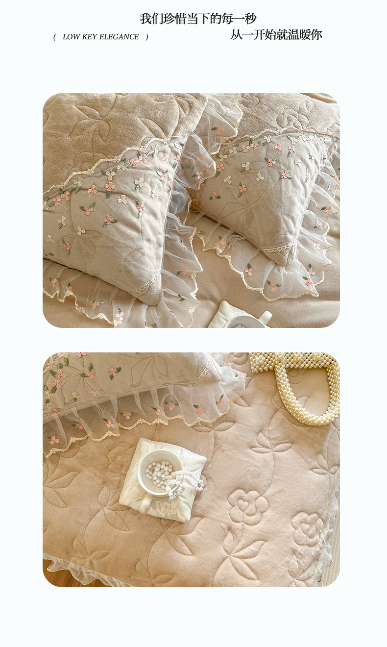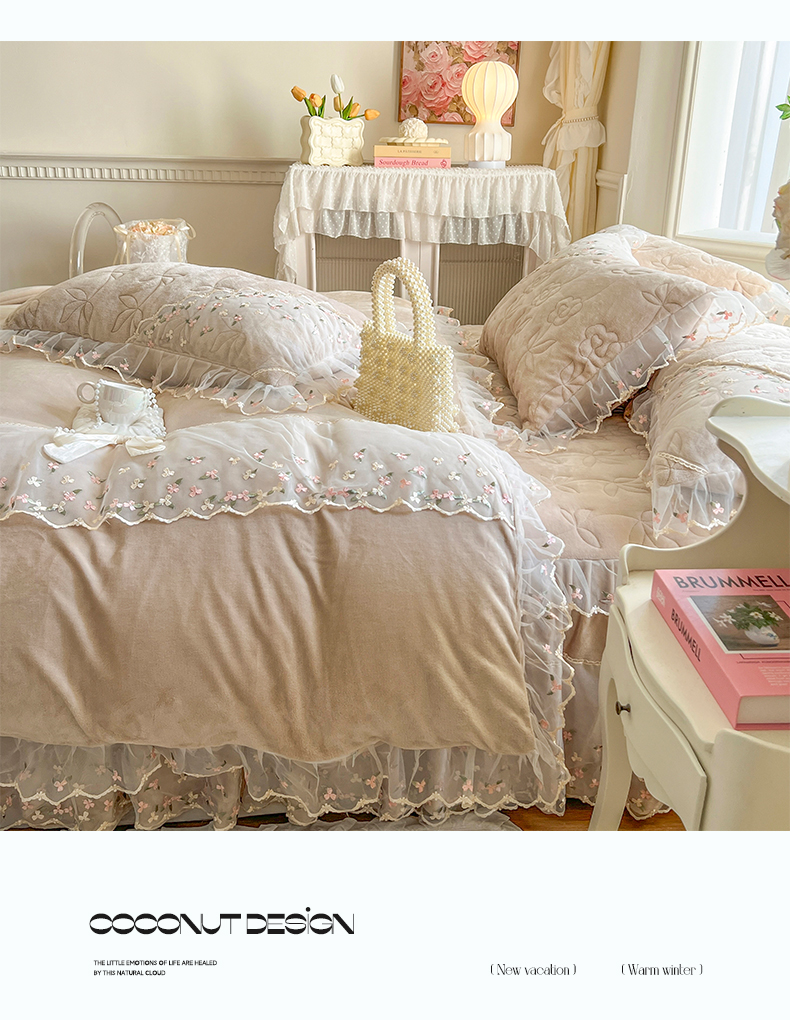 当前位置: 91家纺网 > 商品网购 > 床品套件 > 四件套 > 牛奶绒四件套 > 网红馆(ck家纺) 2025新款加厚保暖高克重牛奶绒蕾丝花边床裙款恬星系列四件套 恬星-奶咖