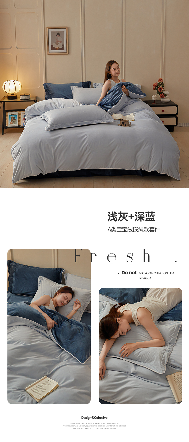 澳梵家居 澳梵家居 2024新款A类宝宝绒嵌绳款四件套--【雅致系列】 浅灰+深蓝