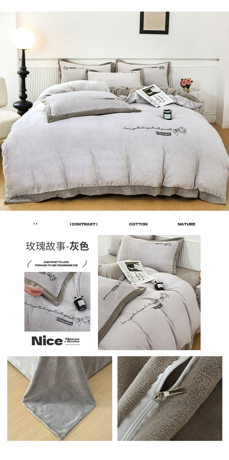 商品名称:大渔生活 2025新款牛奶绒刺绣四件套-玫瑰故事 玫瑰故事-灰色