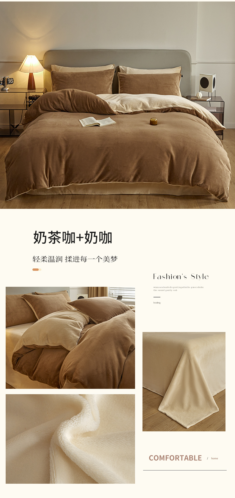 商品名称:凡客家居 2024新款A类加厚230克纯色双拼牛奶绒四件套 奶茶咖+奶咖