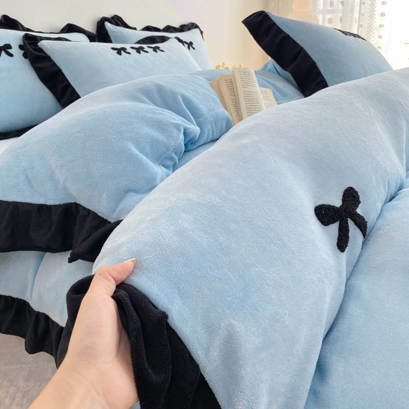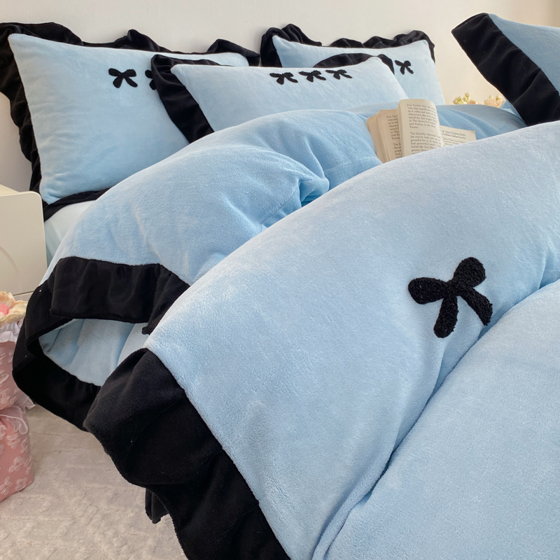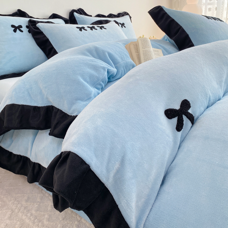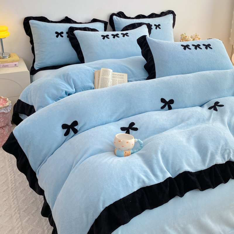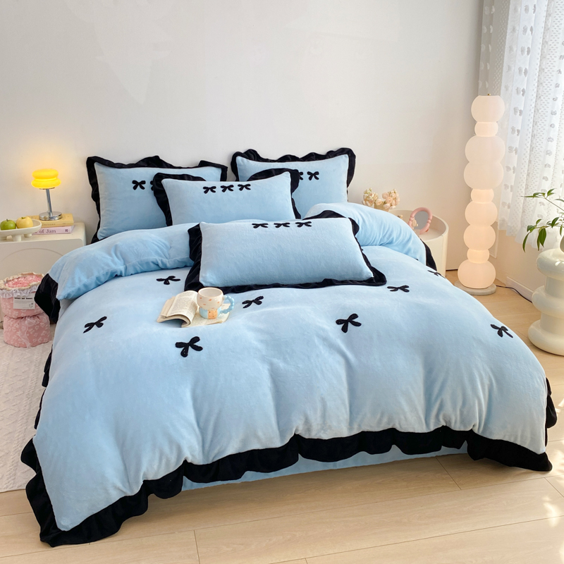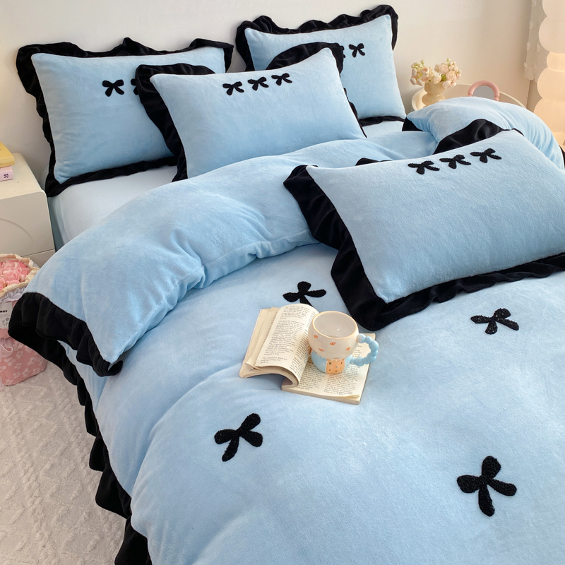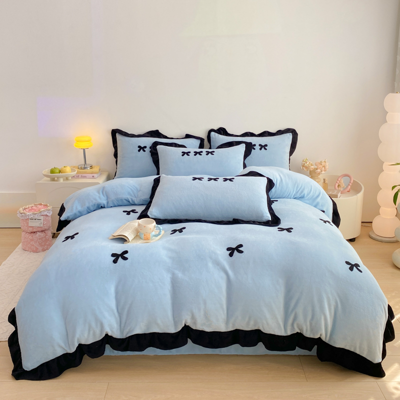 梦莱斯 2024新款黑边绣花牛奶绒四件套 蝴蝶结-蓝