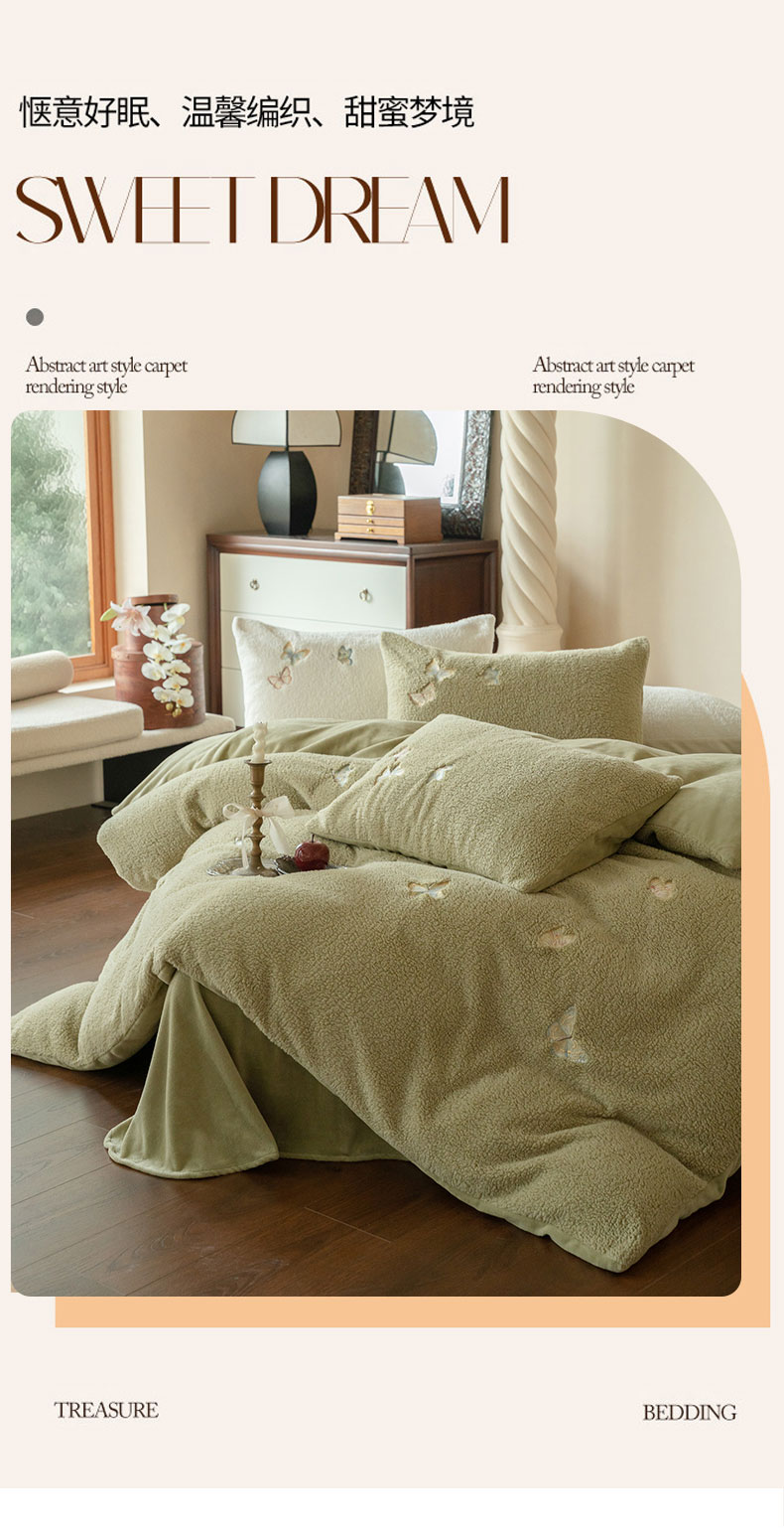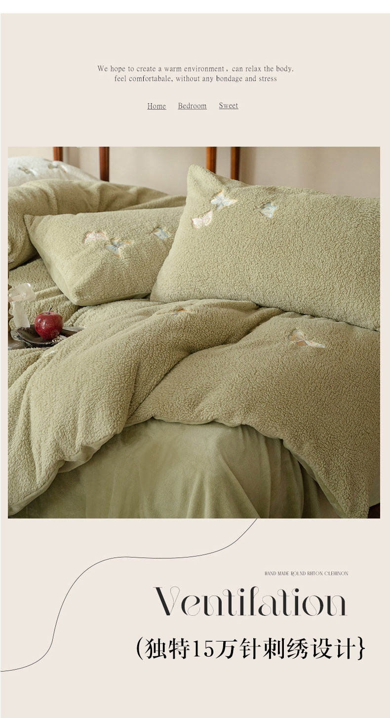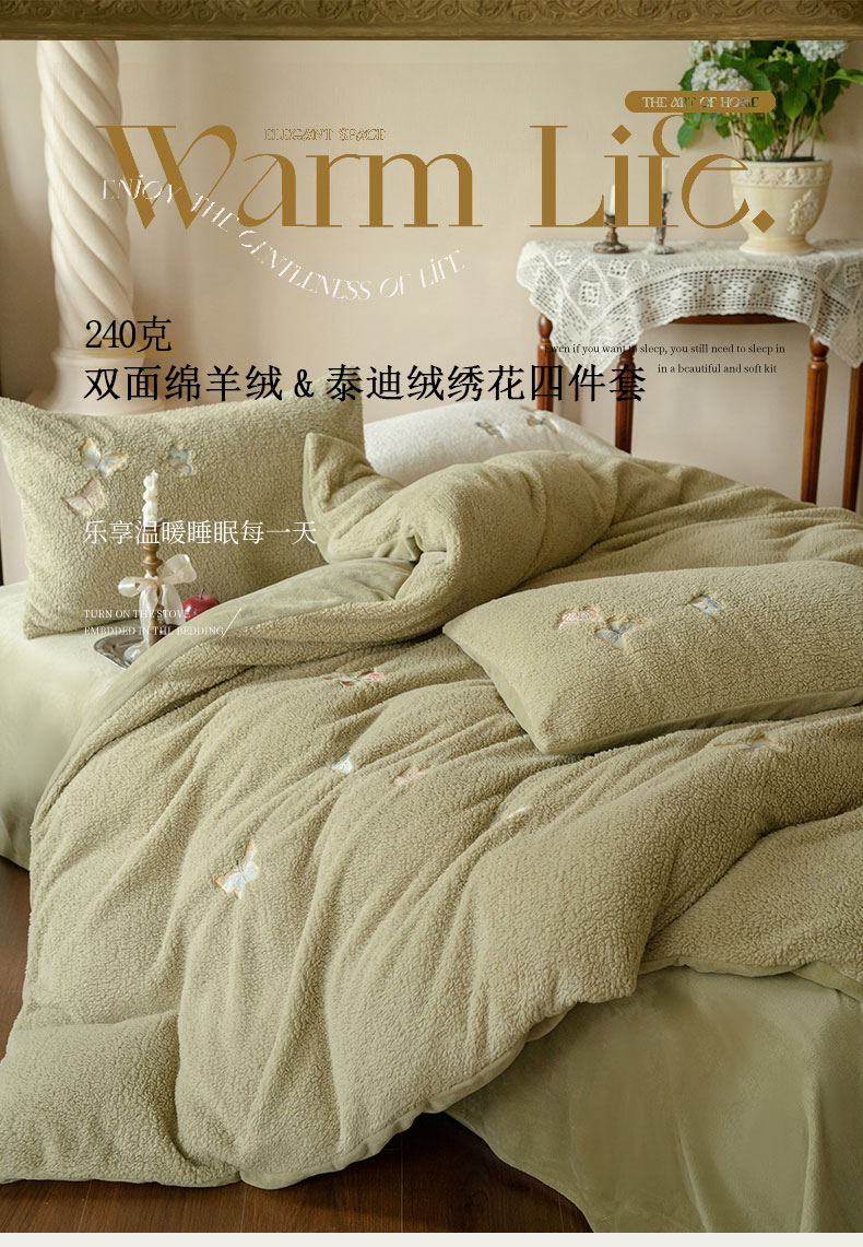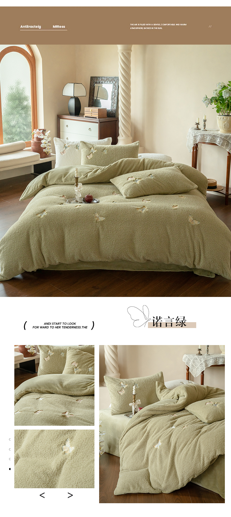 当前位置: 91家纺网 > 商品网购 > 床品套件 > 四件套 > 其它四件套 > FORTWO家纺 2024新款240g双面绵羊绒&泰迪绒绣花四件套 诺言绿
