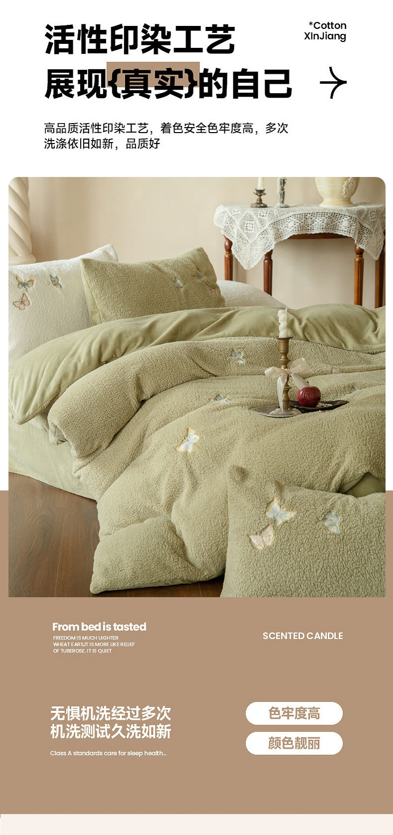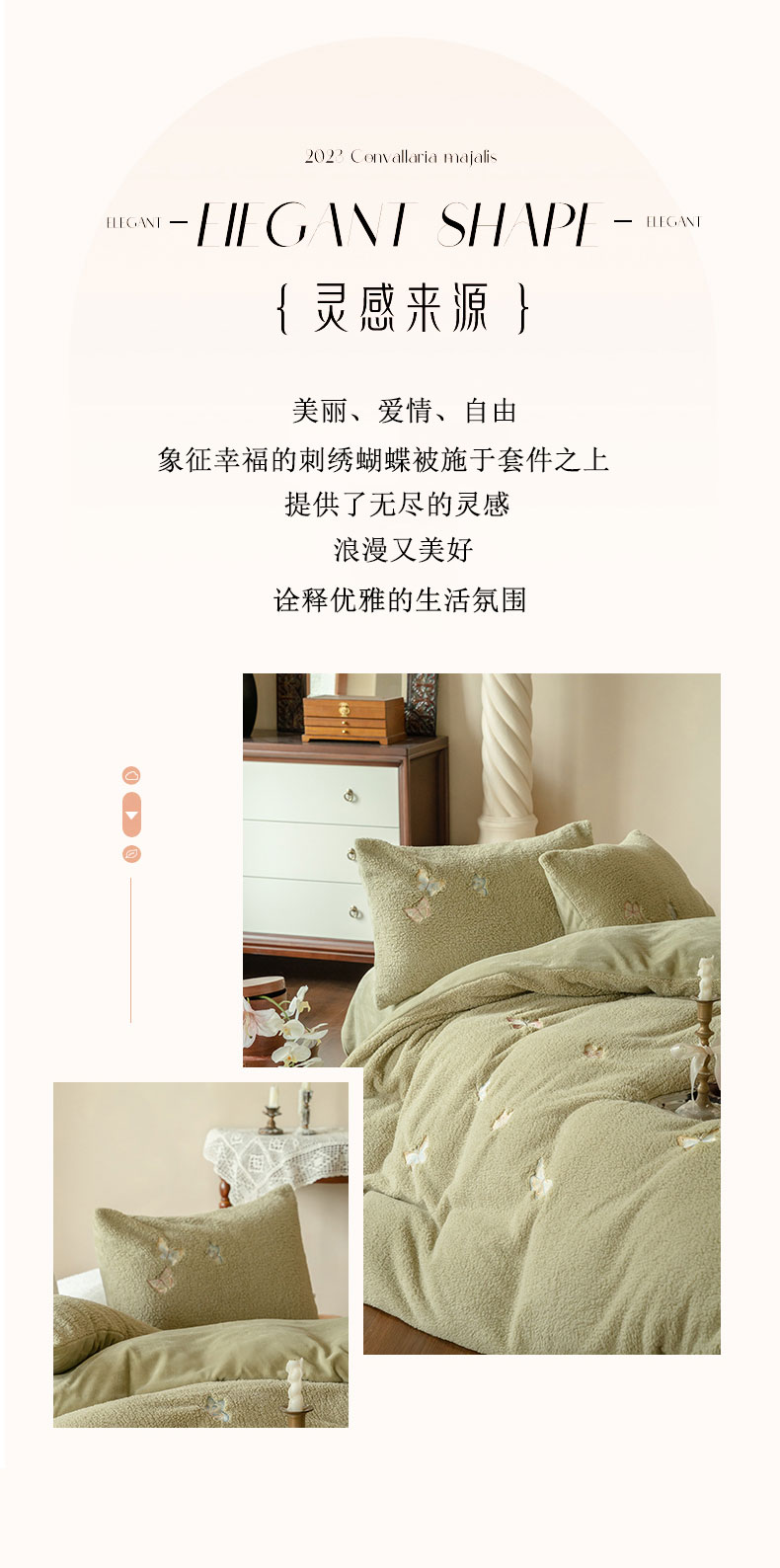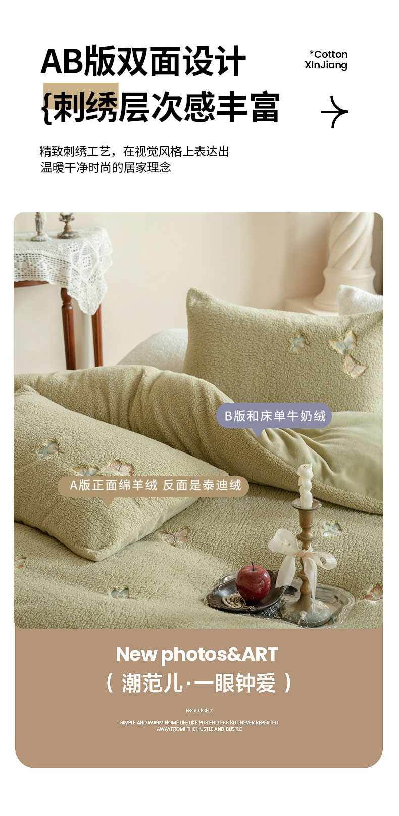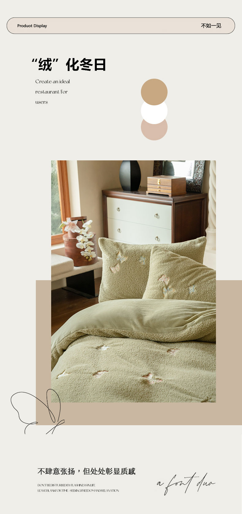 当前位置: 91家纺网 > 商品网购 > 床品套件 > 四件套 > 其它四件套 > FORTWO家纺 2024新款240g双面绵羊绒&泰迪绒绣花四件套 诺言绿