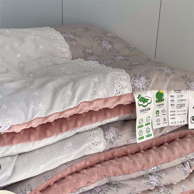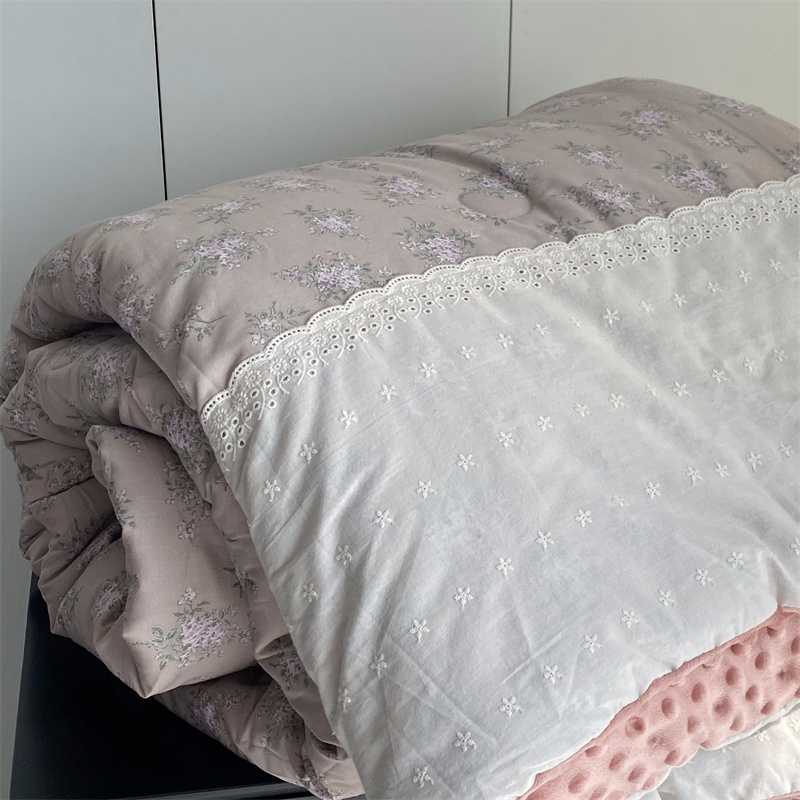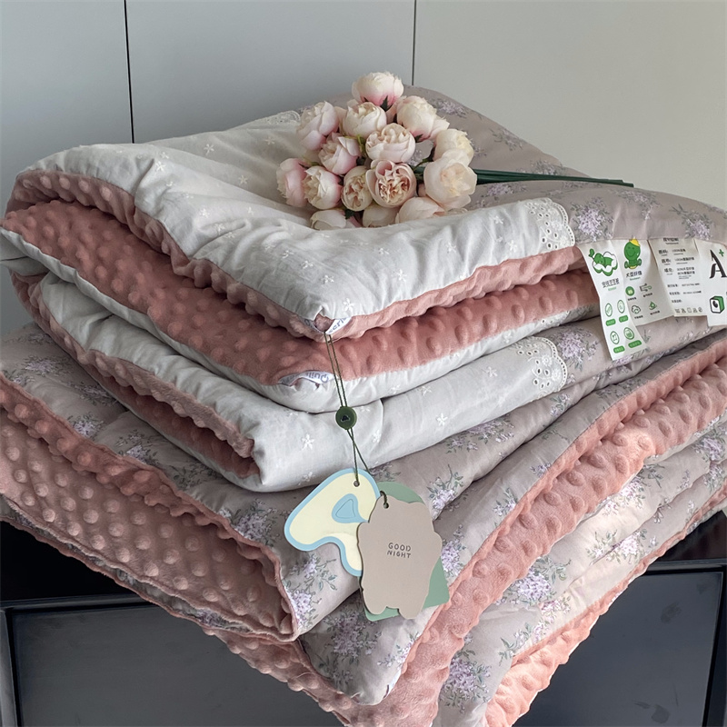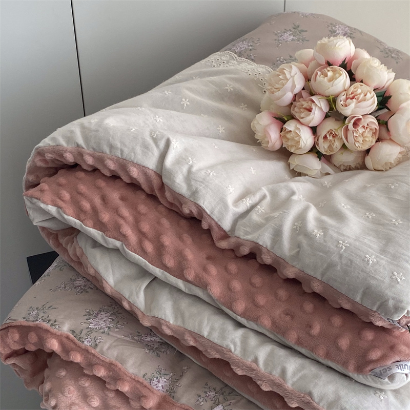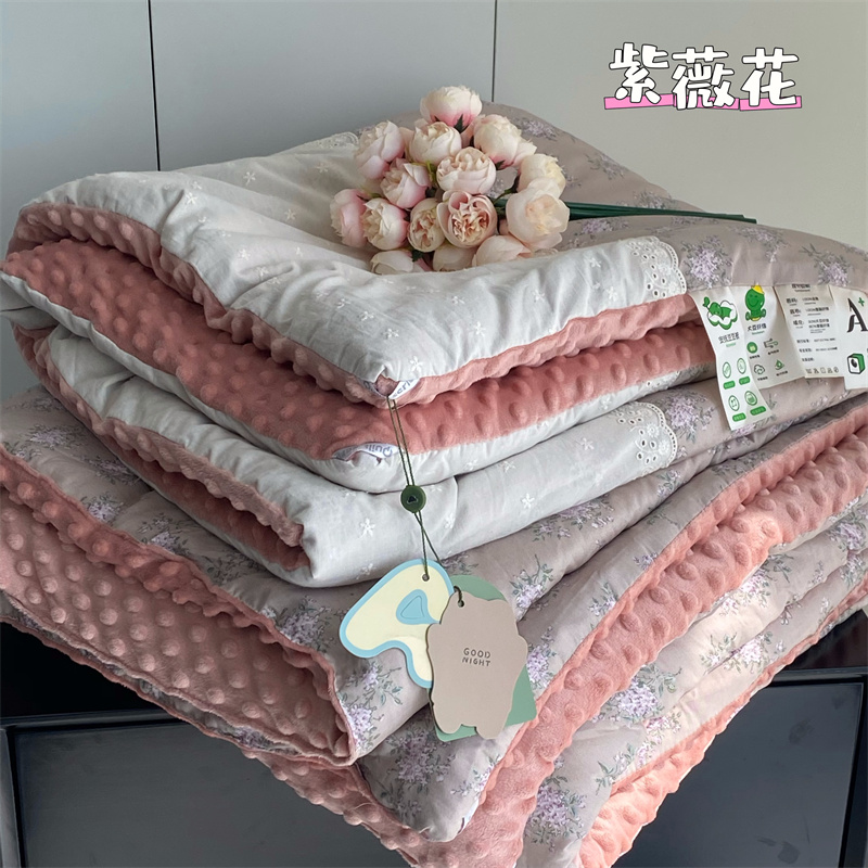 2025新款秋冬季棉加豆豆绒法式花边款豆豆被被芯紫薇花