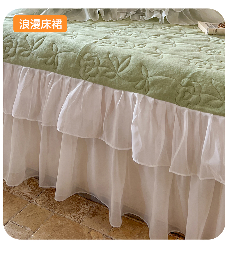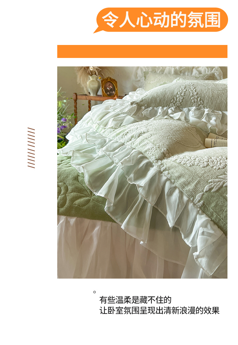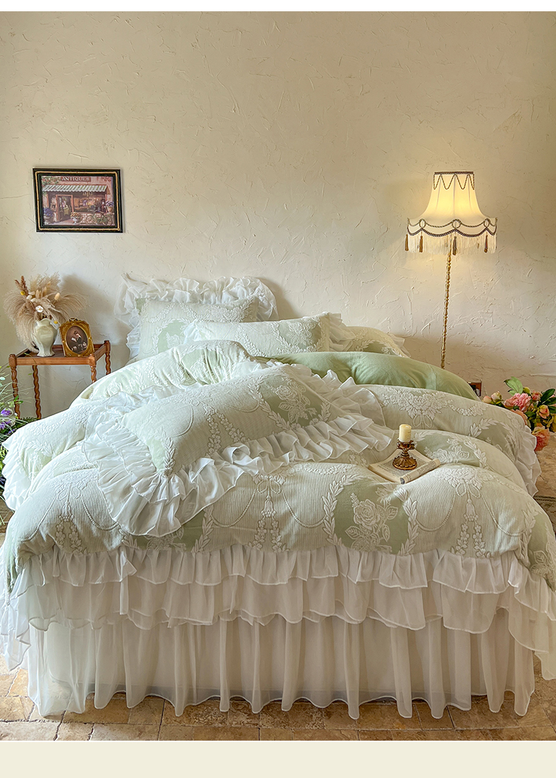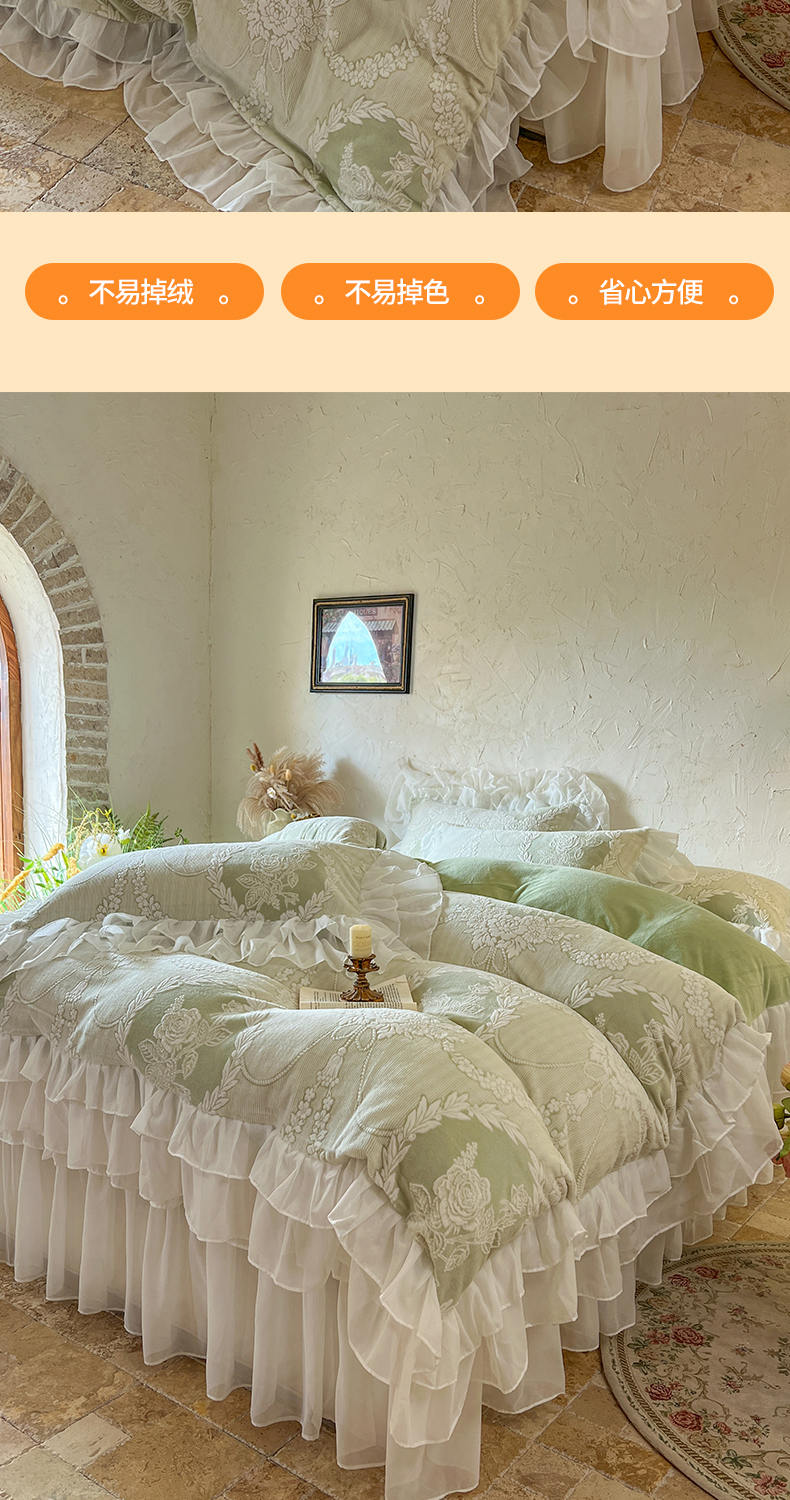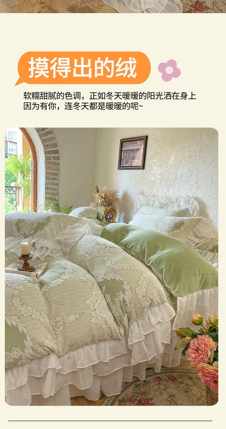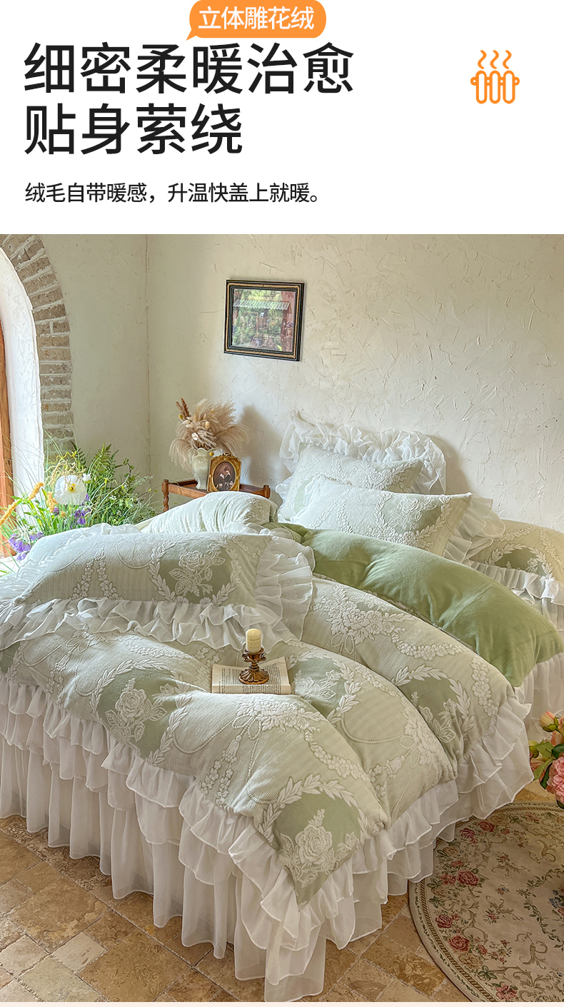 当前位置: 91家纺网 > 商品网购 > 床品套件 > 四件套 > 雕花绒四件套 > 网红馆(ck家纺) 2025新款雕花绒床裙四件套--舒芙蕾 舒芙蕾-浅绿
