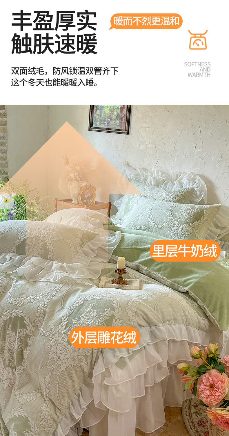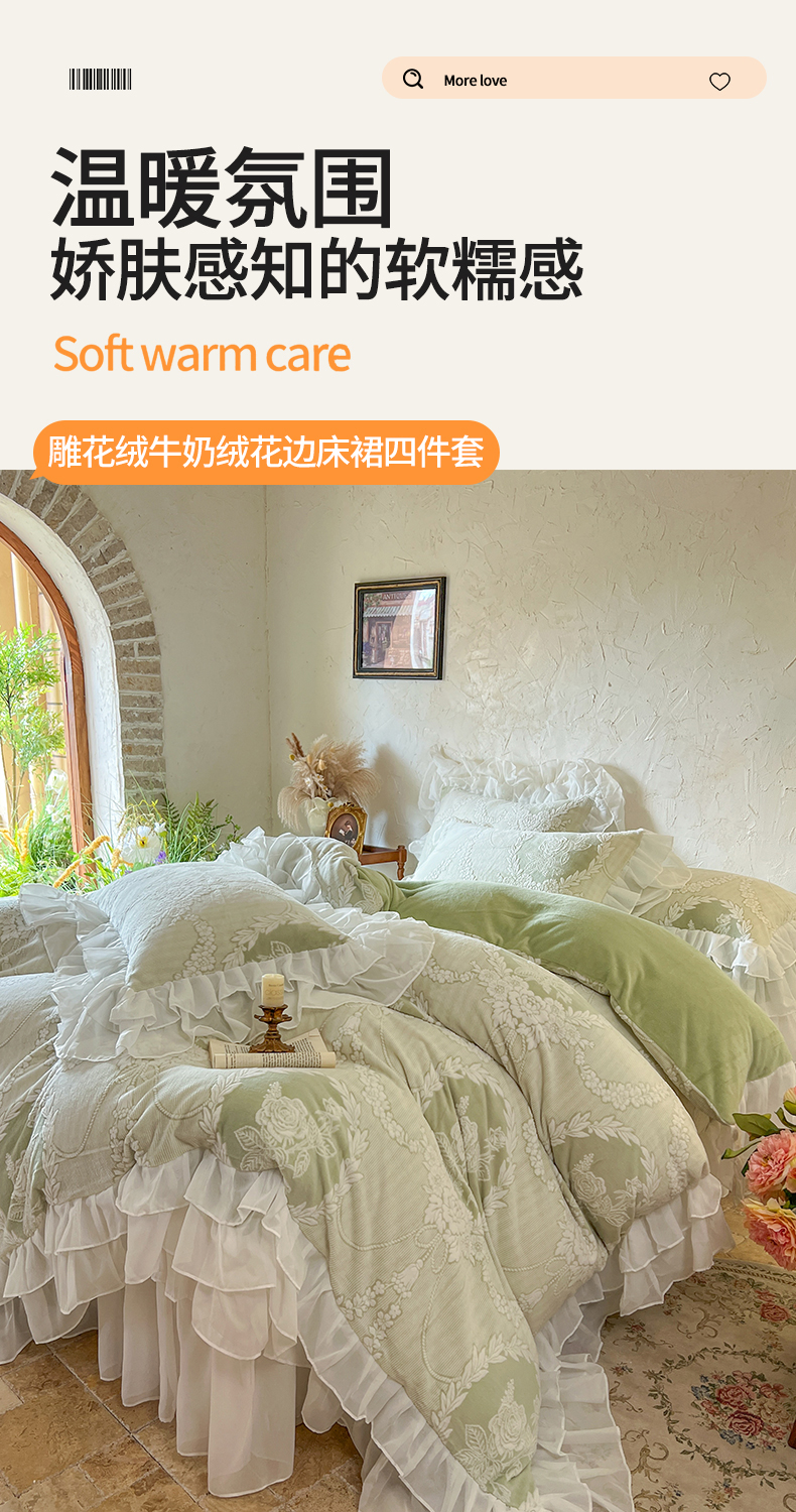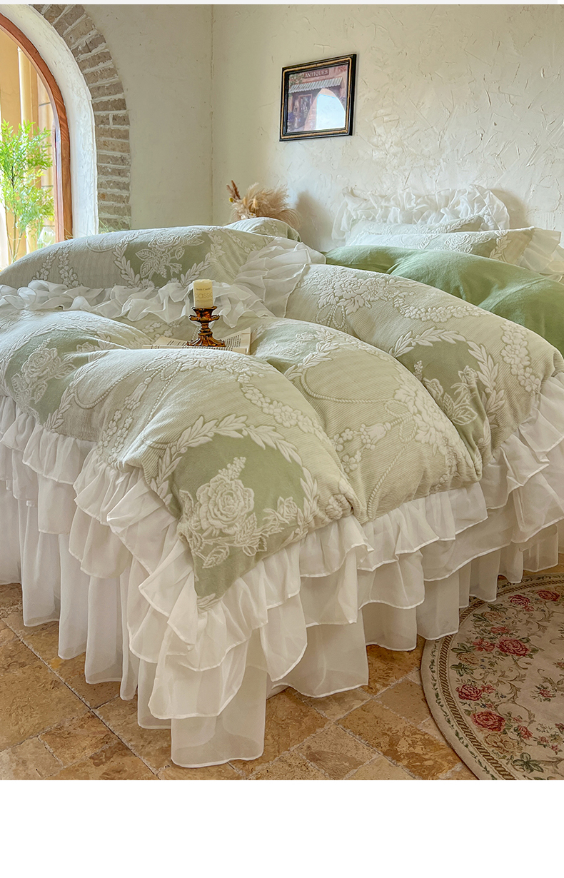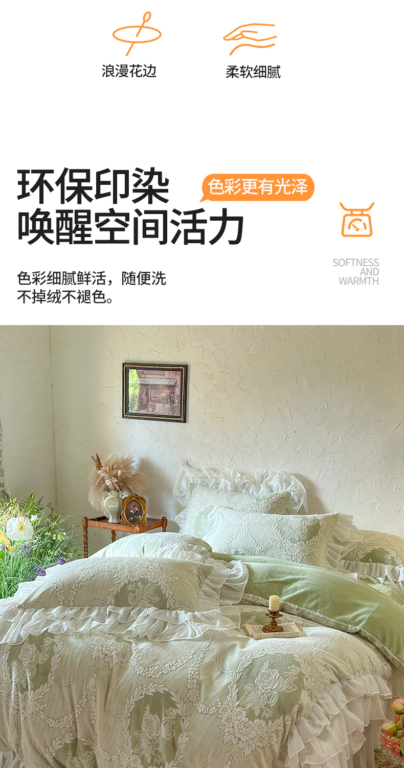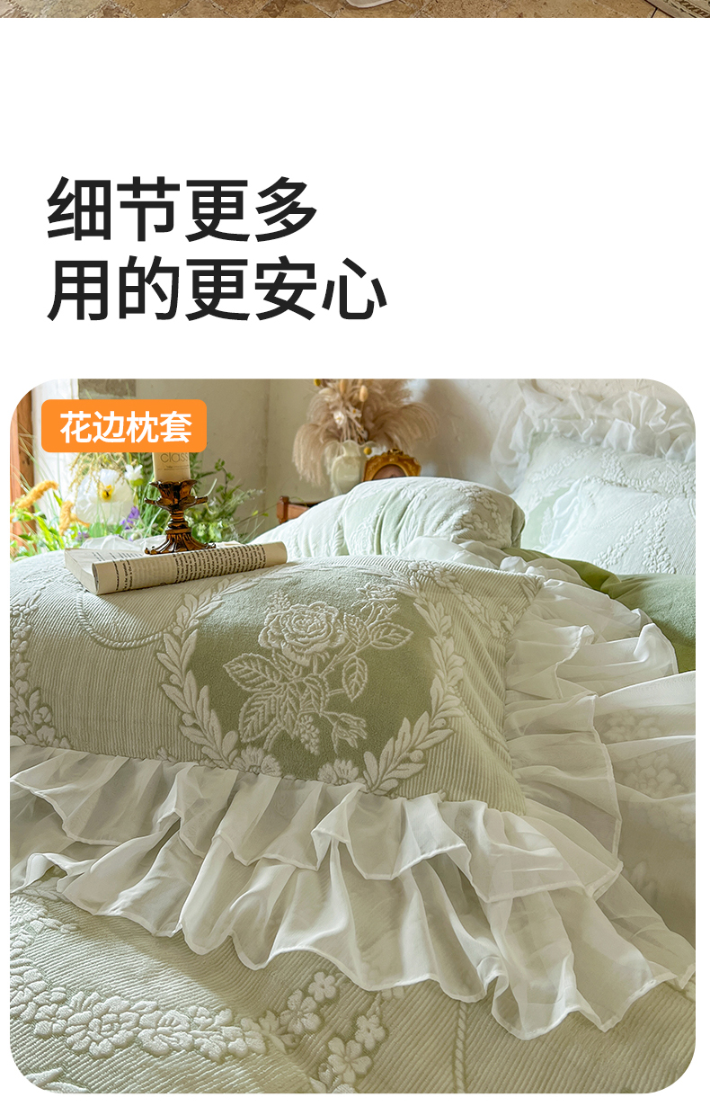 当前位置: 91家纺网 > 商品网购 > 床品套件 > 四件套 > 雕花绒四件套 > 网红馆(ck家纺) 2025新款雕花绒床裙四件套--舒芙蕾 舒芙蕾-浅绿