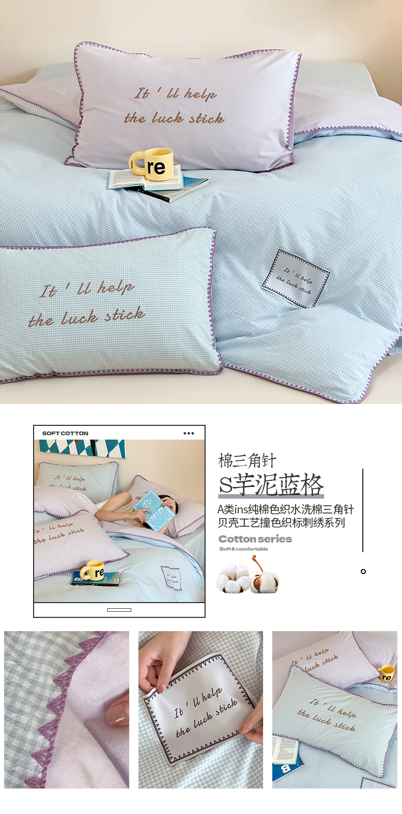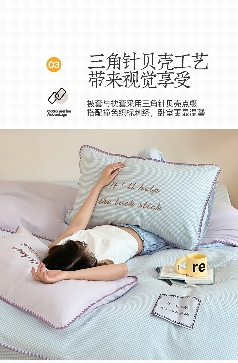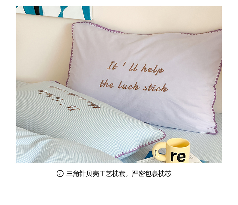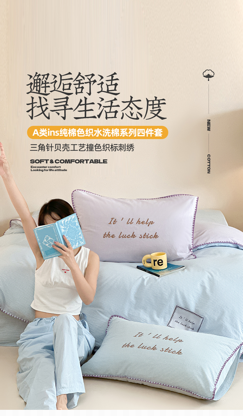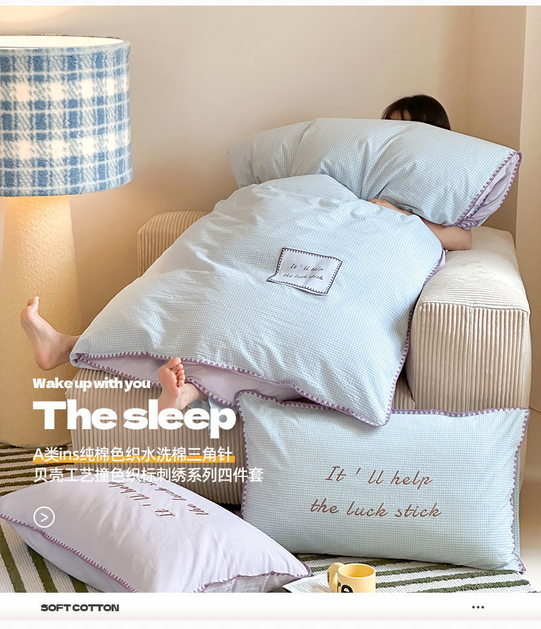 当前位置: 91家纺网 > 商品网购 > 床品套件 > 四件套 > 水洗棉四件套 > 桃子家居 2025新款A类ins纯棉色织水洗棉三角针贝壳工艺撞色织标刺绣系列四件套 棉三角针-S芋泥蓝格