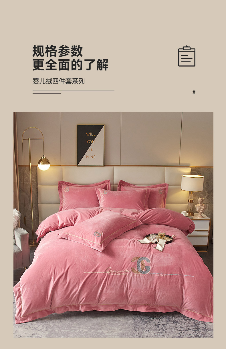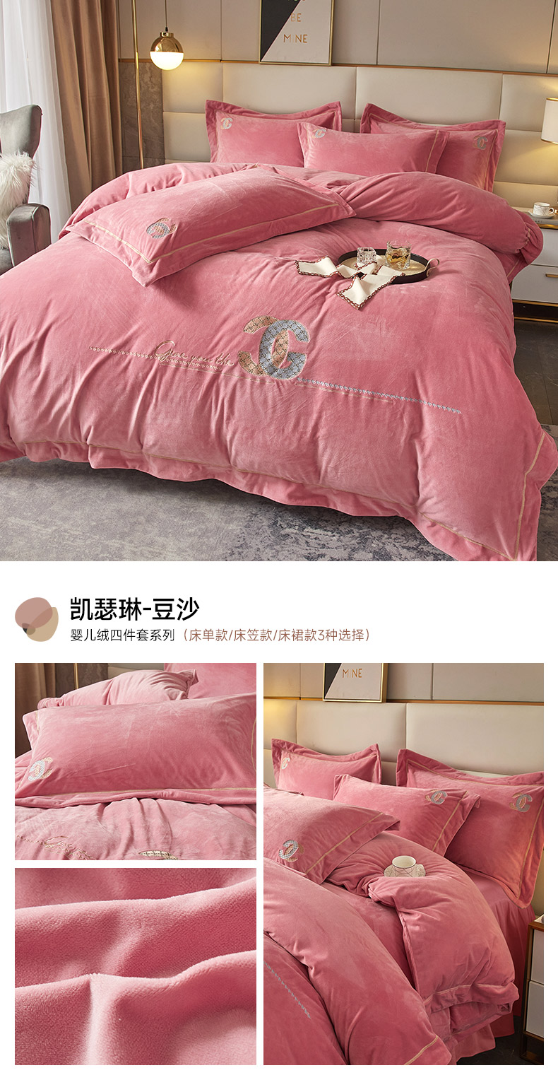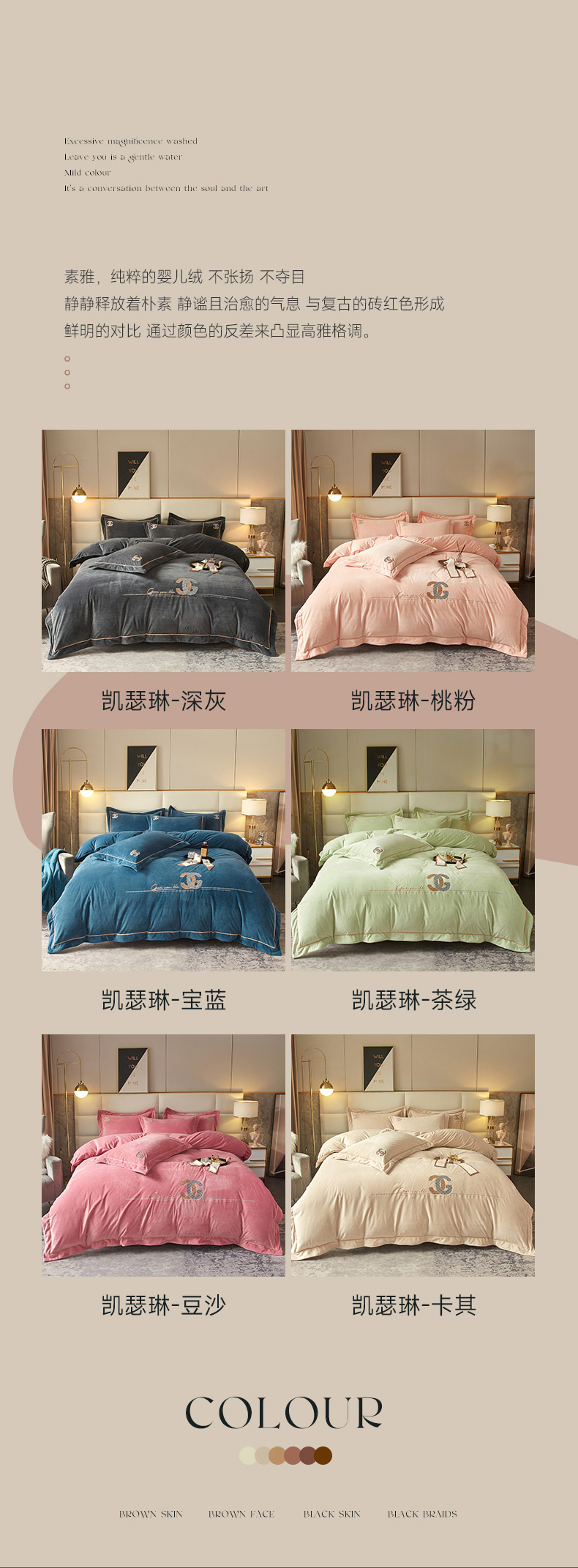当前位置: 91家纺网 > 商品网购 > 床品套件 > 四件套 > 其它四件套 > 库里梦家纺 2024新款A类宽边婴儿绒刺绣四件套-凯瑟琳 凯瑟琳-豆沙