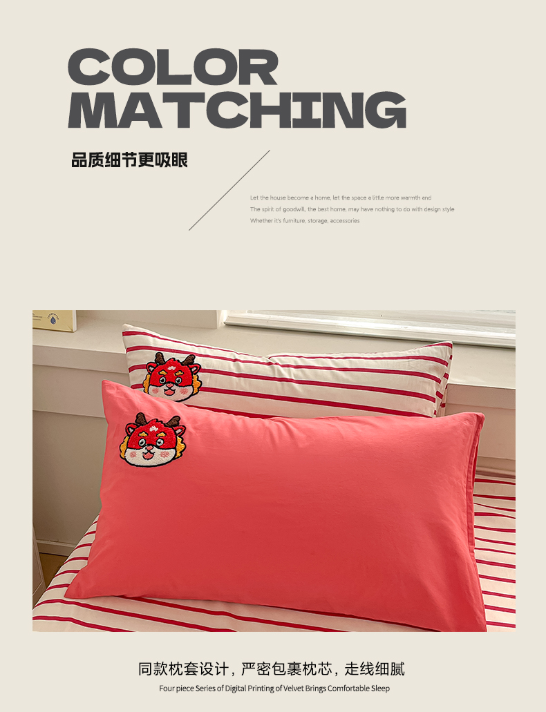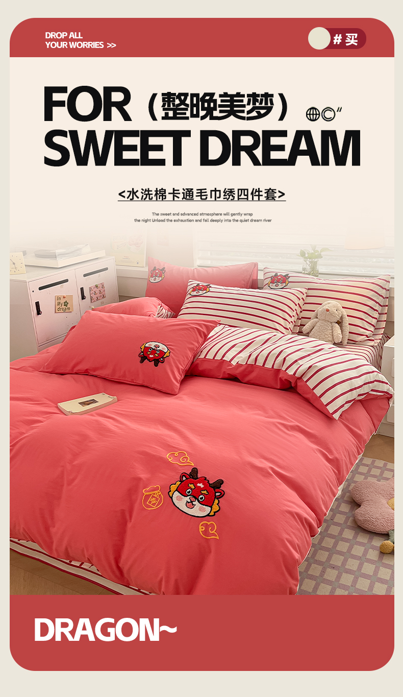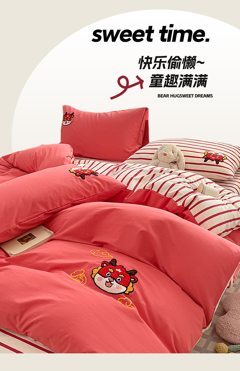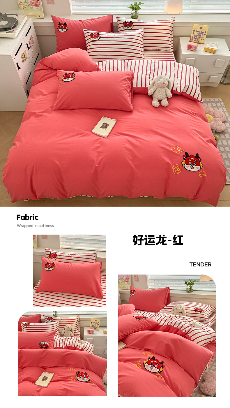 商品名称:雅居纺家纺 2025新款全棉水洗棉绣花四件套 好运龙-红