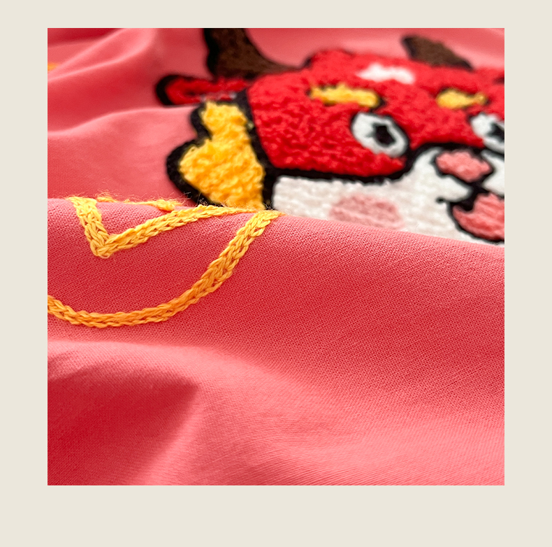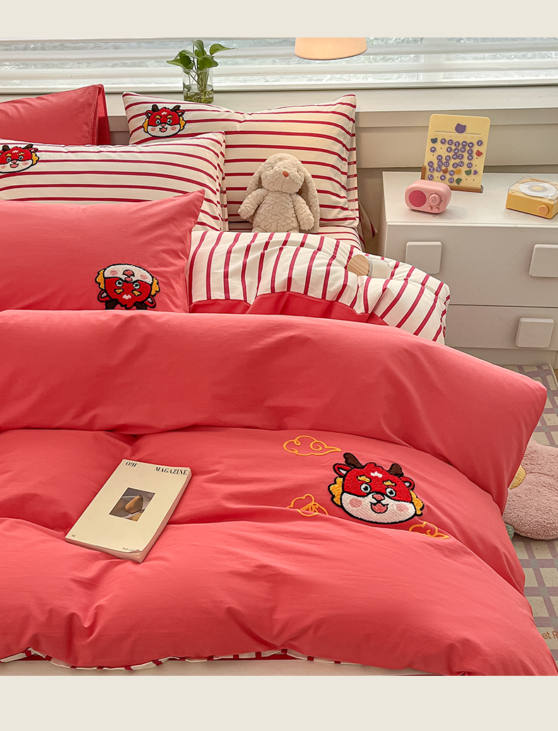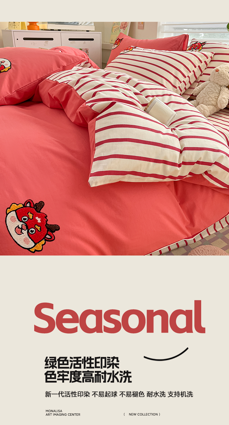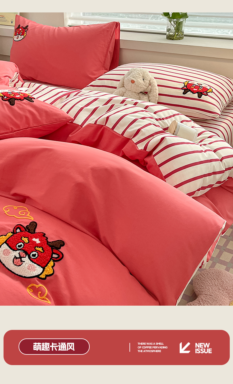 雅居纺家纺 2025新款全棉水洗棉绣花四件套 好运龙-红