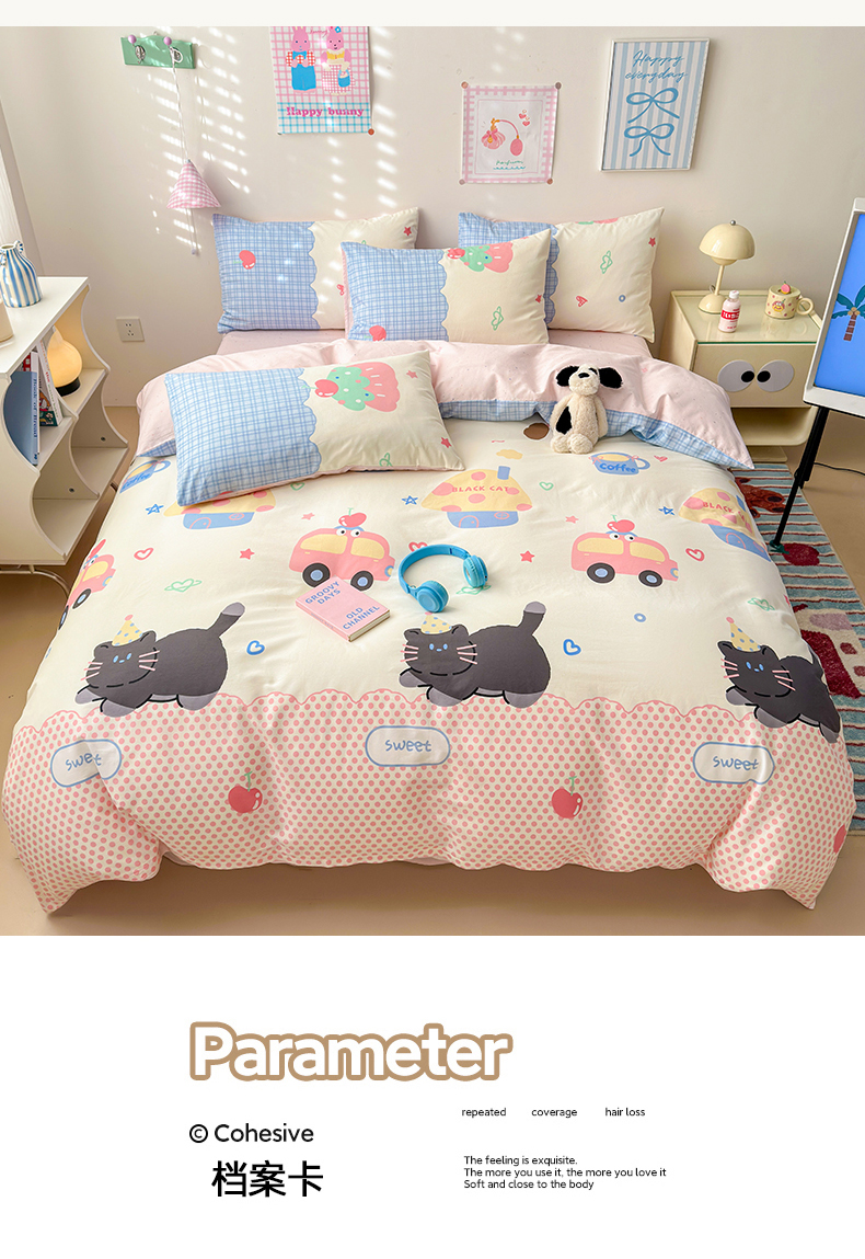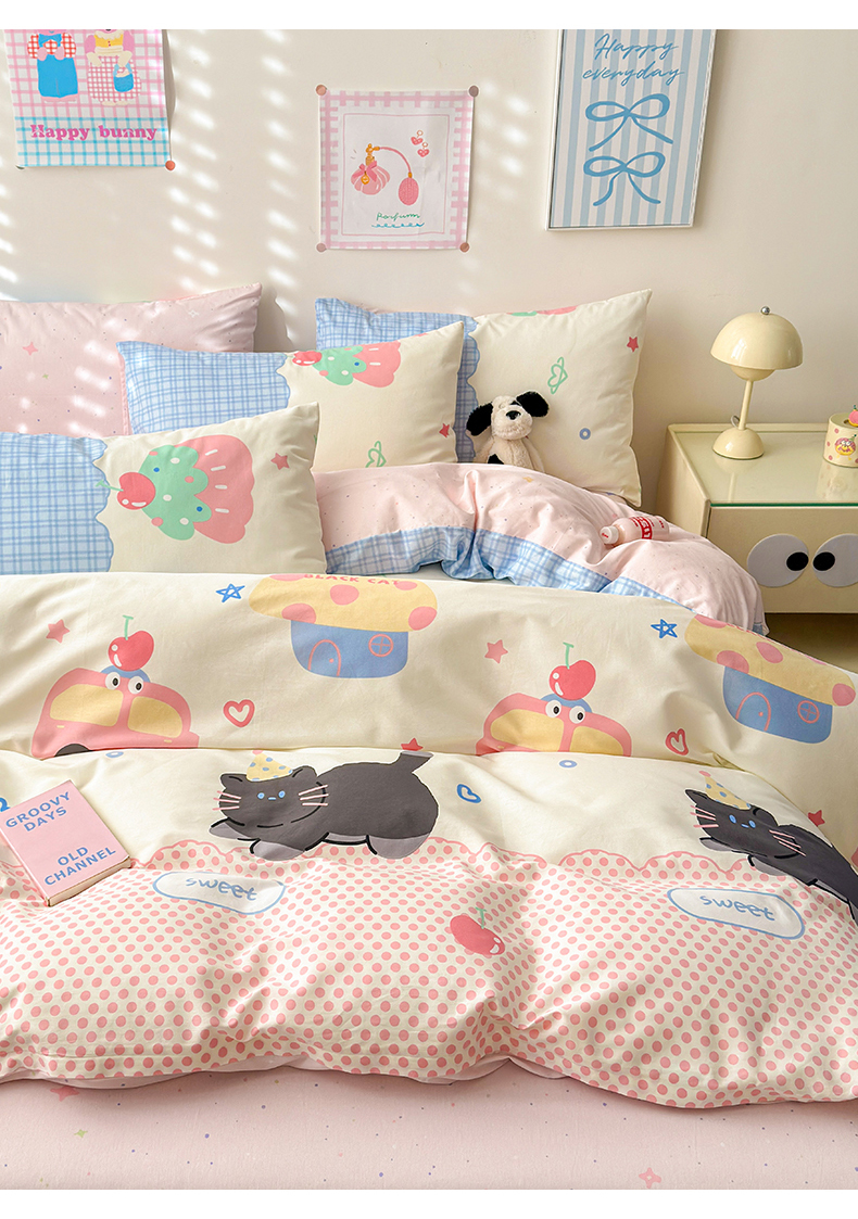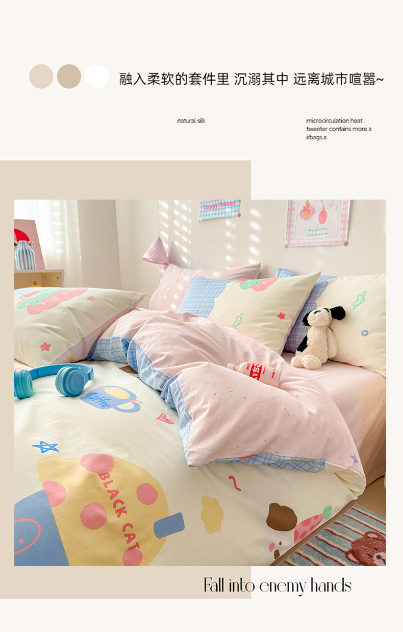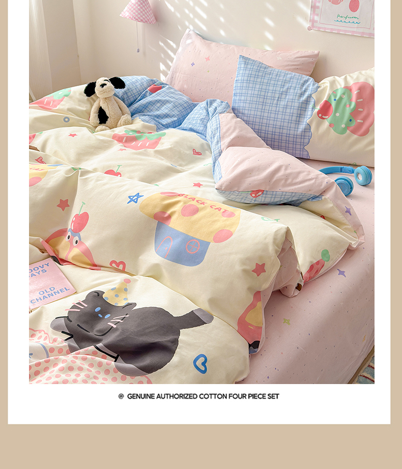 (总)曼之夏 2025新款全棉纯棉40支学生季卡通印花四件套,椰蓝小腊肠,茶茶狗,格子猫,嗨皮狗,开心屋,可爱多,可可汪,玛奇朵,奶昔小熊,泡芙小象,曲奇小狗,趣味熊,甜甜圈,甜心猫咪,童画,小狗日记,樱桃熊仔