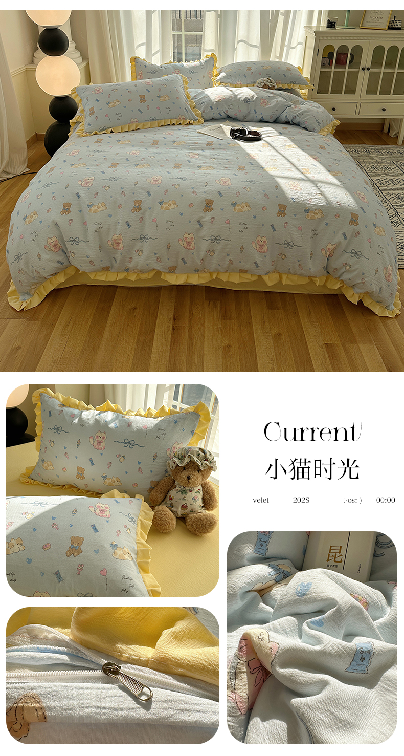 商品名称:韩都2025黑花边双层纱水洗针织棉韩版公主风四件套 小猫时光