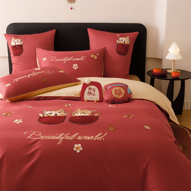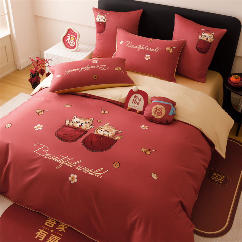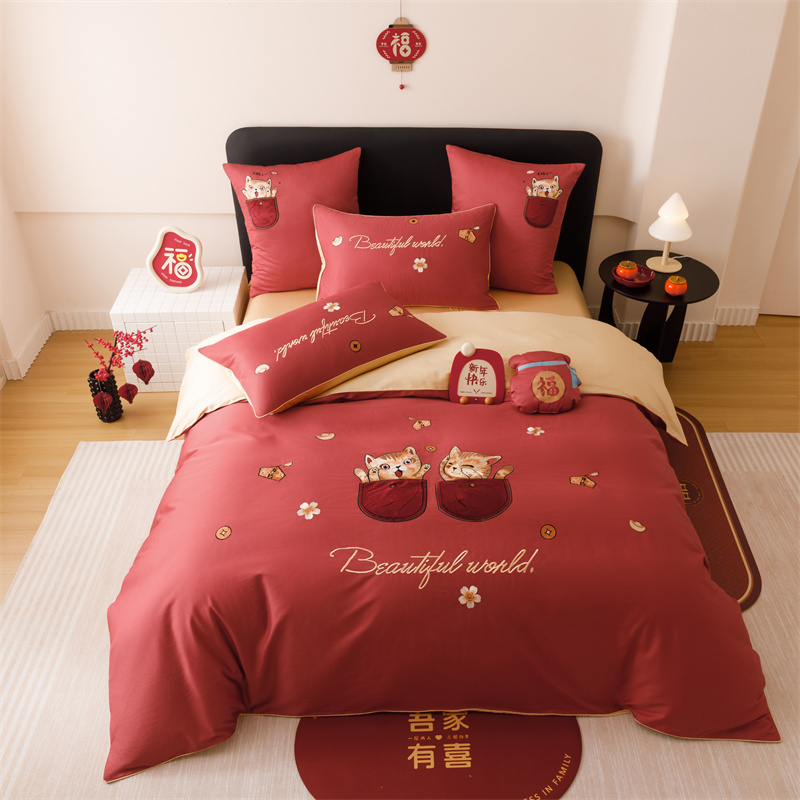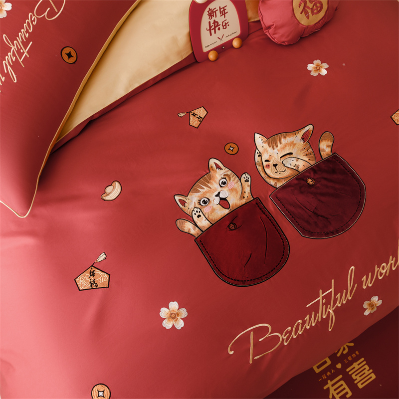 (总)星野 2025新款双股澳棉刺绣贴布绣四件套-招财猫
