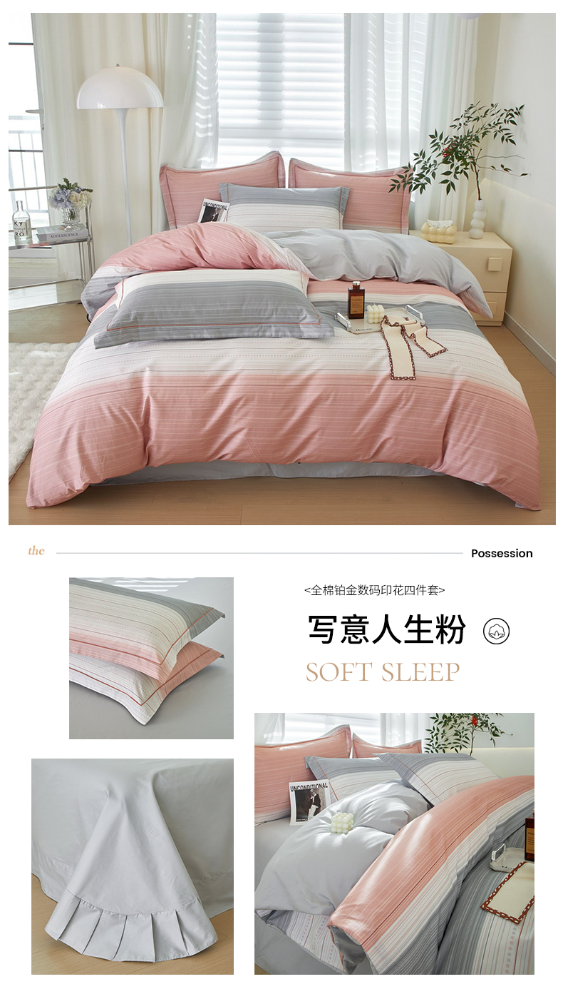 启航家居 2025春夏全棉铂金棉数码印花四件套 写意人生粉