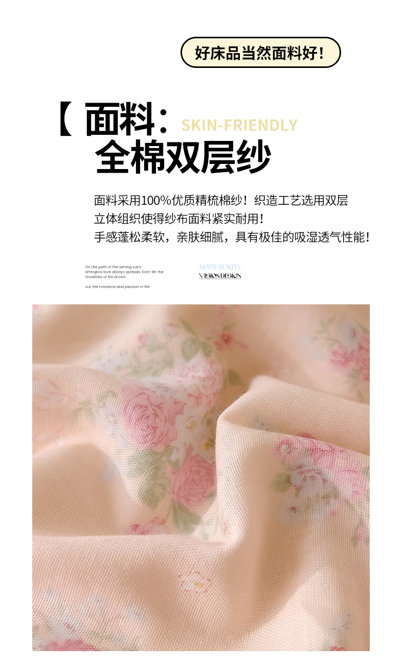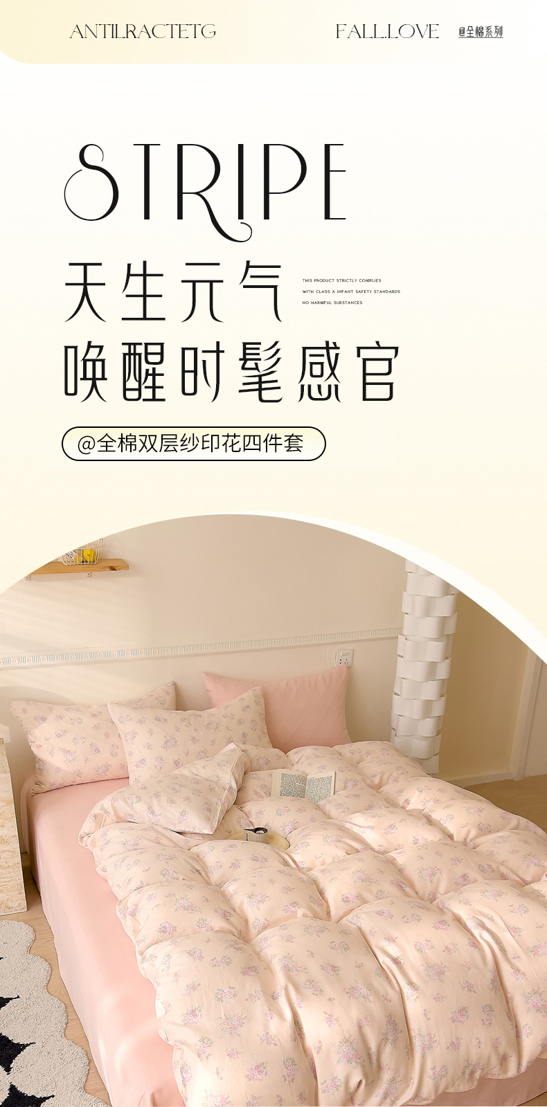 当前位置: 91家纺网 > 商品网购 > 床品套件 > 四件套 > 全棉普通四件套 > DoDo 兜兜 2025新款全棉双层纱印花四件套(可定做尺寸) 倾心-玉