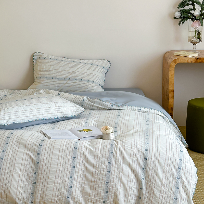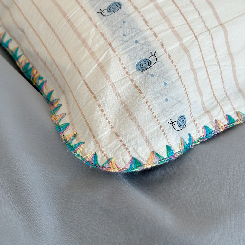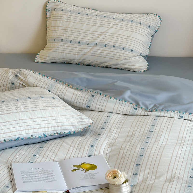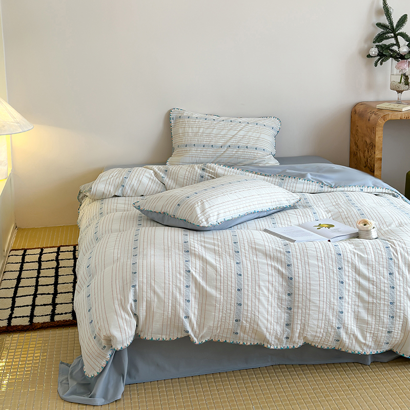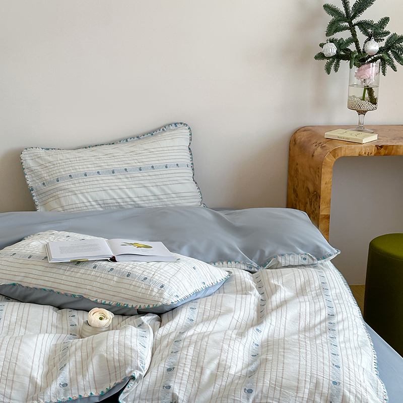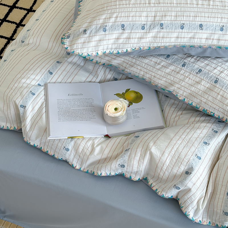 觅糖家纺 2025新款色织提花贝壳边三角针系列四件套 蓝色蜗牛