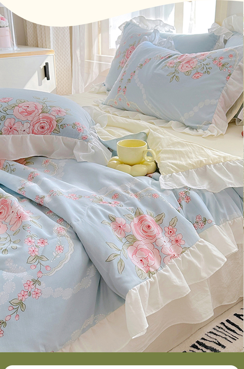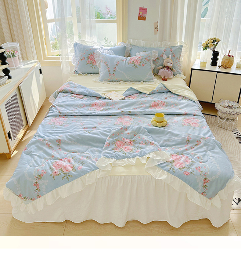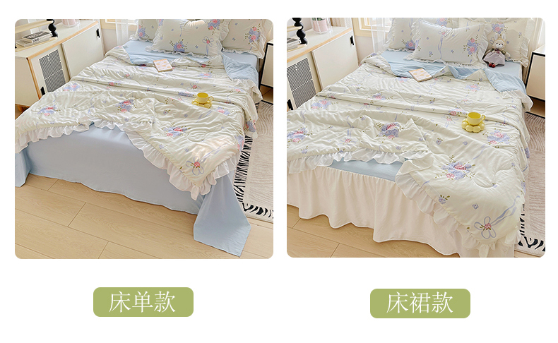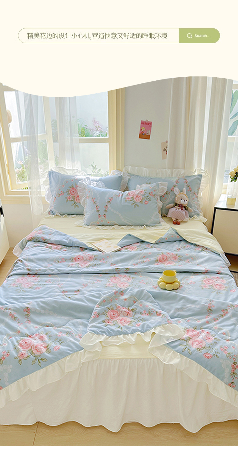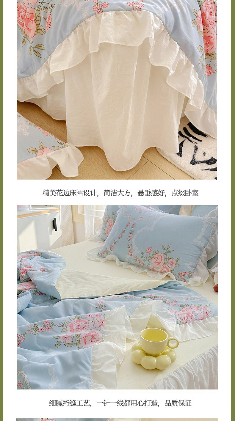 • 91家纺网 家纺一手货源 找家纺 家贝爱 2025新款泡泡纱水洗棉花边床单/床裙款夏被四件套夏凉被 花海蓝