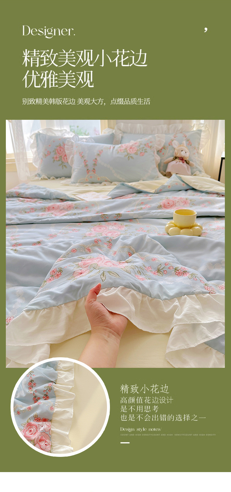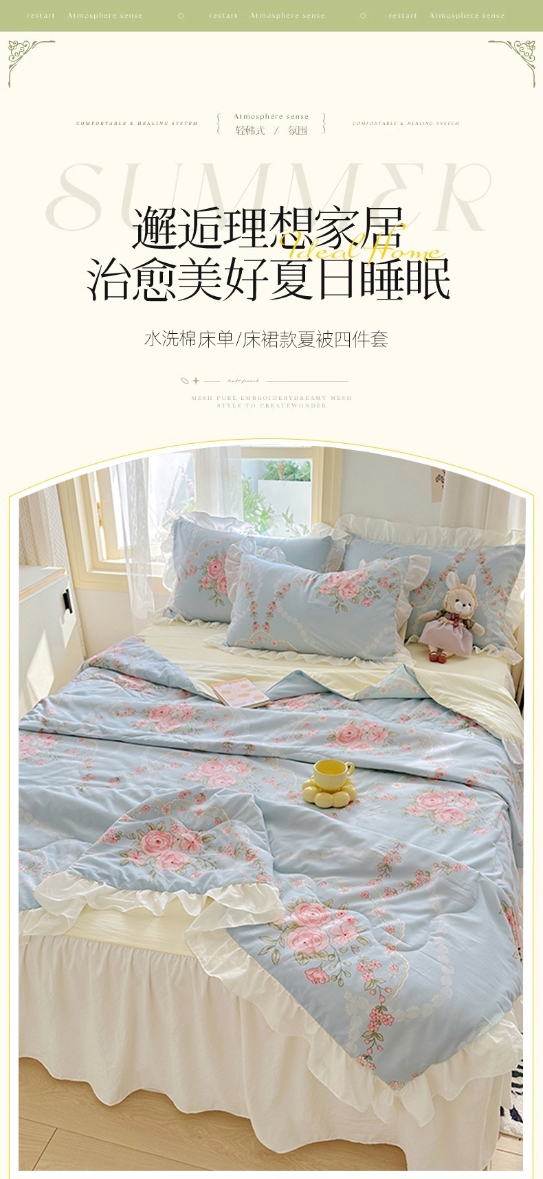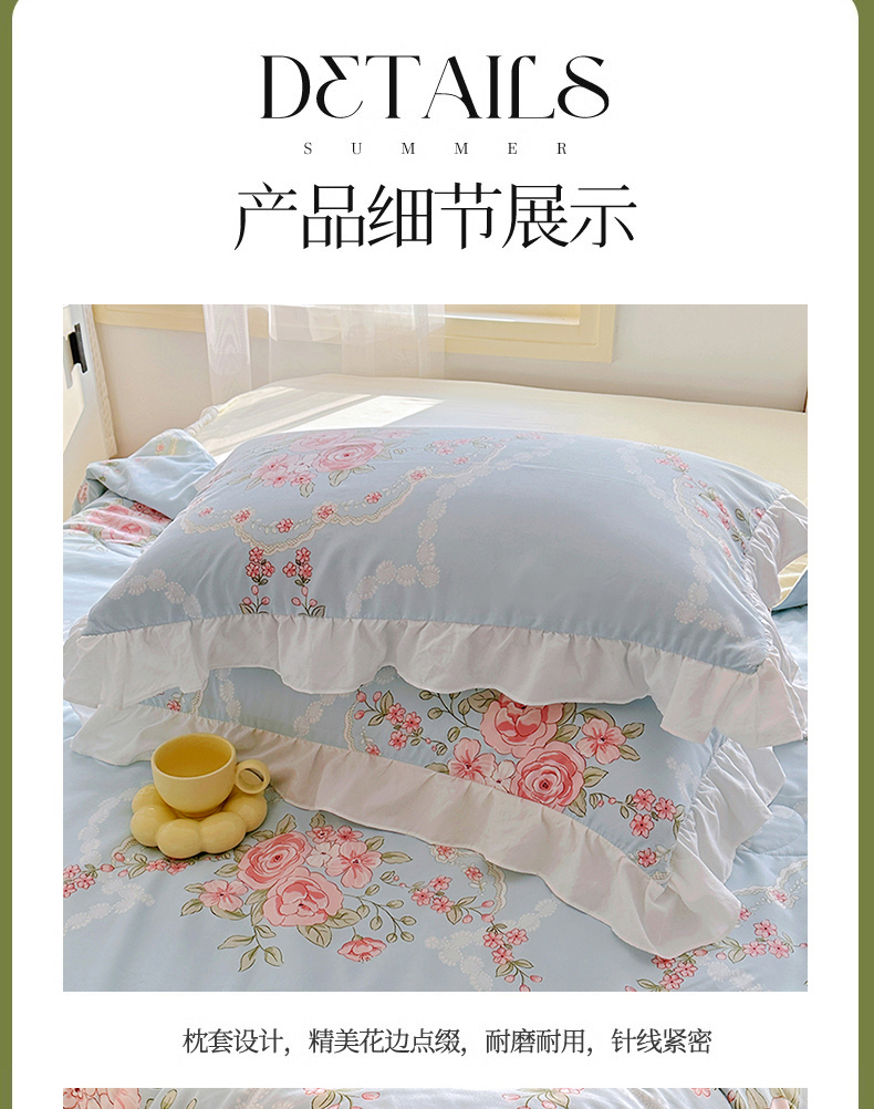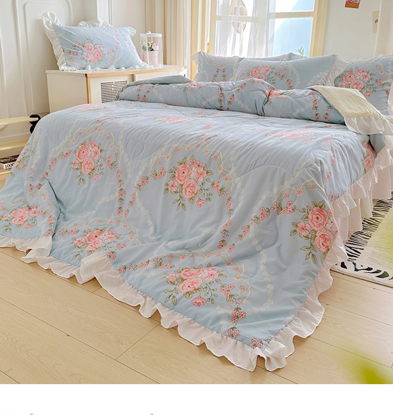 • 91家纺网 家纺一手货源 找家纺 家贝爱 2025新款泡泡纱水洗棉花边床单/床裙款夏被四件套夏凉被 花海蓝