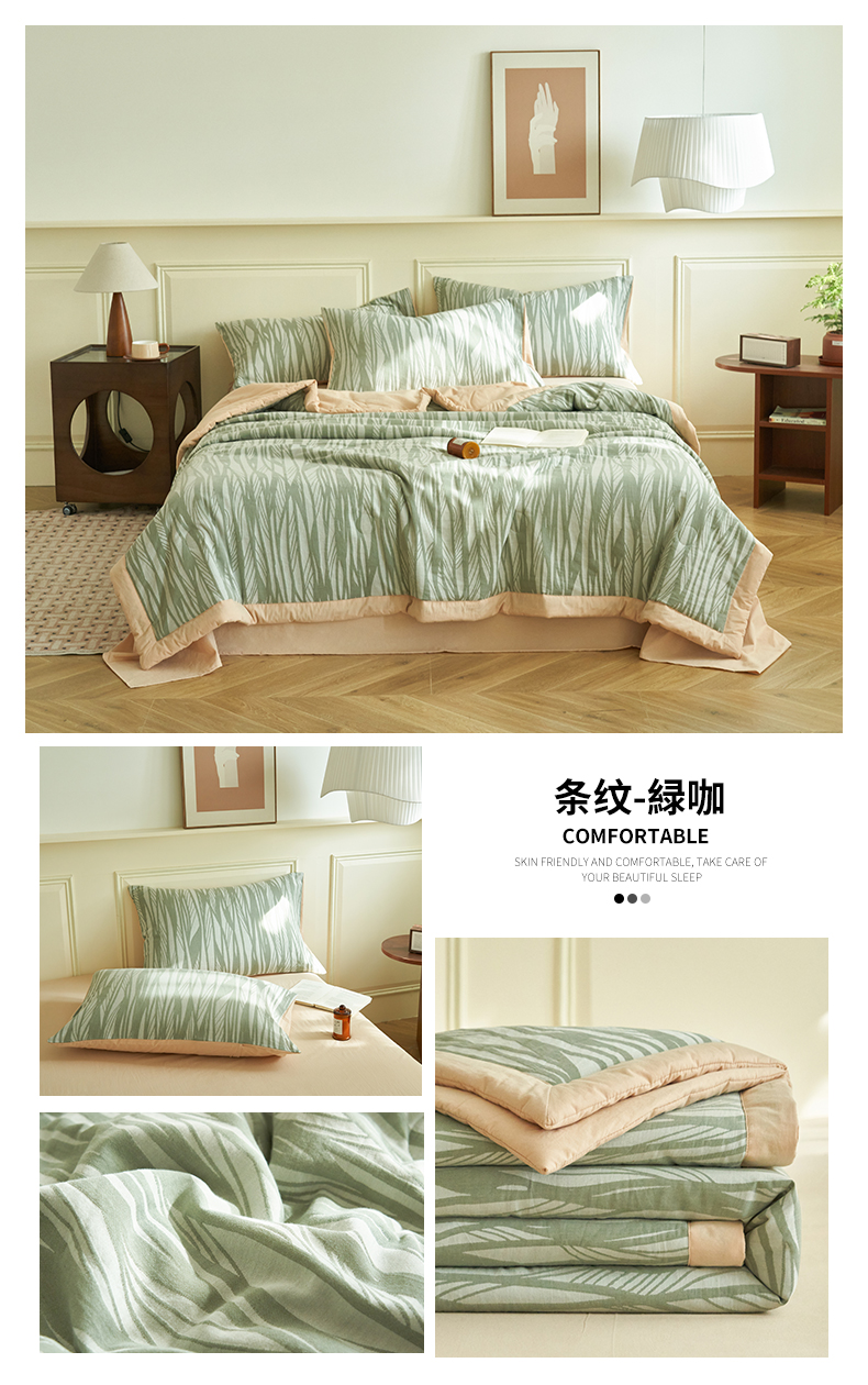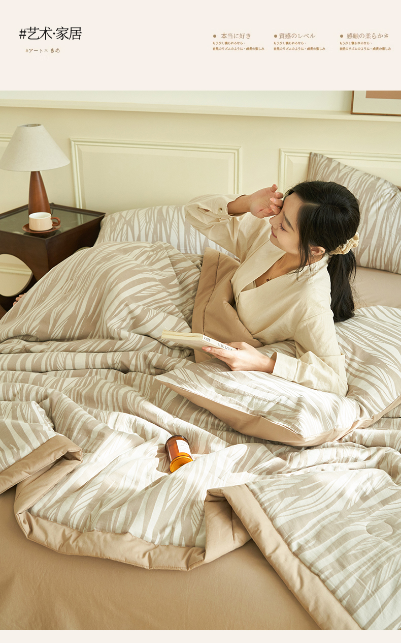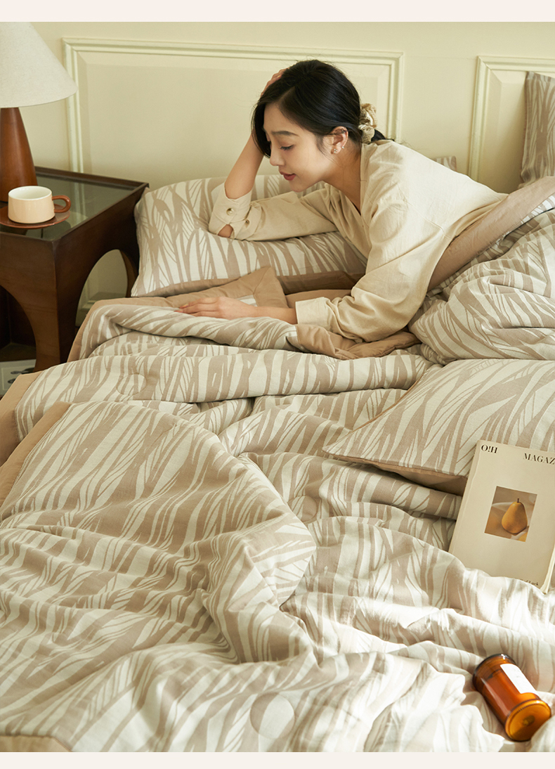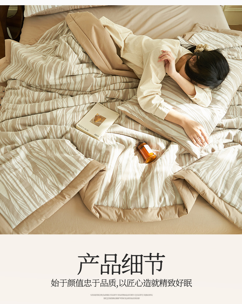 当前位置: 91家纺网 > 商品网购 > 床品套件 > 四件套 > 全棉普通四件套 > 金鹰 2025新款A类纯棉提花水洗棉全棉空调被大豆夏被四件套 条纹-浅咖
